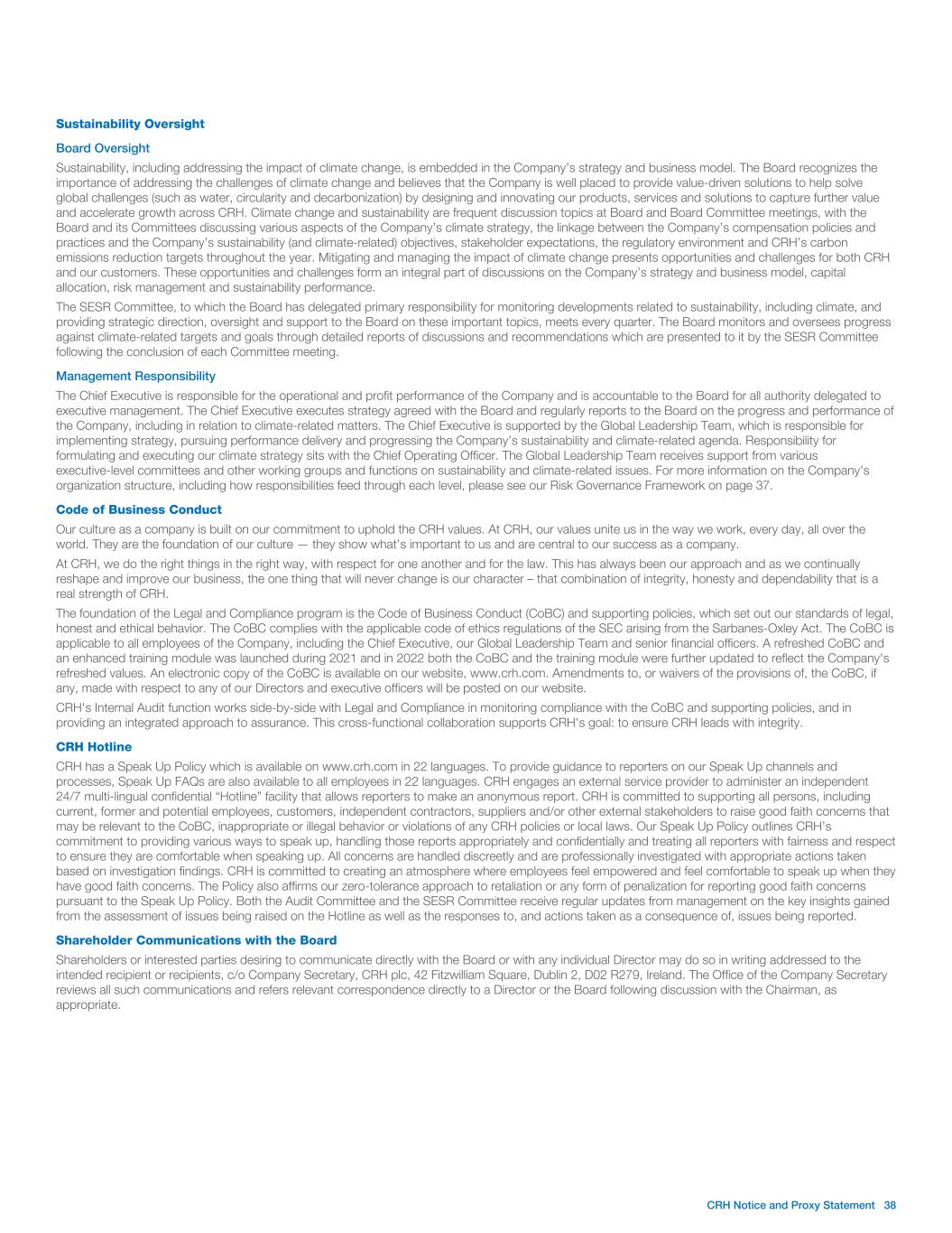 Sustainability Oversight Board Oversight Sustainability, including addressing the impact of climate change, is embedded in the Company’s strategy and business model. The Board recognizes the importance of addressing the challenges of climate change and believes that the Company is well placed to provide value-driven solutions to help solve global challenges (such as water, circularity and decarbonization) by designing and innovating our products, services and solutions to capture further value and accelerate growth across CRH. Climate change and sustainability are frequent discussion topics at Board and Board Committee meetings, with the Board and its Committees discussing various aspects of the Company’s climate strategy, the linkage between the Company’s compensation policies and practices and the Company’s sustainability (and climate-related) objectives, stakeholder expectations, the regulatory environment and CRH’s carbon emissions reduction targets throughout the year. Mitigating and managing the impact of climate change presents opportunities and challenges for both CRH and our customers. These opportunities and challenges form an integral part of discussions on the Company’s strategy and business model, capital allocation, risk management and sustainability performance. The SESR Committee, to which the Board has delegated primary responsibility for monitoring developments related to sustainability, including climate, and providing strategic direction, oversight and support to the Board on these important topics, meets every quarter. The Board monitors and oversees progress against climate-related targets and goals through detailed reports of discussions and recommendations which are presented to it by the SESR Committee following the conclusion of each Committee meeting. Management Responsibility The Chief Executive is responsible for the operational and profit performance of the Company and is accountable to the Board for all authority delegated to executive management. The Chief Executive executes strategy agreed with the Board and regularly reports to the Board on the progress and performance of the Company, including in relation to climate-related matters. The Chief Executive is supported by the Global Leadership Team, which is responsible for implementing strategy, pursuing performance delivery and progressing the Company’s sustainability and climate-related agenda. Responsibility for formulating and executing our climate strategy sits with the Chief Operating Officer. The Global Leadership Team receives support from various executive-level committees and other working groups and functions on sustainability and climate-related issues. For more information on the Company's organization structure, including how responsibilities feed through each level, please see our Risk Governance Framework on page 37. Code of Business Conduct Our culture as a company is built on our commitment to uphold the CRH values. At CRH, our values unite us in the way we work, every day, all over the world. They are the foundation of our culture — they show what’s important to us and are central to our success as a company. At CRH, we do the right things in the right way, with respect for one another and for the law. This has always been our approach and as we continually reshape and improve our business, the one thing that will never change is our character – that combination of integrity, honesty and dependability that is a real strength of CRH. The foundation of the Legal and Compliance program is the Code of Business Conduct (CoBC) and supporting policies, which set out our standards of legal, honest and ethical behavior. The CoBC complies with the applicable code of ethics regulations of the SEC arising from the Sarbanes-Oxley Act. The CoBC is applicable to all employees of the Company, including the Chief Executive, our Global Leadership Team and senior financial officers. A refreshed CoBC and an enhanced training module was launched during 2021 and in 2022 both the CoBC and the training module were further updated to reflect the Company's refreshed values. An electronic copy of the CoBC is available on our website, www.crh.com. Amendments to, or waivers of the provisions of, the CoBC, if any, made with respect to any of our Directors and executive officers will be posted on our website. CRH's Internal Audit function works side-by-side with Legal and Compliance in monitoring compliance with the CoBC and supporting policies, and in providing an integrated approach to assurance. This cross-functional collaboration supports CRH's goal: to ensure CRH leads with integrity. CRH Hotline CRH has a Speak Up Policy which is available on www.crh.com in 22 languages. To provide guidance to reporters on our Speak Up channels and processes, Speak Up FAQs are also available to all employees in 22 languages. CRH engages an external service provider to administer an independent 24/7 multi-lingual confidential “Hotline” facility that allows reporters to make an anonymous report. CRH is committed to supporting all persons, including current, former and potential employees, customers, independent contractors, suppliers and/or other external stakeholders to raise good faith concerns that may be relevant to the CoBC, inappropriate or illegal behavior or violations of any CRH policies or local laws. Our Speak Up Policy outlines CRH’s commitment to providing various ways to speak up, handling those reports appropriately and confidentially and treating all reporters with fairness and respect to ensure they are comfortable when speaking up. All concerns are handled discreetly and are professionally investigated with appropriate actions taken based on investigation findings. CRH is committed to creating an atmosphere where employees feel empowered and feel comfortable to speak up when they have good faith concerns. The Policy also affirms our zero-tolerance approach to retaliation or any form of p