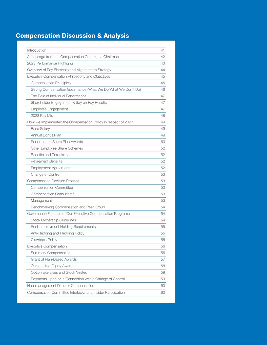 Compensation Discussion & Analysis Introduction 41 A message from the Compensation Committee Chairman 42 2023 Performance Highlights 43 Overview of Pay Elements and Alignment to Strategy 44 Executive Compensation Philosophy and Objectives 45 Compensation Principles 45 Strong Compensation Governance (What We Do/What We Don’t Do) 46 The Role of Individual Performance 47 Shareholder Engagement & Say on Pay Results 47 Employee Engagement 47 2023 Pay Mix 48 How we Implemented the Compensation Policy in respect of 2023 49 Base Salary 49 Annual Bonus Plan 49 Performance Share Plan Awards 50 Other Employee Share Schemes 52 Benefits and Perquisites 52 Retirement Benefits 52 Employment Agreements 52 Change of Control 53 Compensation Decision Process 53 Compensation Committee 53 Compensation Consultants 53 Management 53 Benchmarking Compensation and Peer Group 54 Governance Features of Our Executive Compensation Programs 54 Stock Ownership Guidelines 54 Post-employment Holding Requirements 55 Anti-Hedging and Pledging Policy 55 Clawback Policy 55 Executive Compensation 56 Summary Compensation 56 Grant of Plan-Based Awards 57 Outstanding Equity Awards 58 Option Exercises and Stock Vested 59 Payments Upon or in Connection with a Change of Control 59 Non-management Director Compensation 60 Compensation Committee Interlocks and Insider Participation 60 CRH Notice and Proxy Statement 40