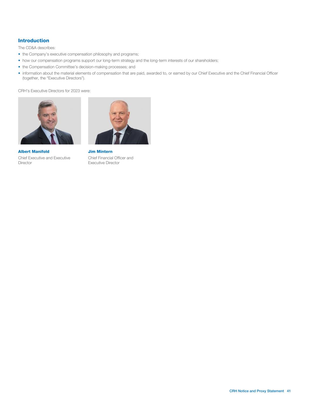 Introduction The CD&A describes: • the Company’s executive compensation philosophy and programs; • how our compensation programs support our long-term strategy and the long-term interests of our shareholders; • the Compensation Committee’s decision-making processes; and • information about the material elements of compensation that are paid, awarded to, or earned by our Chief Executive and the Chief Financial Officer (together, the “Executive Directors”). CRH’s Executive Directors for 2023 were: Albert Manifold Chief Executive and Executive Director Jim Mintern Chief Financial Officer and Executive Director CRH Notice and Proxy Statement 41