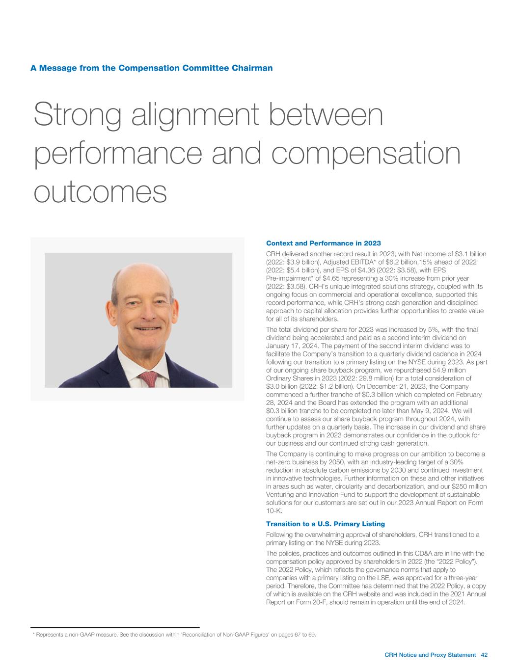 A Message from the Compensation Committee Chairman Context and Performance in 2023 CRH delivered another record result in 2023, with Net Income of $3.1 billion (2022: $3.9 billion), Adjusted EBITDA*7of $6.2 billion,15% ahead of 2022 (2022: $5.4 billion), and EPS of $4.36 (2022: $3.58), with EPS Pre-impairment* of $4.65 representing a 30% increase from prior year (2022: $3.58). CRH’s unique integrated solutions strategy, coupled with its ongoing focus on commercial and operational excellence, supported this record performance, while CRH’s strong cash generation and disciplined approach to capital allocation provides further opportunities to create value for all of its shareholders. The total dividend per share for 2023 was increased by 5%, with the final dividend being accelerated and paid as a second interim dividend on January 17, 2024. The payment of the second interim dividend was to facilitate the Company’s transition to a quarterly dividend cadence in 2024 following our transition to a primary listing on the NYSE during 2023. As part of our ongoing share buyback program, we repurchased 54.9 million Ordinary Shares in 2023 (2022: 29.8 million) for a total consideration of $3.0 billion (2022: $1.2 billion). On December 21, 2023, the Company commenced a further tranche of $0.3 billion which completed on February 28, 2024 and the Board has extended the program with an additional $0.3 billion tranche to be completed no later than May 9, 2024. We will continue to assess our share buyback program throughout 2024, with further updates on a quarterly basis. The increase in our dividend and share buyback program in 2023 demonstrates our confidence in the outlook for our business and our continued strong cash generation. The Company is continuing to make progress on our ambition to become a net‐zero business by 2050, with an industry-leading target of a 30% reduction in absolute carbon emissions by 2030 and continued investment in innovative technologies. Further information on these and other initiatives in areas such as water, circularity and decarbonization, and our $250 million Venturing and Innovation Fund to support the development of sustainable solutions for our customers are set out in our 2023 Annual Report on Form 10-K. Transition to a U.S. Primary Listing Following the overwhelming approval of shareholders, CRH transitioned to a primary listing on the NYSE during 2023. The policies, practices and outcomes outlined in this CD&A are in line with the compensation policy approved by shareholders in 2022 (the “2022 Policy”). The 2022 Policy, which reflects the governance norms that apply to companies with a primary listing on the LSE, was approved for a three-year period. Therefore, the Committee has determined that the 2022 Policy, a copy of which is available on the CRH website and was included in the 2021 Annual Report on Form 20-F, should remain in operation until the end of 2024. CRH Notice and Proxy Statement 42 7* Represents a non-GAAP measure. See the discussion within 'Reconciliation of Non-GAAP Figures' on pages 67 to 69. Strong alignment between performance and compensation outcomes