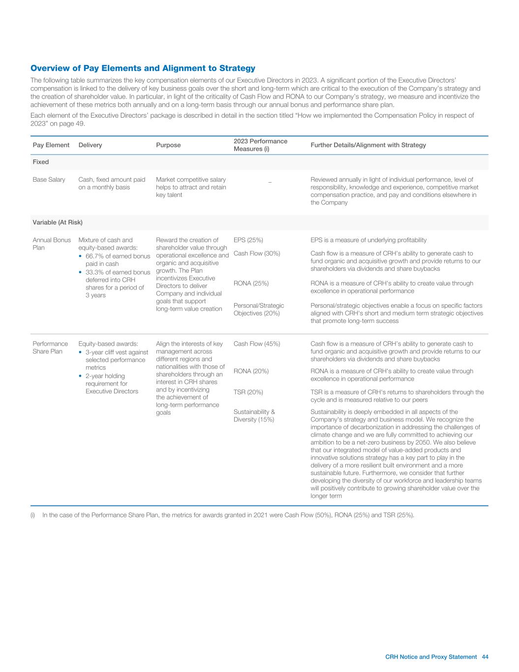 Overview of Pay Elements and Alignment to Strategy The following table summarizes the key compensation elements of our Executive Directors in 2023. A significant portion of the Executive Directors’ compensation is linked to the delivery of key business goals over the short and long-term which are critical to the execution of the Company’s strategy and the creation of shareholder value. In particular, in light of the criticality of Cash Flow and RONA to our Company’s strategy, we measure and incentivize the achievement of these metrics both annually and on a long-term basis through our annual bonus and performance share plan. Each element of the Executive Directors’ package is described in detail in the section titled “How we implemented the Compensation Policy in respect of 2023” on page 49. Pay Element Delivery Purpose 2023 Performance Measures (i) Further Details/Alignment with Strategy Fixed Base Salary Cash, fixed amount paid on a monthly basis Market competitive salary helps to attract and retain key talent _ Reviewed annually in light of individual performance, level of responsibility, knowledge and experience, competitive market compensation practice, and pay and conditions elsewhere in the Company Variable (At Risk) Annual Bonus Plan Mixture of cash and equity-based awards: • 66.7% of earned bonus paid in cash • 33.3% of earned bonus deferred into CRH shares for a period of 3 years Reward the creation of shareholder value through operational excellence and organic and acquisitive growth. The Plan incentivizes Executive Directors to deliver Company and individual goals that support long-term value creation EPS (25%) EPS is a measure of underlying profitability Cash Flow (30%) Cash flow is a measure of CRH’s ability to generate cash to fund organic and acquisitive growth and provide returns to our shareholders via dividends and share buybacks RONA (25%) RONA is a measure of CRH's ability to create value through excellence in operational performance Personal/Strategic Objectives (20%) Personal/strategic objectives enable a focus on specific factors aligned with CRH's short and medium term strategic objectives that promote long-term success Performance Share Plan Equity-based awards: • 3-year cliff vest against selected performance metrics • 2-year holding requirement for Executive Directors Align the interests of key management across different regions and nationalities with those of shareholders through an interest in CRH shares and by incentivizing the achievement of long-term performance goals Cash Flow (45%) Cash flow is a measure of CRH’s ability to generate cash to fund organic and acquisitive growth and provide returns to our shareholders via dividends and share buybacks RONA (20%) RONA is a measure of CRH's ability to create value through excellence in operational performance TSR (20%) TSR is a measure of CRH's returns to shareholders through the cycle and is measured relative to our peers Sustainability & Diversity (15%) Sustainability is deeply embedded in all aspects of the Company's strategy and business model. We recognize the importance of decarbonization in addressing the challenges of climate change and we are fully committed to achieving our ambition to be a net-zero business by 2050. We also believe that our integrated model of value-added products and innovative solutions strategy has a key part to play in the delivery of a more resilient built environment and a more sustainable future. Furthermore, we consider that further developing the diversity of our workforce and leadership teams will positively contribute to growing shareholder value over the longer term (i) In the case of the Performance Share Plan, the metrics for awards granted in 2021 were Cash Flow (50%), RONA (25%) and TSR (25%). CRH Notice and Proxy Statement 44