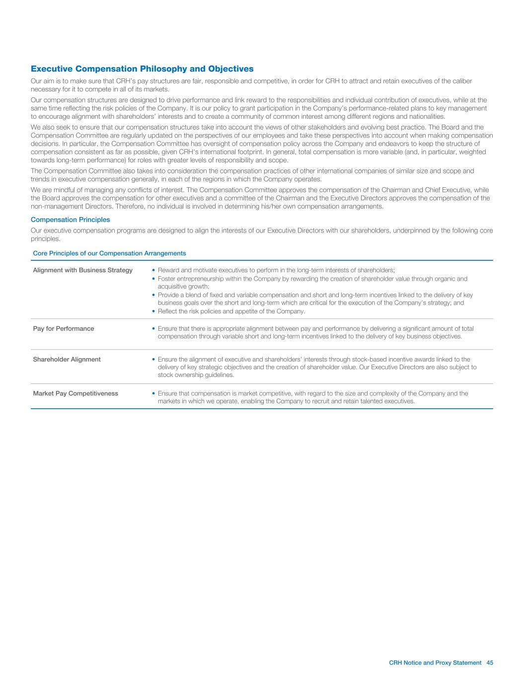 Executive Compensation Philosophy and Objectives Our aim is to make sure that CRH’s pay structures are fair, responsible and competitive, in order for CRH to attract and retain executives of the caliber necessary for it to compete in all of its markets. Our compensation structures are designed to drive performance and link reward to the responsibilities and individual contribution of executives, while at the same time reflecting the risk policies of the Company. It is our policy to grant participation in the Company’s performance-related plans to key management to encourage alignment with shareholders’ interests and to create a community of common interest among different regions and nationalities. We also seek to ensure that our compensation structures take into account the views of other stakeholders and evolving best practice. The Board and the Compensation Committee are regularly updated on the perspectives of our employees and take these perspectives into account when making compensation decisions. In particular, the Compensation Committee has oversight of compensation policy across the Company and endeavors to keep the structure of compensation consistent as far as possible, given CRH's international footprint. In general, total compensation is more variable (and, in particular, weighted towards long-term performance) for roles with greater levels of responsibility and scope. The Compensation Committee also takes into consideration the compensation practices of other international companies of similar size and scope and trends in executive compensation generally, in each of the regions in which the Company operates. We are mindful of managing any conflicts of interest. The Compensation Committee approves the compensation of the Chairman and Chief Executive, while the Board approves the compensation for other executives and a committee of the Chairman and the Executive Directors approves the compensation of the non-management Directors. Therefore, no individual is involved in determining his/her own compensation arrangements. Compensation Principles Our executive compensation programs are designed to align the interests of our Executive Directors with our shareholders, underpinned by the following core principles. Core Principles of our Compensation Arrangements Alignment with Business Strategy • Reward and motivate executives to perform in the long-term interests of shareholders; • Foster entrepreneurship within the Company by rewarding the creation of shareholder value through organic and acquisitive growth; • Provide a blend of fixed and variable compensation and short and long-term incentives linked to the delivery of key business goals over the short and long-term which are critical for the execution of the Company’s strategy; and • Reflect the risk policies and appetite of the Company. Pay for Performance • Ensure that there is appropriate alignment between pay and performance by delivering a significant amount of total compensation through variable short and long-term incentives linked to the delivery of key business objectives. Shareholder Alignment • Ensure the alignment of executive and shareholders’ interests through stock-based incentive awards linked to the delivery of key strategic objectives and the creation of shareholder value. Our Executive Directors are also subject to stock ownership guidelines. Market Pay Competitiveness • Ensure that compensation is market competitive, with regard to the size and complexity of the Company and the markets in which we operate, enabling the Company to recruit and retain talented executives. CRH Notice and Proxy Statement 45