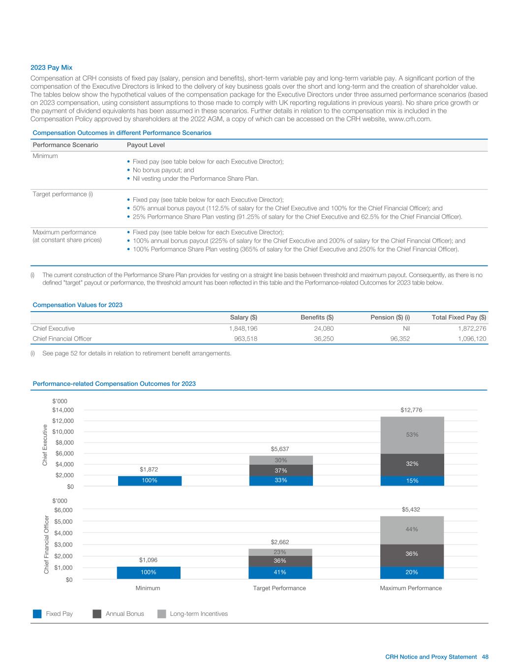 2023 Pay Mix Compensation at CRH consists of fixed pay (salary, pension and benefits), short-term variable pay and long-term variable pay. A significant portion of the compensation of the Executive Directors is linked to the delivery of key business goals over the short and long-term and the creation of shareholder value. The tables below show the hypothetical values of the compensation package for the Executive Directors under three assumed performance scenarios (based on 2023 compensation, using consistent assumptions to those made to comply with UK reporting regulations in previous years). No share price growth or the payment of dividend equivalents has been assumed in these scenarios. Further details in relation to the compensation mix is included in the Compensation Policy approved by shareholders at the 2022 AGM, a copy of which can be accessed on the CRH website, www.crh.com. Compensation Outcomes in different Performance Scenarios Performance Scenario Payout Level Minimum • Fixed pay (see table below for each Executive Director); • No bonus payout; and • Nil vesting under the Performance Share Plan. Target performance (i) • Fixed pay (see table below for each Executive Director); • 50% annual bonus payout (112.5% of salary for the Chief Executive and 100% for the Chief Financial Officer); and • 25% Performance Share Plan vesting (91.25% of salary for the Chief Executive and 62.5% for the Chief Financial Officer). Maximum performance (at constant share prices) • Fixed pay (see table below for each Executive Director); • 100% annual bonus payout (225% of salary for the Chief Executive and 200% of salary for the Chief Financial Officer); and • 100% Performance Share Plan vesting (365% of salary for the Chief Executive and 250% for the Chief Financial Officer). (i) The current construction of the Performance Share Plan provides for vesting on a straight line basis between threshold and maximum payout. Consequently, as there is no defined "target" payout or performance, the threshold amount has been reflected in this table and the Performance-related Outcomes for 2023 table below. Compensation Values for 2023 Salary ($) Benefits ($) Pension ($) (i) Total Fixed Pay ($) Chief Executive 1,848,196 24,080 Nil 1,872,276 Chief Financial Officer 963,518 36,250 96,352 1,096,120 (i) See page 52 for details in relation to retirement benefit arrangements. Performance-related Compensation Outcomes for 2023 C hi ef E xe cu tiv e $1,872 $5,637 $12,776 $0 $2,000 $4,000 $6,000 $8,000 $10,000 $12,000 $14,000 C hi ef F in an ci al O ffi ce r $1,096 $2,662 $5,432 Minimum Target Performance Maximum Performance $0 $1,000 $2,000 $3,000 $4,000 $5,000 $6,000 ■ Fixed Pay ■ Annual Bonus ■ Long-term Incentives CRH Notice and Proxy Statement 48 53% 32% 15% 30% 37% 33%100% 44% 36% 20% 23% 36% 41%100% $’000 $’000