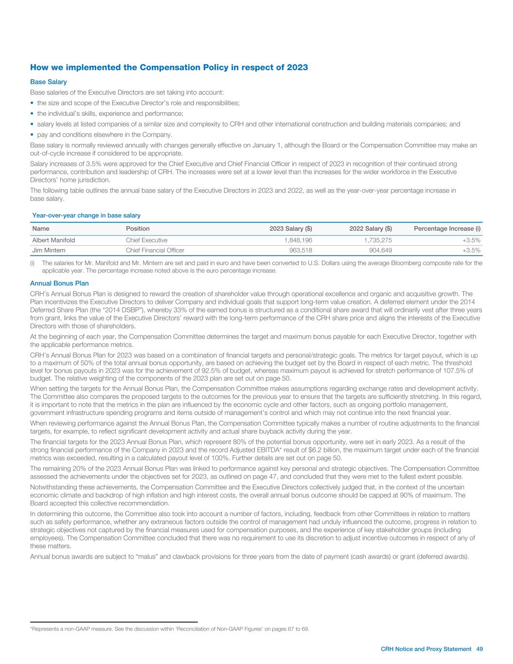 How we implemented the Compensation Policy in respect of 2023 Base Salary Base salaries of the Executive Directors are set taking into account: • the size and scope of the Executive Director’s role and responsibilities; • the individual’s skills, experience and performance; • salary levels at listed companies of a similar size and complexity to CRH and other international construction and building materials companies; and • pay and conditions elsewhere in the Company. Base salary is normally reviewed annually with changes generally effective on January 1, although the Board or the Compensation Committee may make an out-of-cycle increase if considered to be appropriate. Salary increases of 3.5% were approved for the Chief Executive and Chief Financial Officer in respect of 2023 in recognition of their continued strong performance, contribution and leadership of CRH. The increases were set at a lower level than the increases for the wider workforce in the Executive Directors’ home jurisdiction. The following table outlines the annual base salary of the Executive Directors in 2023 and 2022, as well as the year-over-year percentage increase in base salary. Year-over-year change in base salary Name Position 2023 Salary ($) 2022 Salary ($) Percentage Increase (i) Albert Manifold Chief Executive 1,848,196 1,735,275 +3.5% Jim Mintern Chief Financial Officer 963,518 904,649 +3.5% (i) The salaries for Mr. Manifold and Mr. Mintern are set and paid in euro and have been converted to U.S. Dollars using the average Bloomberg composite rate for the applicable year. The percentage increase noted above is the euro percentage increase. Annual Bonus Plan 9 CRH’s Annual Bonus Plan is designed to reward the creation of shareholder value through operational excellence and organic and acquisitive growth. The Plan incentivizes the Executive Directors to deliver Company and individual goals that support long-term value creation. A deferred element under the 2014 Deferred Share Plan (the “2014 DSBP”), whereby 33% of the earned bonus is structured as a conditional share award that will ordinarily vest after three years from grant, links the value of the Executive Directors’ reward with the long-term performance of the CRH share price and aligns the interests of the Executive Directors with those of shareholders. At the beginning of each year, the Compensation Committee determines the target and maximum bonus payable for each Executive Director, together with the applicable performance metrics. CRH’s Annual Bonus Plan for 2023 was based on a combination of financial targets and personal/strategic goals. The metrics for target payout, which is up to a maximum of 50% of the total annual bonus opportunity, are based on achieving the budget set by the Board in respect of each metric. The threshold level for bonus payouts in 2023 was for the achievement of 92.5% of budget, whereas maximum payout is achieved for stretch performance of 107.5% of budget. The relative weighting of the components of the 2023 plan are set out on page 50. When setting the targets for the Annual Bonus Plan, the Compensation Committee makes assumptions regarding exchange rates and development activity. The Committee also compares the proposed targets to the outcomes for the previous year to ensure that the targets are sufficiently stretching. In this regard, it is important to note that the metrics in the plan are influenced by the economic cycle and other factors, such as ongoing portfolio management, government infrastructure spending programs and items outside of management's control and which may not continue into the next financial year. When reviewing performance against the Annual Bonus Plan, the Compensation Committee typically makes a number of routine adjustments to the financial targets, for example, to reflect significant development activity and actual share buyback activity during the year. The financial targets for the 2023 Annual Bonus Plan, which represent 80% of the potential bonus opportunity, were set in early 2023. As a result of the strong financial performance of the Company in 2023 and the record Adjusted EBITDA* result of $6.2 billion, the maximum target under each of the financial metrics was exceeded, resulting in a calculated payout level of 100%. Further details are set out on page 50. The remaining 20% of the 2023 Annual Bonus Plan was linked to performance against key personal and strategic objectives. The Compensation Committee assessed the achievements under the objectives set for 2023, as outlined on page 47, and concluded that they were met to the fullest extent possible. Notwithstanding these achievements, the Compensation Committee and the Executive Directors collectively judged that, in the context of the uncertain economic climate and backdrop of high inflation and high interest costs, the overall annual bonus outcome should be capped at 90% of maximum. The Board accepted this collective recommendation. In determining this outcome, the Committee also took into account a number of factors, including, feedback from other Committees in relation to matters such as safety performance, whether any extraneous factors outside the control of management had unduly influenced the outcome, progress in relation to strategic objectives not captured by the financial measures used for compensation purposes, and the experience of key stakeholder groups (including employees). The Compensation Committee concluded that there was no requirement to use its discretion to adjust incentive outcomes in respect of any of these matters. Annual bonus awards are subject to “malus” and clawback provisions for three years from the date of payment (cash awards) or grant (deferred awards). CRH Notice and Proxy Statement 49 *Represents a non-GAAP measure. See the discussion within 'Reconciliation of Non-GAAP Figures' on pages 67 to 69.9