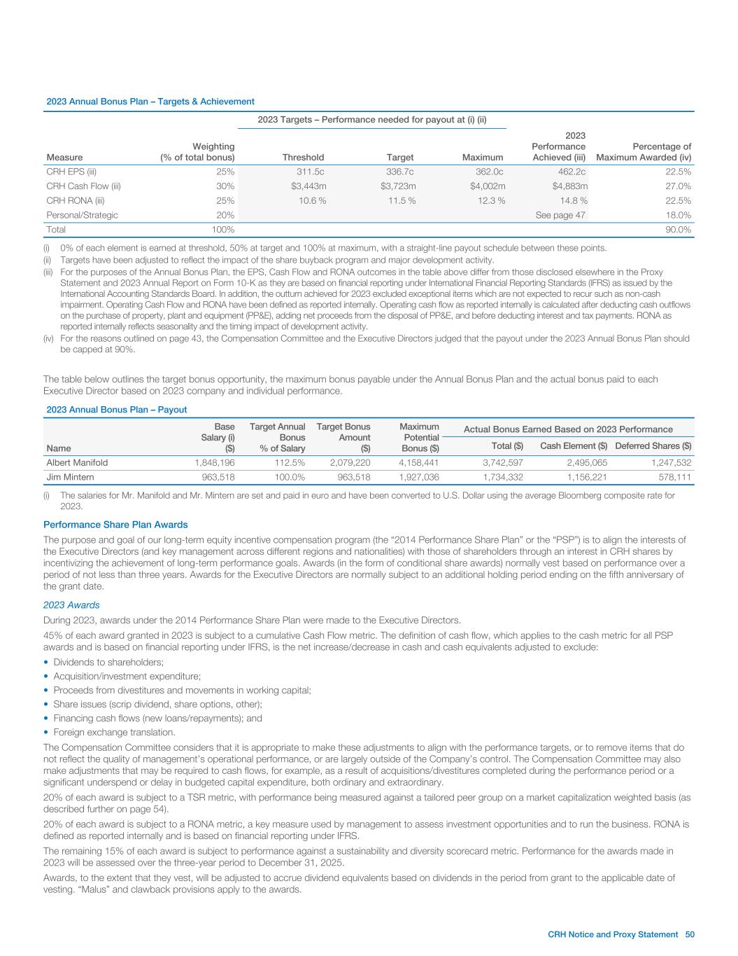 2023 Annual Bonus Plan – Targets & Achievement 2023 Targets – Performance needed for payout at (i) (ii) Measure Weighting (% of total bonus) Threshold Target Maximum 2023 Performance Achieved (iii) Percentage of Maximum Awarded (iv) CRH EPS (iii) 25% 311.5c 336.7c 362.0c 462.2c 22.5% CRH Cash Flow (iii) 30% $3,443m $3,723m $4,002m $4,883m 27.0% CRH RONA (iii) 25% 10.6 % 11.5 % 12.3 % 14.8 % 22.5% Personal/Strategic 20% See page 47 18.0% Total 100% 90.0% (i) 0% of each element is earned at threshold, 50% at target and 100% at maximum, with a straight-line payout schedule between these points. (ii) Targets have been adjusted to reflect the impact of the share buyback program and major development activity. (iii) For the purposes of the Annual Bonus Plan, the EPS, Cash Flow and RONA outcomes in the table above differ from those disclosed elsewhere in the Proxy Statement and 2023 Annual Report on Form 10-K as they are based on financial reporting under International Financial Reporting Standards (IFRS) as issued by the International Accounting Standards Board. In addition, the outturn achieved for 2023 excluded exceptional items which are not expected to recur such as non-cash impairment. Operating Cash Flow and RONA have been defined as reported internally. Operating cash flow as reported internally is calculated after deducting cash outflows on the purchase of property, plant and equipment (PP&E), adding net proceeds from the disposal of PP&E, and before deducting interest and tax payments. RONA as reported internally reflects seasonality and the timing impact of development activity. (iv) For the reasons outlined on page 43, the Compensation Committee and the Executive Directors judged that the payout under the 2023 Annual Bonus Plan should be capped at 90%. The table below outlines the target bonus opportunity, the maximum bonus payable under the Annual Bonus Plan and the actual bonus paid to each Executive Director based on 2023 company and individual performance. 2023 Annual Bonus Plan – Payout Name Base Salary (i) ($) Target Annual Bonus % of Salary Target Bonus Amount ($) Maximum Potential Bonus ($) Actual Bonus Earned Based on 2023 Performance Total ($) Cash Element ($) Deferred Shares ($) Albert Manifold 1,848,196 112.5% 2,079,220 4,158,441 3,742,597 2,495,065 1,247,532 Jim Mintern 963,518 100.0% 963,518 1,927,036 1,734,332 1,156,221 578,111 (i) The salaries for Mr. Manifold and Mr. Mintern are set and paid in euro and have been converted to U.S. Dollar using the average Bloomberg composite rate for 2023. Performance Share Plan Awards The purpose and goal of our long-term equity incentive compensation program (the “2014 Performance Share Plan” or the “PSP”) is to align the interests of the Executive Directors (and key management across different regions and nationalities) with those of shareholders through an interest in CRH shares by incentivizing the achievement of long-term performance goals. Awards (in the form of conditional share awards) normally vest based on performance over a period of not less than three years. Awards for the Executive Directors are normally subject to an additional holding period ending on the fifth anniversary of the grant date. 2023 Awards During 2023, awards under the 2014 Performance Share Plan were made to the Executive Directors. 45% of each award granted in 2023 is subject to a cumulative Cash Flow metric. The definition of cash flow, which applies to the cash metric for all PSP awards and is based on financial reporting under IFRS, is the net increase/decrease in cash and cash equivalents adjusted to exclude: • Dividends to shareholders; • Acquisition/investment expenditure; • Proceeds from divestitures and movements in working capital; • Share issues (scrip dividend, share options, other); • Financing cash flows (new loans/repayments); and • Foreign exchange translation. The Compensation Committee considers that it is appropriate to make these adjustments to align with the performance targets, or to remove items that do not reflect the quality of management’s operational performance, or are largely outside of the Company’s control. The Compensation Committee may also make adjustments that may be required to cash flows, for example, as a result of acquisitions/divestitures completed during the performance period or a significant underspend or delay in budgeted capital expenditure, both ordinary and extraordinary. 20% of each award is subject to a TSR metric, with performance being measured against a tailored peer group on a market capitalization weighted basis (as described further on page 54). 20% of each award is subject to a RONA metric, a key measure used by management to assess investment opportunities and to run the business. RONA is defined as reported internally and is based on financial reporting under IFRS. The remaining 15% of each award is subject to performance against a sustainability and diversity scorecard metric. Performance for the awards made in 2023 will be assessed over the three-year period to December 31, 2025. Awards, to the extent that they vest, will be adjusted to accrue dividend equivalents based on dividends in the period from grant to the applicable date of vesting. “Malus” and clawback provisions apply to the awards. CRH Notice and Proxy Statement 50