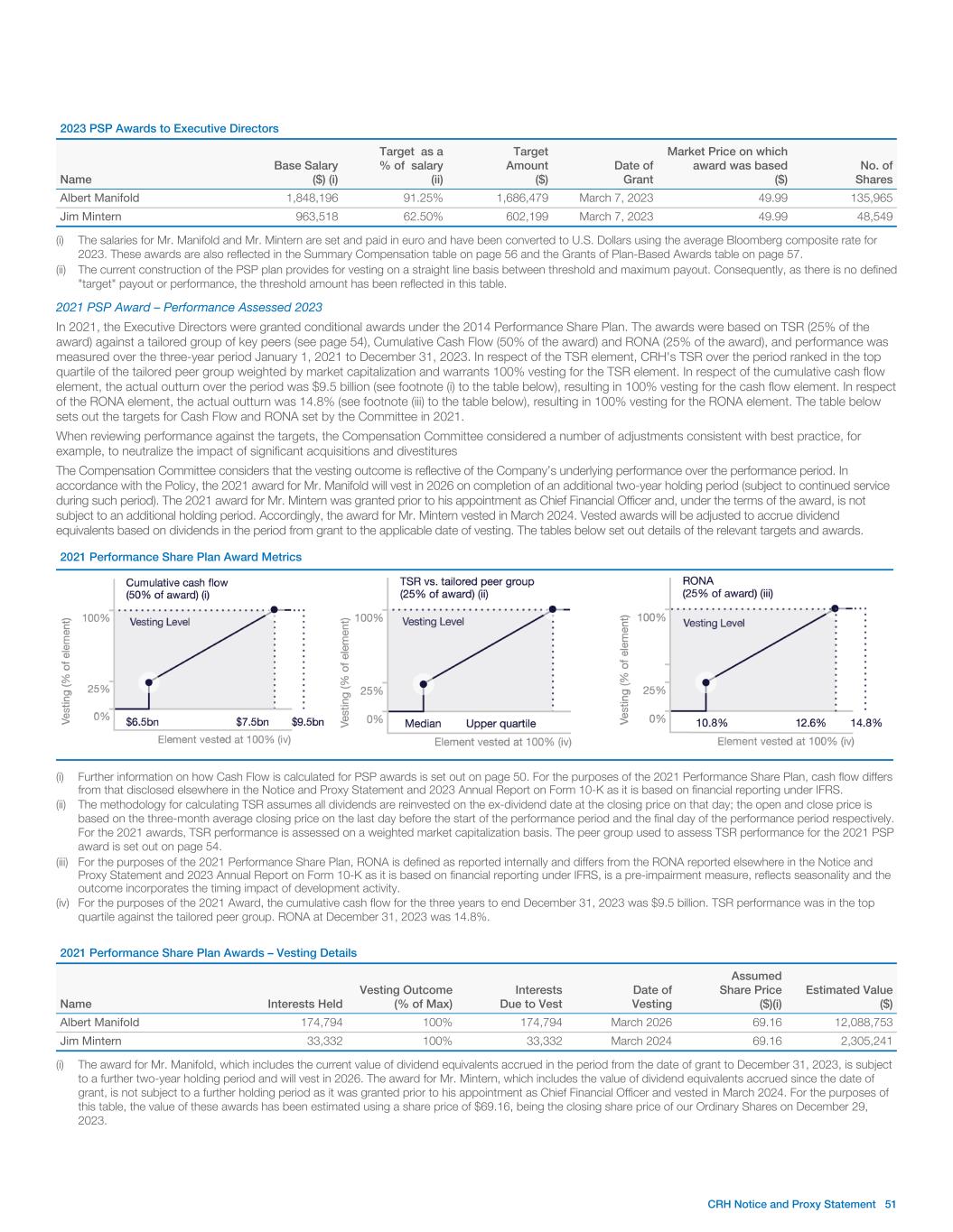 2023 PSP Awards to Executive Directors Name Base Salary ($) (i) Target as a % of salary (ii) Target Amount ($) Date of Grant Market Price on which award was based ($) No. of Shares Albert Manifold 1,848,196 91.25% 1,686,479 March 7, 2023 49.99 135,965 Jim Mintern 963,518 62.50% 602,199 March 7, 2023 49.99 48,549 (i) The salaries for Mr. Manifold and Mr. Mintern are set and paid in euro and have been converted to U.S. Dollars using the average Bloomberg composite rate for 2023. These awards are also reflected in the Summary Compensation table on page 56 and the Grants of Plan-Based Awards table on page 57. (ii) The current construction of the PSP plan provides for vesting on a straight line basis between threshold and maximum payout. Consequently, as there is no defined "target" payout or performance, the threshold amount has been reflected in this table. 2021 PSP Award – Performance Assessed 2023 In 2021, the Executive Directors were granted conditional awards under the 2014 Performance Share Plan. The awards were based on TSR (25% of the award) against a tailored group of key peers (see page 54), Cumulative Cash Flow (50% of the award) and RONA (25% of the award), and performance was measured over the three-year period January 1, 2021 to December 31, 2023. In respect of the TSR element, CRH's TSR over the period ranked in the top quartile of the tailored peer group weighted by market capitalization and warrants 100% vesting for the TSR element. In respect of the cumulative cash flow element, the actual outturn over the period was $9.5 billion (see footnote (i) to the table below), resulting in 100% vesting for the cash flow element. In respect of the RONA element, the actual outturn was 14.8% (see footnote (iii) to the table below), resulting in 100% vesting for the RONA element. The table below sets out the targets for Cash Flow and RONA set by the Committee in 2021. When reviewing performance against the targets, the Compensation Committee considered a number of adjustments consistent with best practice, for example, to neutralize the impact of significant acquisitions and divestitures The Compensation Committee considers that the vesting outcome is reflective of the Company’s underlying performance over the performance period. In accordance with the Policy, the 2021 award for Mr. Manifold will vest in 2026 on completion of an additional two-year holding period (subject to continued service during such period). The 2021 award for Mr. Mintern was granted prior to his appointment as Chief Financial Officer and, under the terms of the award, is not subject to an additional holding period. Accordingly, the award for Mr. Mintern vested in March 2024. Vested awards will be adjusted to accrue dividend equivalents based on dividends in the period from grant to the applicable date of vesting. The tables below set out details of the relevant targets and awards. 2021 Performance Share Plan Award Metrics (i) Further information on how Cash Flow is calculated for PSP awards is set out on page 50. For the purposes of the 2021 Performance Share Plan, cash flow differs from that disclosed elsewhere in the Notice and Proxy Statement and 2023 Annual Report on Form 10-K as it is based on financial reporting under IFRS. (ii) The methodology for calculating TSR assumes all dividends are reinvested on the ex-dividend date at the closing price on that day; the open and close price is based on the three-month average closing price on the last day before the start of the performance period and the final day of the performance period respectively. For the 2021 awards, TSR performance is assessed on a weighted market capitalization basis. The peer group used to assess TSR performance for the 2021 PSP award is set out on page 54. (iii) For the purposes of the 2021 Performance Share Plan, RONA is defined as reported internally and differs from the RONA reported elsewhere in the Notice and Proxy Statement and 2023 Annual Report on Form 10-K as it is based on financial reporting under IFRS, is a pre-impairment measure, reflects seasonality and the outcome incorporates the timing impact of development activity. (iv) For the purposes of the 2021 Award, the cumulative cash flow for the three years to end December 31, 2023 was $9.5 billion. TSR performance was in the top quartile against the tailored peer group. RONA at December 31, 2023 was 14.8%. 2021 Performance Share Plan Awards – Vesting Details Name Interests Held Vesting Outcome (% of Max) Interests Due to Vest Date of Vesting Assumed Share Price ($)(i) Estimated Value ($) Albert Manifold 174,794 100% 174,794 March 2026 69.16 12,088,753 Jim Mintern 33,332 100% 33,332 March 2024 69.16 2,305,241 (i) The award for Mr. Manifold, which includes the current value of dividend equivalents accrued in the period from the date of grant to December 31, 2023, is subject to a further two-year holding period and will vest in 2026. The award for Mr. Mintern, which includes the value of dividend equivalents accrued since the date of grant, is not subject to a further holding period as it was granted prior to his appointment as Chief Financial Officer and vested in March 2024. For the purposes of this table, the value of these awards has been estimated using a share price of $69.16, being the closing share price of our Ordinary Shares on December 29, 2023. CRH Notice and Proxy Statement 51