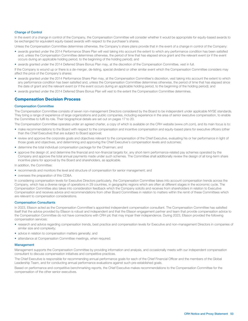 Change of Control In the event of a change in control of the Company, the Compensation Committee will consider whether it would be appropriate for equity-based awards to be exchanged for equivalent equity-based awards with respect to the purchaser’s shares. Unless the Compensation Committee determines otherwise, the Company’s share plans provide that in the event of a change in control of the Company: • awards granted under the 2014 Performance Share Plan will vest taking into account the extent to which any performance condition has been satisfied and, unless the Compensation Committee determines otherwise, the period of time that has elapsed since grant and the relevant event (or if the event occurs during an applicable holding period, to the beginning of the holding period); and • awards granted under the 2014 Deferred Share Bonus Plan may, at the discretion of the Compensation Committee, vest in full. If the Company is wound up or there is a de-merger, de-listing, special dividend or other similar event which the Compensation Committee considers may affect the price of the Company’s shares: • awards granted under the 2014 Performance Share Plan may, at the Compensation Committee’s discretion, vest taking into account the extent to which any performance condition has been satisfied and, unless the Compensation Committee determines otherwise, the period of time that has elapsed since the date of grant and the relevant event (or if the event occurs during an applicable holding period, to the beginning of the holding period); and • awards granted under the 2014 Deferred Share Bonus Plan will vest to the extent the Compensation Committee determines. Compensation Decision Process Compensation Committee The Compensation Committee consists of seven non-management Directors considered by the Board to be independent under applicable NYSE standards. They bring a range of experience of large organizations and public companies, including experience in the area of senior executive compensation, to enable the Committee to fulfil its role. Their biographical details are set out on pages 17 to 20. The Compensation Committee operates under an agreed charter, a copy of which is available on the CRH website (www.crh.com), and its main focus is to: • make recommendations to the Board with respect to the compensation and incentive compensation and equity-based plans for executive officers (other than the Chief Executive) that are subject to Board approval; • review and approve the corporate goals and objectives relevant to the compensation of the Chief Executive, evaluating his or her performance in light of those goals and objectives, and determining and approving the Chief Executive’s compensation levels and outcomes; • determine the total individual compensation package for the Chairman; and • approve the design of, and determine the financial and non-financial targets for, any short-term performance-related pay schemes operated by the Company and approve the total annual payments made under such schemes. The Committee shall additionally review the design of all long-term share incentive plans for approval by the Board and shareholders, as applicable. In addition, the Committee: • recommends and monitors the level and structure of compensation for senior management; and • oversees the preparation of this CD&A. In considering compensation levels for Executive Directors particularly, the Compensation Committee takes into account compensation trends across the Company, which has a diverse range of operations in 29 countries, in geographic regions which are often at different stages in the economic cycle. The Compensation Committee also takes into consideration feedback which the Company solicits and receives from shareholders in relation to Executive Compensation and receives advice and recommendations from other Board Committees in relation to matters within the remit of these Committees which are relevant to compensation considerations. Compensation Consultants In 2023, Ellason acted as the Compensation Committee's appointed independent compensation consultant. The Compensation Committee has satisfied itself that the advice provided by Ellason is robust and independent and that the Ellason engagement partner and team that provide compensation advice to the Compensation Committee do not have connections with CRH plc that may impair their independence. During 2023, Ellason provided the following compensation services: • research and advice regarding compensation trends, best practice and compensation levels for Executive and non-management Directors in companies of similar size and complexity; • advice in relation to compensation matters generally; and • attendance at Compensation Committee meetings, when required. Management Management supports the Compensation Committee by providing information and analysis, and occasionally meets with our independent compensation consultant to discuss compensation initiatives and competitive practices. The Chief Executive is responsible for recommending annual performance goals for each of the Chief Financial Officer and the members of the Global Leadership Team, and for conducting annual performance evaluations against such pre-established goals. Based on performance and competitive benchmarking reports, the Chief Executive makes recommendations to the Compensation Committee for the compensation of the other senior executives. CRH Notice and Proxy Statement 53