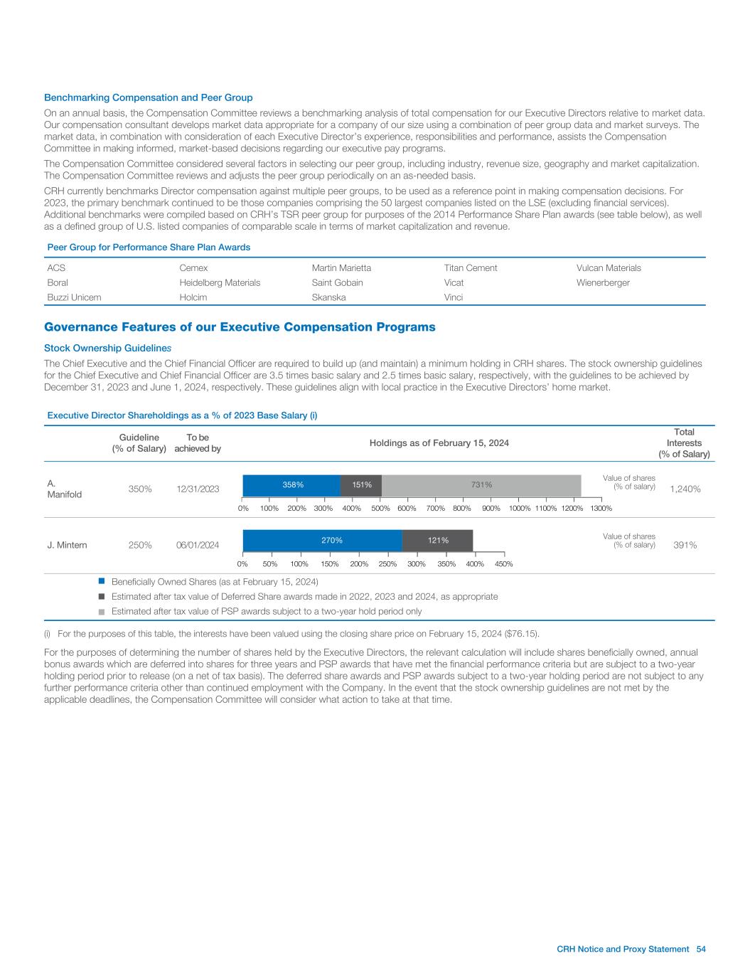 Benchmarking Compensation and Peer Group On an annual basis, the Compensation Committee reviews a benchmarking analysis of total compensation for our Executive Directors relative to market data. Our compensation consultant develops market data appropriate for a company of our size using a combination of peer group data and market surveys. The market data, in combination with consideration of each Executive Director’s experience, responsibilities and performance, assists the Compensation Committee in making informed, market-based decisions regarding our executive pay programs. The Compensation Committee considered several factors in selecting our peer group, including industry, revenue size, geography and market capitalization. The Compensation Committee reviews and adjusts the peer group periodically on an as-needed basis. CRH currently benchmarks Director compensation against multiple peer groups, to be used as a reference point in making compensation decisions. For 2023, the primary benchmark continued to be those companies comprising the 50 largest companies listed on the LSE (excluding financial services). Additional benchmarks were compiled based on CRH’s TSR peer group for purposes of the 2014 Performance Share Plan awards (see table below), as well as a defined group of U.S. listed companies of comparable scale in terms of market capitalization and revenue. Peer Group for Performance Share Plan Awards ACS Cemex Martin Marietta Titan Cement Vulcan Materials Boral Heidelberg Materials Saint Gobain Vicat Wienerberger Buzzi Unicem Holcim Skanska Vinci Governance Features of our Executive Compensation Programs Stock Ownership Guidelines The Chief Executive and the Chief Financial Officer are required to build up (and maintain) a minimum holding in CRH shares. The stock ownership guidelines for the Chief Executive and Chief Financial Officer are 3.5 times basic salary and 2.5 times basic salary, respectively, with the guidelines to be achieved by December 31, 2023 and June 1, 2024, respectively. These guidelines align with local practice in the Executive Directors’ home market. Executive Director Shareholdings as a % of 2023 Base Salary (i) Guideline (% of Salary) To be achieved by Holdings as of February 15, 2024 Total Interests (% of Salary) A. Manifold 350% 12/31/2023 1,240% J. Mintern 250% 06/01/2024 391% ■ Beneficially Owned Shares (as at February 15, 2024) Estimated after tax value of Deferred Share awards made in 2022, 2023 and 2024, as appropriate Estimated after tax value of PSP awards subject to a two-year hold period only ■ ■ (i) For the purposes of this table, the interests have been valued using the closing share price on February 15, 2024 ($76.15). For the purposes of determining the number of shares held by the Executive Directors, the relevant calculation will include shares beneficially owned, annual bonus awards which are deferred into shares for three years and PSP awards that have met the financial performance criteria but are subject to a two-year holding period prior to release (on a net of tax basis). The deferred share awards and PSP awards subject to a two-year holding period are not subject to any further performance criteria other than continued employment with the Company. In the event that the stock ownership guidelines are not met by the applicable deadlines, the Compensation Committee will consider what action to take at that time. CRH Notice and Proxy Statement 54 Value of shares (% of salary)358% 151% 731% 270% 121% Value of shares (% of salary) 0% 100% 200% 300% 400% 500% 600% 700% 800% 900% 0% 50% 100% 150% 200% 250% 300% 350% 1000% 1100% 1200% 1300% 400% 450%
