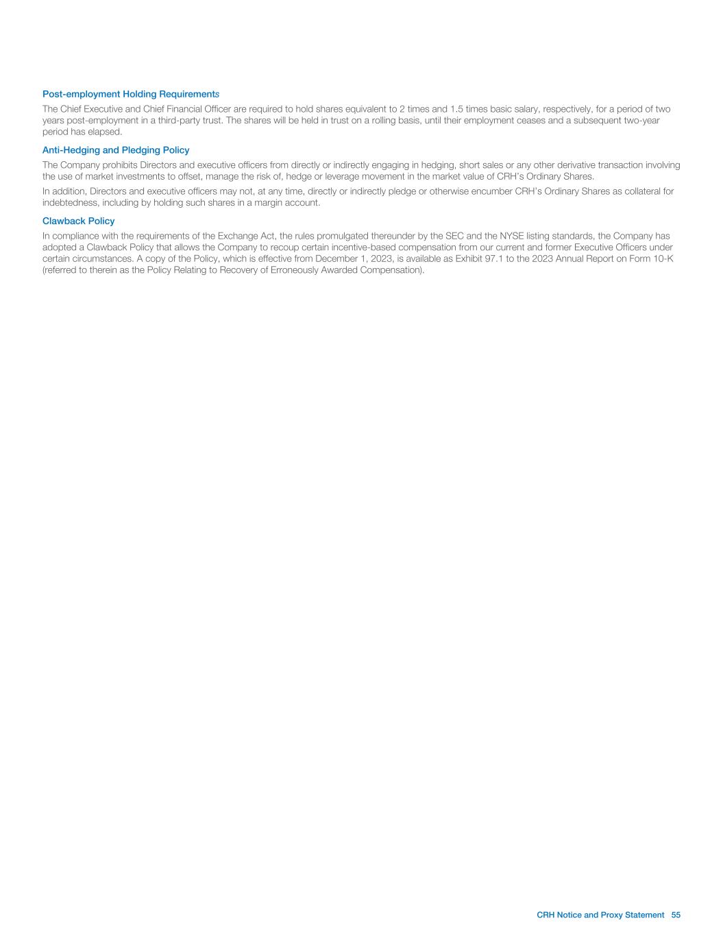 Post-employment Holding Requirements The Chief Executive and Chief Financial Officer are required to hold shares equivalent to 2 times and 1.5 times basic salary, respectively, for a period of two years post-employment in a third-party trust. The shares will be held in trust on a rolling basis, until their employment ceases and a subsequent two-year period has elapsed. Anti-Hedging and Pledging Policy The Company prohibits Directors and executive officers from directly or indirectly engaging in hedging, short sales or any other derivative transaction involving the use of market investments to offset, manage the risk of, hedge or leverage movement in the market value of CRH’s Ordinary Shares. In addition, Directors and executive officers may not, at any time, directly or indirectly pledge or otherwise encumber CRH’s Ordinary Shares as collateral for indebtedness, including by holding such shares in a margin account. Clawback Policy In compliance with the requirements of the Exchange Act, the rules promulgated thereunder by the SEC and the NYSE listing standards, the Company has adopted a Clawback Policy that allows the Company to recoup certain incentive-based compensation from our current and former Executive Officers under certain circumstances. A copy of the Policy, which is effective from December 1, 2023, is available as Exhibit 97.1 to the 2023 Annual Report on Form 10-K (referred to therein as the Policy Relating to Recovery of Erroneously Awarded Compensation). CRH Notice and Proxy Statement 55