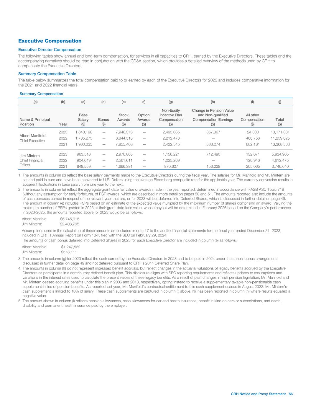 Executive Compensation Executive Director Compensation The following tables show annual and long-term compensation, for services in all capacities to CRH, earned by the Executive Directors. These tables and the accompanying narratives should be read in conjunction with the CD&A section, which provides a detailed overview of the methods used by CRH to compensate the Executive Directors. Summary Compensation Table The table below summarizes the total compensation paid to or earned by each of the Executive Directors for 2023 and includes comparative information for the 2021 and 2022 financial years. Summary Compensation (a) (b) (c) (d) (e) (f) (g) (h) (i) (j) Name & Principal Position Year Base Salary ($) Bonus ($) Stock Awards ($) Option Awards ($) Non-Equity Incentive Plan Compensation ($) Change in Pension Value and Non-qualified Compensation Earnings ($) All other Compensation ($) Total ($) Albert Manifold Chief Executive 2023 1,848,196 — 7,946,373 — 2,495,065 857,367 24,080 13,171,081 2022 1,735,275 — 6,844,518 — 2,212,476 — 466,756 11,259,025 2021 1,900,035 — 7,855,468 — 2,422,545 508,274 682,181 13,368,503 Jim Mintern Chief Financial Officer 2023 963,518 — 2,970,065 — 1,156,221 712,490 132,671 5,934,965 2022 904,649 — 2,561,611 — 1,025,269 — 120,946 4,612,475 2021 848,559 — 1,666,381 — 870,607 156,028 205,065 3,746,640 1. The amounts in column (c) reflect the base salary payments made to the Executive Directors during the fiscal year. The salaries for Mr. Manifold and Mr. Mintern are set and paid in euro and have been converted to U.S. Dollars using the average Bloomberg composite rate for the applicable year. The currency conversion results in apparent fluctuations in base salary from one year to the next. 2. The amounts in column (e) reflect the aggregate grant date fair value of awards made in the year reported, determined in accordance with FASB ASC Topic 718 (without any assumption for early forfeiture), of PSP awards, which are described in more detail on pages 50 and 51. The amounts reported also include the amounts of cash bonuses earned in respect of the relevant year that are, or for 2023 will be, deferred into Deferred Shares, which is discussed in further detail on page 49. The amount in column (e) includes PSPs based on an estimate of the expected value multiplied by the maximum number of shares comprising an award. Valuing the maximum number of PSPs granted in 2023 at their grant-date face value, whose payout will be determined in February 2026 based on the Company’s performance in 2023-2025, the amounts reported above for 2023 would be as follows: Albert Manifold: $6,745,915 Jim Mintern: $2,408,795 Assumptions used in the calculation of these amounts are included in note 17 to the audited financial statements for the fiscal year ended December 31, 2023, included in CRH’s Annual Report on Form 10-K filed with the SEC on February 29, 2024. The amounts of cash bonus deferred into Deferred Shares in 2023 for each Executive Director are included in column (e) as follows: Albert Manifold: $1,247,532 Jim Mintern: $578,111 3. The amounts in column (g) for 2023 reflect the cash earned by the Executive Directors in 2023 and to be paid in 2024 under the annual bonus arrangements discussed in further detail on page 49 and not deferred pursuant to CRH’s 2014 Deferred Share Plan. 4. The amounts in column (h) do not represent increased benefit accruals, but reflect changes in the actuarial valuations of legacy benefits accrued by the Executive Directors as participants in a contributory defined benefit plan. This disclosure aligns with SEC reporting requirements and reflects updates to assumptions and variations in the interest rates used to calculate the present values of these legacy benefits. As a result of past changes in Irish pension legislation, Mr. Manifold and Mr. Mintern ceased accruing benefits under this plan in 2006 and 2013, respectively, opting instead to receive a supplementary taxable non-pensionable cash supplement in lieu of pension benefits. As reported last year, Mr. Manifold’s contractual entitlement to this cash supplement ceased in August 2022. Mr. Mintern’s cash supplement is limited to 10% of salary. These cash supplements are captured in column (i) above. Nil has been reported in column (h) where results equalled a negative value. 5. The amount shown in column (i) reflects pension allowances, cash allowances for car and health insurance, benefit in kind on cars or subscriptions, and death, disability and permanent health insurance paid by the employer. CRH Notice and Proxy Statement 56