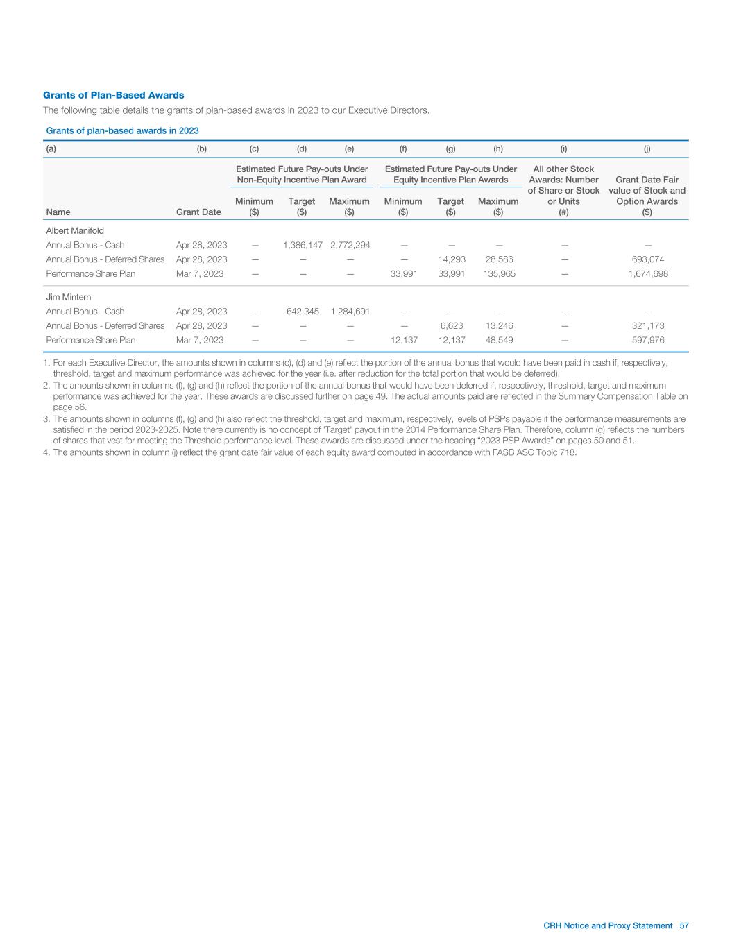 Grants of Plan-Based Awards The following table details the grants of plan-based awards in 2023 to our Executive Directors. Grants of plan-based awards in 2023 (a) (b) (c) (d) (e) (f) (g) (h) (i) (j) Estimated Future Pay-outs Under Non-Equity Incentive Plan Award Estimated Future Pay-outs Under Equity Incentive Plan Awards All other Stock Awards: Number of Share or Stock or Units (#) Grant Date Fair value of Stock and Option Awards ($)Name Grant Date Minimum ($) Target ($) Maximum ($) Minimum ($) Target ($) Maximum ($) Albert Manifold Annual Bonus - Cash Apr 28, 2023 — 1,386,147 2,772,294 — — — — — Annual Bonus - Deferred Shares Apr 28, 2023 — — — — 14,293 28,586 — 693,074 Performance Share Plan Mar 7, 2023 — — — 33,991 33,991 135,965 — 1,674,698 Jim Mintern Annual Bonus - Cash Apr 28, 2023 — 642,345 1,284,691 — — — — — Annual Bonus - Deferred Shares Apr 28, 2023 — — — — 6,623 13,246 — 321,173 Performance Share Plan Mar 7, 2023 — — — 12,137 12,137 48,549 — 597,976 1. For each Executive Director, the amounts shown in columns (c), (d) and (e) reflect the portion of the annual bonus that would have been paid in cash if, respectively, threshold, target and maximum performance was achieved for the year (i.e. after reduction for the total portion that would be deferred). 2. The amounts shown in columns (f), (g) and (h) reflect the portion of the annual bonus that would have been deferred if, respectively, threshold, target and maximum performance was achieved for the year. These awards are discussed further on page 49. The actual amounts paid are reflected in the Summary Compensation Table on page 56. 3. The amounts shown in columns (f), (g) and (h) also reflect the threshold, target and maximum, respectively, levels of PSPs payable if the performance measurements are satisfied in the period 2023-2025. Note there currently is no concept of 'Target' payout in the 2014 Performance Share Plan. Therefore, column (g) reflects the numbers of shares that vest for meeting the Threshold performance level. These awards are discussed under the heading “2023 PSP Awards” on pages 50 and 51. 4. The amounts shown in column (j) reflect the grant date fair value of each equity award computed in accordance with FASB ASC Topic 718. CRH Notice and Proxy Statement 57