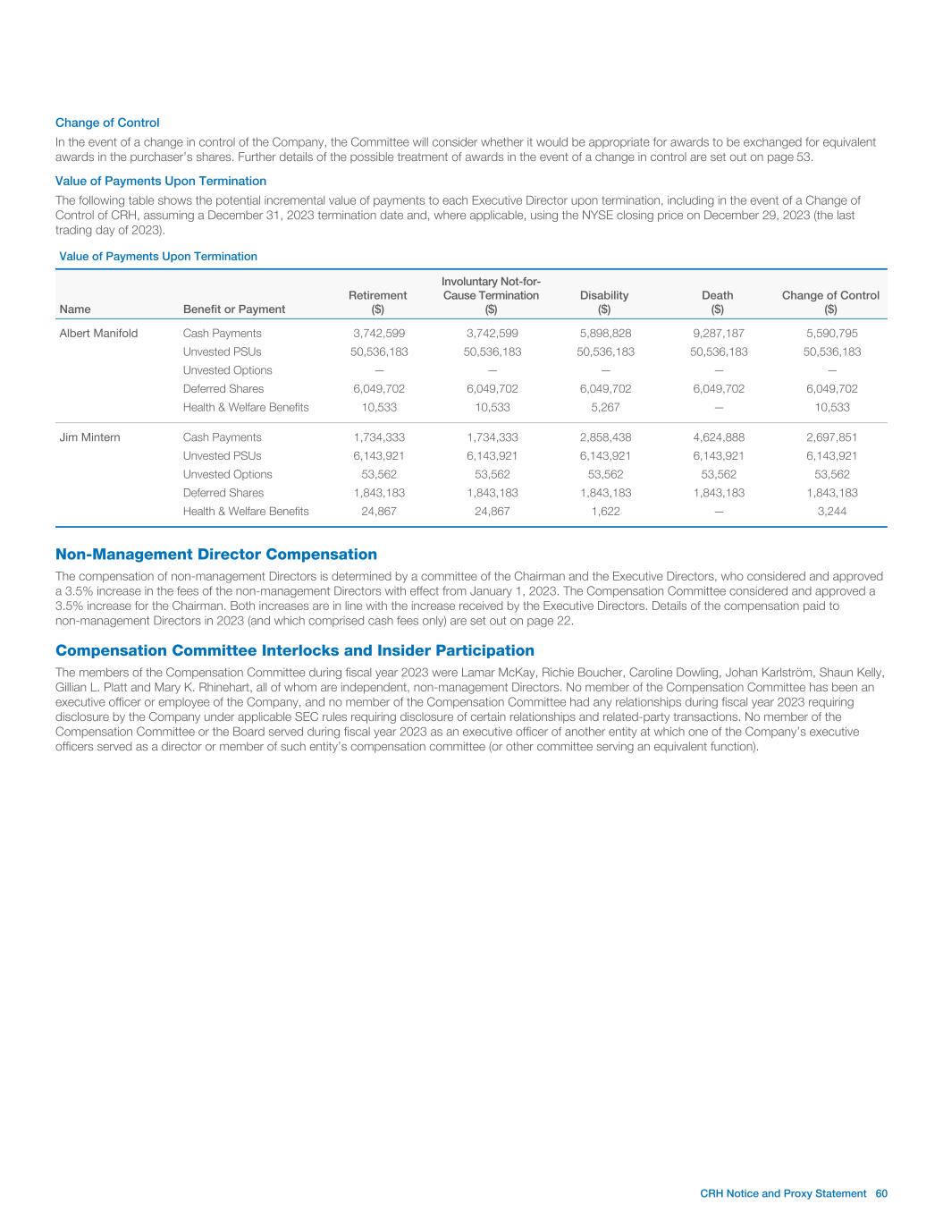 Change of Control In the event of a change in control of the Company, the Committee will consider whether it would be appropriate for awards to be exchanged for equivalent awards in the purchaser’s shares. Further details of the possible treatment of awards in the event of a change in control are set out on page 53. Value of Payments Upon Termination The following table shows the potential incremental value of payments to each Executive Director upon termination, including in the event of a Change of Control of CRH, assuming a December 31, 2023 termination date and, where applicable, using the NYSE closing price on December 29, 2023 (the last trading day of 2023). Value of Payments Upon Termination Name Benefit or Payment Retirement ($) Involuntary Not-for- Cause Termination ($) Disability ($) Death ($) Change of Control ($) Albert Manifold Cash Payments 3,742,599 3,742,599 5,898,828 9,287,187 5,590,795 Unvested PSUs 50,536,183 50,536,183 50,536,183 50,536,183 50,536,183 Unvested Options — — — — — Deferred Shares 6,049,702 6,049,702 6,049,702 6,049,702 6,049,702 Health & Welfare Benefits 10,533 10,533 5,267 — 10,533 Jim Mintern Cash Payments 1,734,333 1,734,333 2,858,438 4,624,888 2,697,851 Unvested PSUs 6,143,921 6,143,921 6,143,921 6,143,921 6,143,921 Unvested Options 53,562 53,562 53,562 53,562 53,562 Deferred Shares 1,843,183 1,843,183 1,843,183 1,843,183 1,843,183 Health & Welfare Benefits 24,867 24,867 1,622 — 3,244 Non-Management Director Compensation The compensation of non-management Directors is determined by a committee of the Chairman and the Executive Directors, who considered and approved a 3.5% increase in the fees of the non-management Directors with effect from January 1, 2023. The Compensation Committee considered and approved a 3.5% increase for the Chairman. Both increases are in line with the increase received by the Executive Directors. Details of the compensation paid to non-management Directors in 2023 (and which comprised cash fees only) are set out on page 22. Compensation Committee Interlocks and Insider Participation The members of the Compensation Committee during fiscal year 2023 were Lamar McKay, Richie Boucher, Caroline Dowling, Johan Karlström, Shaun Kelly, Gillian L. Platt and Mary K. Rhinehart, all of whom are independent, non-management Directors. No member of the Compensation Committee has been an executive officer or employee of the Company, and no member of the Compensation Committee had any relationships during fiscal year 2023 requiring disclosure by the Company under applicable SEC rules requiring disclosure of certain relationships and related-party transactions. No member of the Compensation Committee or the Board served during fiscal year 2023 as an executive officer of another entity at which one of the Company’s executive officers served as a director or member of such entity’s compensation committee (or other committee serving an equivalent function). CRH Notice and Proxy Statement 60