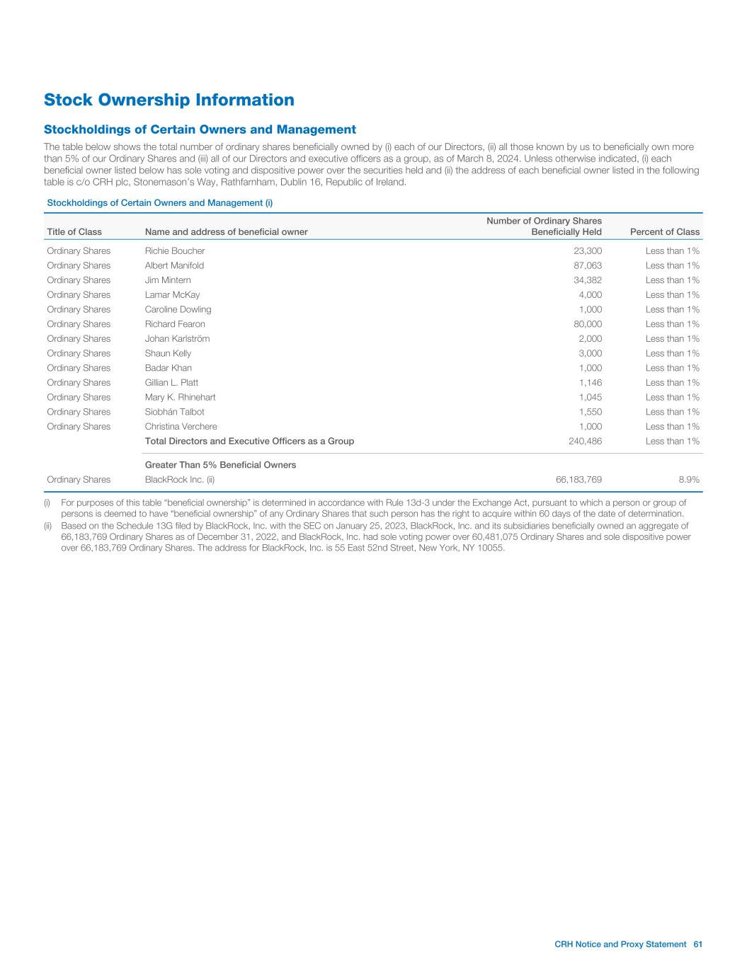 Stock Ownership Information Stockholdings of Certain Owners and Management The table below shows the total number of ordinary shares beneficially owned by (i) each of our Directors, (ii) all those known by us to beneficially own more than 5% of our Ordinary Shares and (iii) all of our Directors and executive officers as a group, as of March 8, 2024. Unless otherwise indicated, (i) each beneficial owner listed below has sole voting and dispositive power over the securities held and (ii) the address of each beneficial owner listed in the following table is c/o CRH plc, Stonemason’s Way, Rathfarnham, Dublin 16, Republic of Ireland. Stockholdings of Certain Owners and Management (i) Title of Class Name and address of beneficial owner Number of Ordinary Shares Beneficially Held Percent of Class Ordinary Shares Richie Boucher 23,300 Less than 1% Ordinary Shares Albert Manifold 87,063 Less than 1% Ordinary Shares Jim Mintern 34,382 Less than 1% Ordinary Shares Lamar McKay 4,000 Less than 1% Ordinary Shares Caroline Dowling 1,000 Less than 1% Ordinary Shares Richard Fearon 80,000 Less than 1% Ordinary Shares Johan Karlström 2,000 Less than 1% Ordinary Shares Shaun Kelly 3,000 Less than 1% Ordinary Shares Badar Khan 1,000 Less than 1% Ordinary Shares Gillian L. Platt 1,146 Less than 1% Ordinary Shares Mary K. Rhinehart 1,045 Less than 1% Ordinary Shares Siobhán Talbot 1,550 Less than 1% Ordinary Shares Christina Verchere 1,000 Less than 1% Total Directors and Executive Officers as a Group 240,486 Less than 1% Greater Than 5% Beneficial Owners Ordinary Shares BlackRock Inc. (ii) 66,183,769 8.9% (i) For purposes of this table “beneficial ownership” is determined in accordance with Rule 13d-3 under the Exchange Act, pursuant to which a person or group of persons is deemed to have “beneficial ownership” of any Ordinary Shares that such person has the right to acquire within 60 days of the date of determination. (ii) Based on the Schedule 13G filed by BlackRock, Inc. with the SEC on January 25, 2023, BlackRock, Inc. and its subsidiaries beneficially owned an aggregate of 66,183,769 Ordinary Shares as of December 31, 2022, and BlackRock, Inc. had sole voting power over 60,481,075 Ordinary Shares and sole dispositive power over 66,183,769 Ordinary Shares. The address for BlackRock, Inc. is 55 East 52nd Street, New York, NY 10055. CRH Notice and Proxy Statement 61