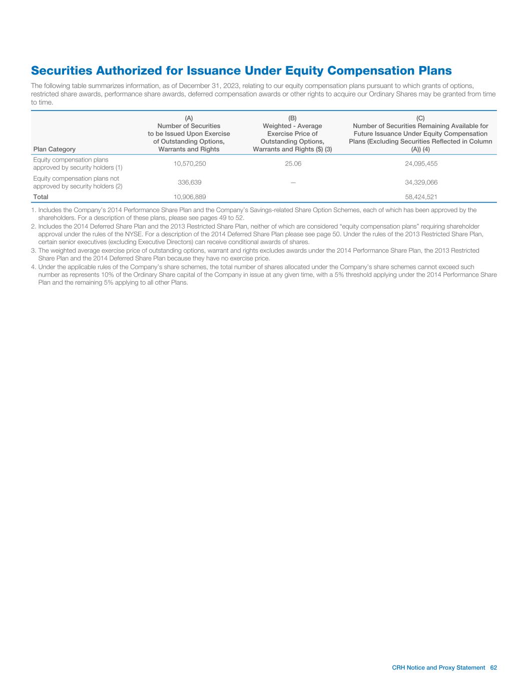 Securities Authorized for Issuance Under Equity Compensation Plans The following table summarizes information, as of December 31, 2023, relating to our equity compensation plans pursuant to which grants of options, restricted share awards, performance share awards, deferred compensation awards or other rights to acquire our Ordinary Shares may be granted from time to time. Plan Category (A) Number of Securities to be Issued Upon Exercise of Outstanding Options, Warrants and Rights (B) Weighted - Average Exercise Price of Outstanding Options, Warrants and Rights ($) (3) (C) Number of Securities Remaining Available for Future Issuance Under Equity Compensation Plans (Excluding Securities Reflected in Column (A)) (4) Equity compensation plans approved by security holders (1) 10,570,250 25.06 24,095,455 Equity compensation plans not approved by security holders (2) 336,639 — 34,329,066 Total 10,906,889 58,424,521 1. Includes the Company’s 2014 Performance Share Plan and the Company’s Savings-related Share Option Schemes, each of which has been approved by the shareholders. For a description of these plans, please see pages 49 to 52. 2. Includes the 2014 Deferred Share Plan and the 2013 Restricted Share Plan, neither of which are considered “equity compensation plans” requiring shareholder approval under the rules of the NYSE. For a description of the 2014 Deferred Share Plan please see page 50. Under the rules of the 2013 Restricted Share Plan, certain senior executives (excluding Executive Directors) can receive conditional awards of shares. 3. The weighted average exercise price of outstanding options, warrant and rights excludes awards under the 2014 Performance Share Plan, the 2013 Restricted Share Plan and the 2014 Deferred Share Plan because they have no exercise price. 4. Under the applicable rules of the Company’s share schemes, the total number of shares allocated under the Company’s share schemes cannot exceed such number as represents 10% of the Ordinary Share capital of the Company in issue at any given time, with a 5% threshold applying under the 2014 Performance Share Plan and the remaining 5% applying to all other Plans. CRH Notice and Proxy Statement 62