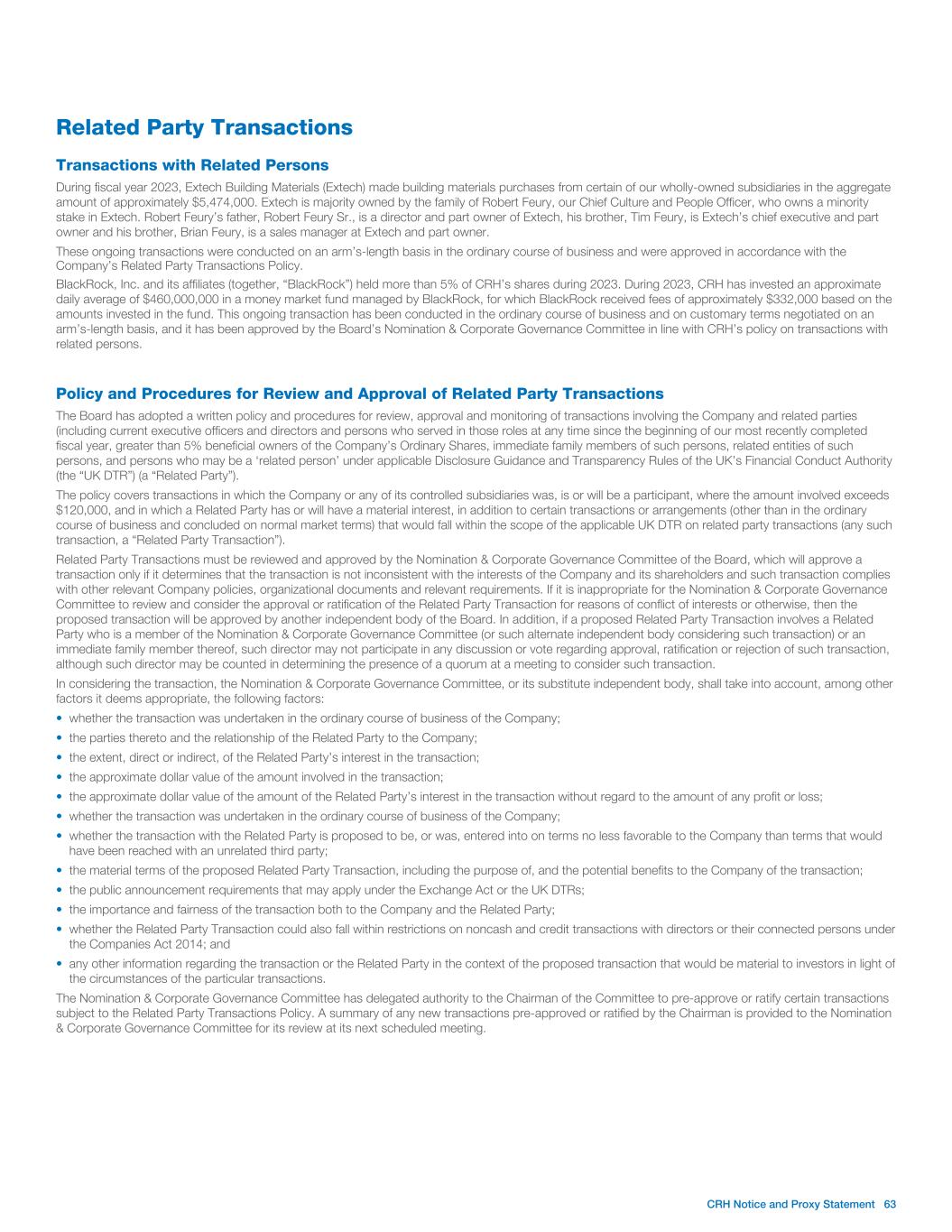 Related Party Transactions Transactions with Related Persons During fiscal year 2023, Extech Building Materials (Extech) made building materials purchases from certain of our wholly-owned subsidiaries in the aggregate amount of approximately $5,474,000. Extech is majority owned by the family of Robert Feury, our Chief Culture and People Officer, who owns a minority stake in Extech. Robert Feury’s father, Robert Feury Sr., is a director and part owner of Extech, his brother, Tim Feury, is Extech’s chief executive and part owner and his brother, Brian Feury, is a sales manager at Extech and part owner. These ongoing transactions were conducted on an arm’s-length basis in the ordinary course of business and were approved in accordance with the Company’s Related Party Transactions Policy. BlackRock, Inc. and its affiliates (together, “BlackRock”) held more than 5% of CRH’s shares during 2023. During 2023, CRH has invested an approximate daily average of $460,000,000 in a money market fund managed by BlackRock, for which BlackRock received fees of approximately $332,000 based on the amounts invested in the fund. This ongoing transaction has been conducted in the ordinary course of business and on customary terms negotiated on an arm’s-length basis, and it has been approved by the Board’s Nomination & Corporate Governance Committee in line with CRH’s policy on transactions with related persons. Policy and Procedures for Review and Approval of Related Party Transactions The Board has adopted a written policy and procedures for review, approval and monitoring of transactions involving the Company and related parties (including current executive officers and directors and persons who served in those roles at any time since the beginning of our most recently completed fiscal year, greater than 5% beneficial owners of the Company’s Ordinary Shares, immediate family members of such persons, related entities of such persons, and persons who may be a ‘related person’ under applicable Disclosure Guidance and Transparency Rules of the UK’s Financial Conduct Authority (the “UK DTR”) (a “Related Party”). The policy covers transactions in which the Company or any of its controlled subsidiaries was, is or will be a participant, where the amount involved exceeds $120,000, and in which a Related Party has or will have a material interest, in addition to certain transactions or arrangements (other than in the ordinary course of business and concluded on normal market terms) that would fall within the scope of the applicable UK DTR on related party transactions (any such transaction, a “Related Party Transaction”). Related Party Transactions must be reviewed and approved by the Nomination & Corporate Governance Committee of the Board, which will approve a transaction only if it determines that the transaction is not inconsistent with the interests of the Company and its shareholders and such transaction complies with other relevant Company policies, organizational documents and relevant requirements. If it is inappropriate for the Nomination & Corporate Governance Committee to review and consider the approval or ratification of the Related Party Transaction for reasons of conflict of interests or otherwise, then the proposed transaction will be approved by another independent body of the Board. In addition, if a proposed Related Party Transaction involves a Related Party who is a member of the Nomination & Corporate Governance Committee (or such alternate independent body considering such transaction) or an immediate family member thereof, such director may not participate in any discussion or vote regarding approval, ratification or rejection of such transaction, although such director may be counted in determining the presence of a quorum at a meeting to consider such transaction. In considering the transaction, the Nomination & Corporate Governance Committee, or its substitute independent body, shall take into account, among other factors it deems appropriate, the following factors: • whether the transaction was undertaken in the ordinary course of business of the Company; • the parties thereto and the relationship of the Related Party to the Company; • the extent, direct or indirect, of the Related Party’s interest in the transaction; • the approximate dollar value of the amount involved in the transaction; • the approximate dollar value of the amount of the Related Party’s interest in the transaction without regard to the amount of any profit or loss; • whether the transaction was undertaken in the ordinary course of business of the Company; • whether the transaction with the Related Party is proposed to be, or was, entered into on terms no less favorable to the Company than terms that would have been reached with an unrelated third party; • the material terms of the proposed Related Party Transaction, including the purpose of, and the potential benefits to the Company of the transaction; • the public announcement requirements that may apply under the Exchange Act or the UK DTRs; • the importance and fairness of the transaction both to the Company and the Related Party; • whether the Related Party Transaction could also fall within restrictions on noncash and credit transactions with directors or their connected persons under the Companies Act 2014; and • any other information regarding the transaction or the Related Party in the context of the proposed transaction that would be material to investors in light of the circumstances of the particular transactions. The Nomination & Corporate Governance Committee has delegated authority to the Chairman of the Committee to pre-approve or ratify certain transactions subject to the Related Party Transactions Policy. A summary of any new transactions pre-approved or ratified by the Chairman is provided to the Nomination & Corporate Governance Committee for its review at its next scheduled meeting. 