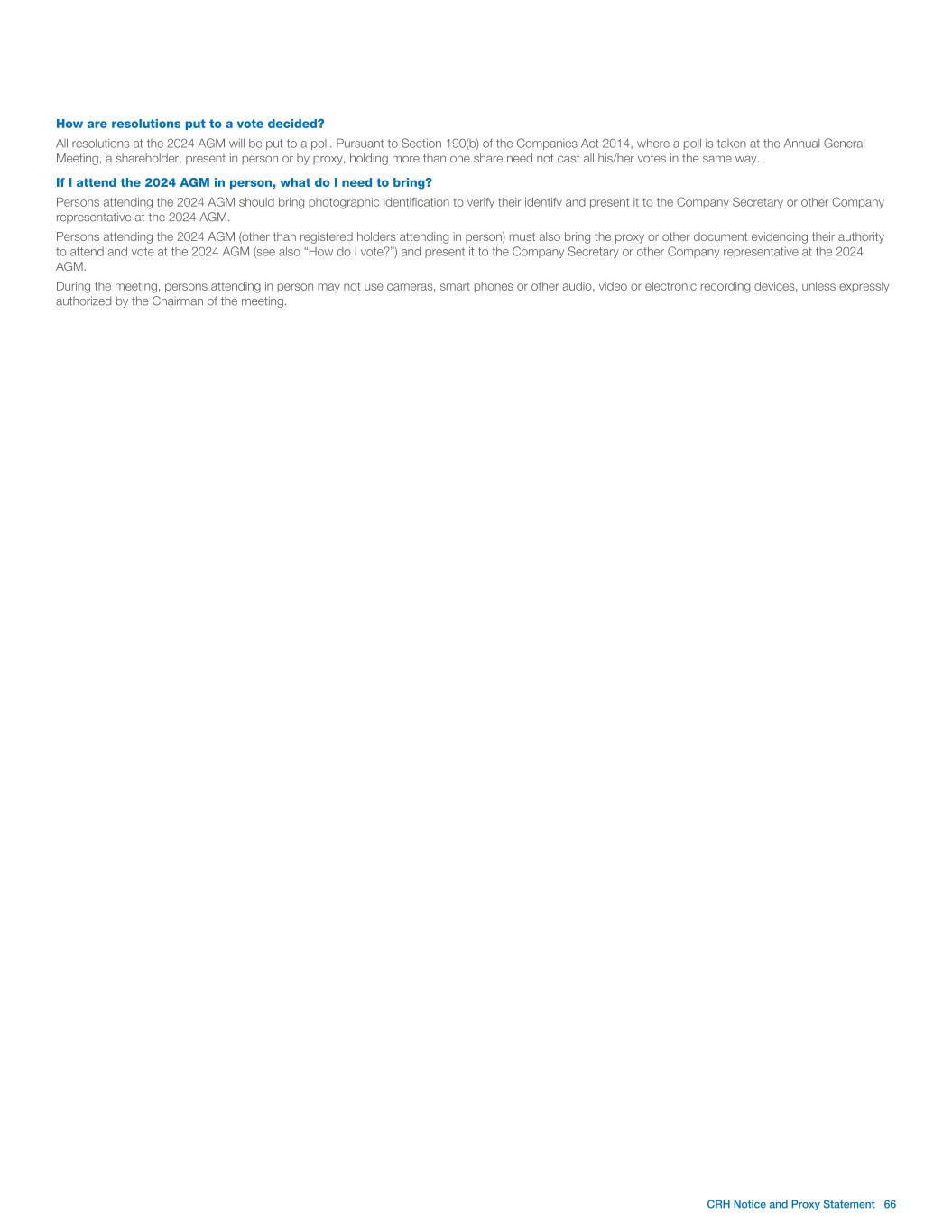 How are resolutions put to a vote decided? All resolutions at the 2024 AGM will be put to a poll. Pursuant to Section 190(b) of the Companies Act 2014, where a poll is taken at the Annual General Meeting, a shareholder, present in person or by proxy, holding more than one share need not cast all his/her votes in the same way. If I attend the 2024 AGM in person, what do I need to bring? Persons attending the 2024 AGM should bring photographic identification to verify their identify and present it to the Company Secretary or other Company representative at the 2024 AGM. Persons attending the 2024 AGM (other than registered holders attending in person) must also bring the proxy or other document evidencing their authority to attend and vote at the 2024 AGM (see also “How do I vote?”) and present it to the Company Secretary or other Company representative at the 2024 AGM. During the meeting, persons attending in person may not use cameras, smart phones or other audio, video or electronic recording devices, unless expressly authorized by the Chairman of the meeting. CRH Notice and Proxy Statement 66