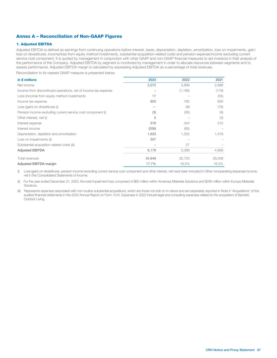 Annex A – Reconciliation of Non-GAAP Figures 1. Adjusted EBITDA Adjusted EBITDA is defined as earnings from continuing operations before interest, taxes, depreciation, depletion, amortization, loss on impairments, gain/ loss on divestitures, income/loss from equity method investments, substantial acquisition-related costs and pension expense/income excluding current service cost component. It is quoted by management in conjunction with other GAAP and non-GAAP financial measures to aid investors in their analysis of the performance of the Company. Adjusted EBITDA by segment is monitored by management in order to allocate resources between segments and to assess performance. Adjusted EBITDA margin is calculated by expressing Adjusted EBITDA as a percentage of total revenues. Reconciliation to its nearest GAAP measure is presented below: in $ millions 2023 2022 2021 Net income 3,072 3,889 2,686 Income from discontinued operations, net of income tax expense – (1,190) (179) Loss (income) from equity method investments 17 – (55) Income tax expense 925 762 650 Loss (gain) on divestitures (i) — 99 (78) Pension income excluding current service cost component (i) (3) (30) (9) Other interest, net (i) 5 – (3) Interest expense 376 344 315 Interest income (206) (65) – Depreciation, depletion and amortization 1,633 1,552 1,479 Loss on impairments (ii) 357 – – Substantial acquisition-related costs (iii) – 27 – Adjusted EBITDA 6,176 5,388 4,806 Total revenues 34,949 32,723 29,206 Adjusted EBITDA margin 17.7% 16.5% 16.5% (i) Loss (gain) on divestitures, pension income excluding current service cost component and other interest, net have been included in Other nonoperating (expense) income, net in the Consolidated Statements of Income. (ii) For the year ended December 31, 2023, the total impairment loss comprised of $62 million within Americas Materials Solutions and $295 million within Europe Materials Solutions. (iii) Represents expenses associated with non-routine substantial acquisitions, which are those not bolt-on in nature and are separately reported in Note 4 “Acquisitions” of the audited financial statements in the 2023 Annual Report on Form 10-K. Expenses in 2022 include legal and consulting expenses related to the acquisition of Barrette Outdoor Living. CRH Notice and Proxy Statement 67