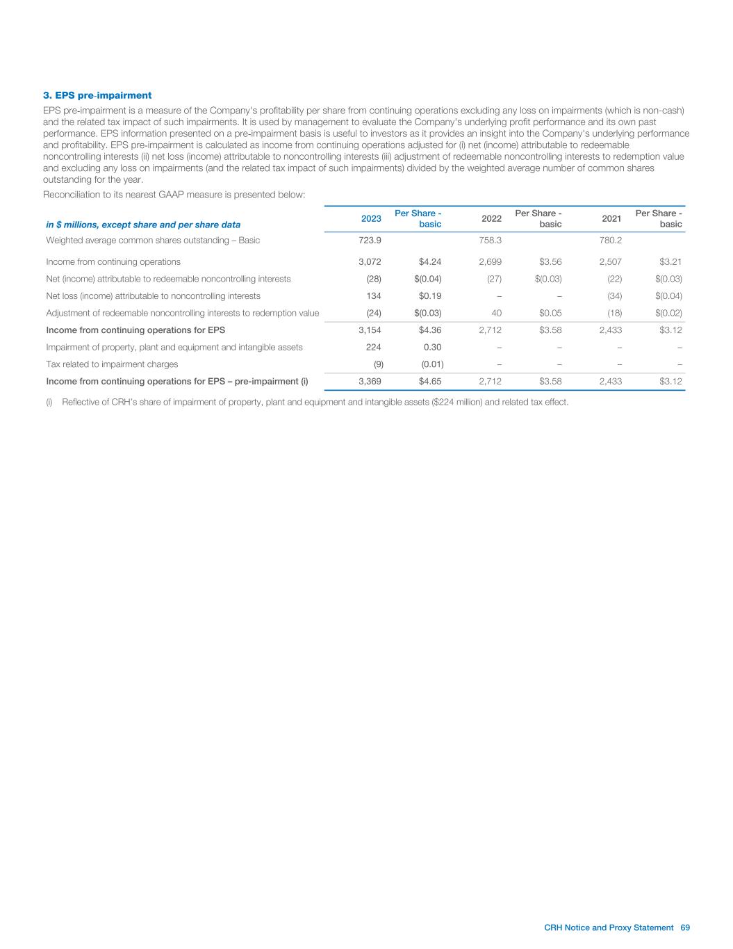 3. EPS pre-impairment EPS pre-impairment is a measure of the Company's profitability per share from continuing operations excluding any loss on impairments (which is non-cash) and the related tax impact of such impairments. It is used by management to evaluate the Company's underlying profit performance and its own past performance. EPS information presented on a pre-impairment basis is useful to investors as it provides an insight into the Company's underlying performance and profitability. EPS pre-impairment is calculated as income from continuing operations adjusted for (i) net (income) attributable to redeemable noncontrolling interests (ii) net loss (income) attributable to noncontrolling interests (iii) adjustment of redeemable noncontrolling interests to redemption value and excluding any loss on impairments (and the related tax impact of such impairments) divided by the weighted average number of common shares outstanding for the year. Reconciliation to its nearest GAAP measure is presented below: in $ millions, except share and per share data 2023 Per Share - basic 2022 Per Share - basic 2021 Per Share - basic Weighted average common shares outstanding – Basic 723.9 758.3 780.2 Income from continuing operations 3,072 $4.24 2,699 $3.56 2,507 $3.21 Net (income) attributable to redeemable noncontrolling interests (28) $(0.04) (27) $(0.03) (22) $(0.03) Net loss (income) attributable to noncontrolling interests 134 $0.19 – – (34) $(0.04) Adjustment of redeemable noncontrolling interests to redemption value (24) $(0.03) 40 $0.05 (18) $(0.02) Income from continuing operations for EPS 3,154 $4.36 2,712 $3.58 2,433 $3.12 Impairment of property, plant and equipment and intangible assets 224 0.30 – – – – Tax related to impairment charges (9) (0.01) – – – – Income from continuing operations for EPS – pre-impairment (i) 3,369 $4.65 2,712 $3.58 2,433 $3.12 (i) Reflective of CRH’s share of impairment of property, plant and equipment and intangible assets ($224 million) and related tax effect. CRH Notice and Proxy Statement 69