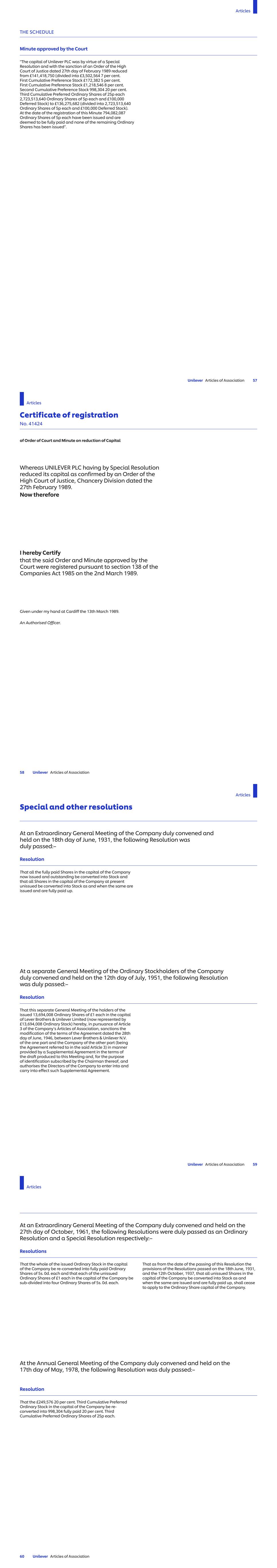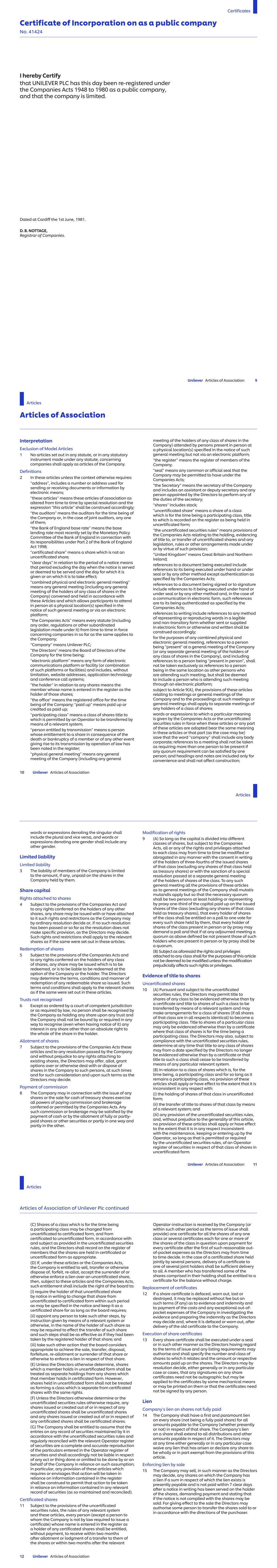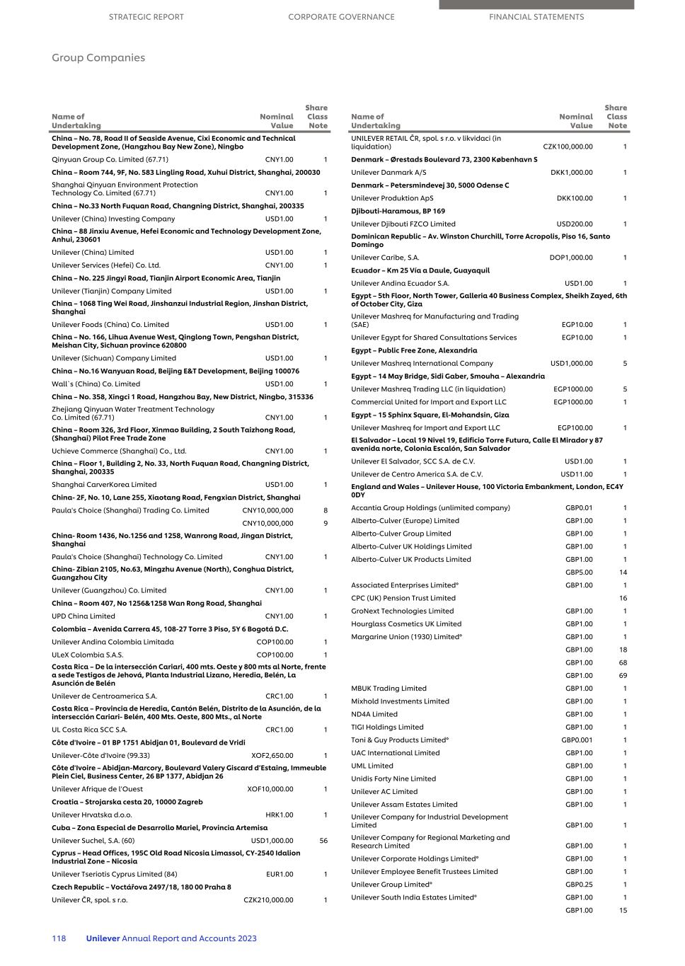 China – No. 78, Road II of Seaside Avenue, Cixi Economic and Technical Development Zone, (Hangzhou Bay New Zone), Ningbo Qinyuan Group Co. Limited (67.71) CNY1.00 1 China – Room 744, 9F, No. 583 Lingling Road, Xuhui District, Shanghai, 200030 Shanghai Qinyuan Environment Protection Technology Co. Limited (67.71) CNY1.00 1 China – No.33 North Fuquan Road, Changning District, Shanghai, 200335 Unilever (China) Investing Company USD1.00 1 China – 88 Jinxiu Avenue, Hefei Economic and Technology Development Zone, Anhui, 230601 Unilever (China) Limited USD1.00 1 Unilever Services (Hefei) Co. Ltd. CNY1.00 1 China – No. 225 Jingyi Road, Tianjin Airport Economic Area, Tianjin Unilever (Tianjin) Company Limited USD1.00 1 China – 1068 Ting Wei Road, Jinshanzui Industrial Region, Jinshan District, Shanghai Unilever Foods (China) Co. Limited USD1.00 1 China – No. 166, Lihua Avenue West, Qinglong Town, Pengshan District, Meishan City, Sichuan province 620800 Unilever (Sichuan) Company Limited USD1.00 1 China – No.16 Wanyuan Road, Beijing E&T Development, Beijing 100076 Wall`s (China) Co. Limited USD1.00 1 China – No. 358, Xingci 1 Road, Hangzhou Bay, New District, Ningbo, 315336 Zhejiang Qinyuan Water Treatment Technology Co. Limited (67.71) CNY1.00 1 China – Room 326, 3rd Floor, Xinmao Building, 2 South Taizhong Road, (Shanghai) Pilot Free Trade Zone Uchieve Commerce (Shanghai) Co., Ltd. CNY1.00 1 China – Floor 1, Building 2, No. 33, North Fuquan Road, Changning District, Shanghai, 200335 Shanghai CarverKorea Limited USD1.00 1 China- 2F, No. 10, Lane 255, Xiaotang Road, Fengxian District, Shanghai Paula's Choice (Shanghai) Trading Co. Limited CNY10,000,000 8 CNY10,000,000 9 China- Room 1436, No.1256 and 1258, Wanrong Road, Jingan District, Shanghai Paula's Choice (Shanghai) Technology Co. Limited CNY1.00 1 China- Zibian 2105, No.63, Mingzhu Avenue (North), Conghua District, Guangzhou City Unilever (Guangzhou) Co. Limited CNY1.00 1 China – Room 407, No 1256&1258 Wan Rong Road, Shanghai UPD China Limited CNY1.00 1 Colombia – Avenida Carrera 45, 108-27 Torre 3 Piso, 5Y 6 Bogotá D.C. Unilever Andina Colombia Limitada COP100.00 1 ULeX Colombia S.A.S. COP100.00 1 Costa Rica – De la intersección Cariari, 400 mts. Oeste y 800 mts al Norte, frente a sede Testigos de Jehová, Planta Industrial Lizano, Heredia, Belén, La Asunción de Belén Unilever de Centroamerica S.A. CRC1.00 1 Costa Rica – Provincia de Heredia, Cantón Belén, Distrito de la Asunción, de la intersección Cariari- Belén, 400 Mts. Oeste, 800 Mts., al Norte UL Costa Rica SCC S.A. CRC1.00 1 Côte d'Ivoire – 01 BP 1751 Abidjan 01, Boulevard de Vridi Unilever-Côte d'Ivoire (99.33) XOF2,650.00 1 Côte d'Ivoire – Abidjan-Marcory, Boulevard Valery Giscard d’Estaing, Immeuble Plein Ciel, Business Center, 26 BP 1377, Abidjan 26 Unilever Afrique de l’Ouest XOF10,000.00 1 Croatia – Strojarska cesta 20, 10000 Zagreb Unilever Hrvatska d.o.o. HRK1.00 1 Cuba – Zona Especial de Desarrollo Mariel, Provincia Artemisa Unilever Suchel, S.A. (60) USD1,000.00 56 Cyprus – Head Offices, 195C Old Road Nicosia Limassol, CY-2540 Idalion Industrial Zone – Nicosia Unilever Tseriotis Cyprus Limited (84) EUR1.00 1 Czech Republic – Voctářova 2497/18, 180 00 Praha 8 Unilever ČR, spol. s r.o. CZK210,000.00 1 Name of Undertaking Nominal Value Share Class Note UNILEVER RETAIL ČR, spol. s r.o. v likvidaci (in liquidation) CZK100,000.00 1 Denmark – Ørestads Boulevard 73, 2300 København S Unilever Danmark A/S DKK1,000.00 1 Denmark – Petersmindevej 30, 5000 Odense C Unilever Produktion ApS DKK100.00 1 Djibouti-Haramous, BP 169 Unilever Djibouti FZCO Limited USD200.00 1 Dominican Republic – Av. Winston Churchill, Torre Acropolis, Piso 16, Santo Domingo Unilever Caribe, S.A. DOP1,000.00 1 Ecuador – Km 25 Vía a Daule, Guayaquil Unilever Andina Ecuador S.A. USD1.00 1 Egypt – 5th Floor, North Tower, Galleria 40 Business Complex, Sheikh Zayed, 6th of October City, Giza Unilever Mashreq for Manufacturing and Trading (SAE) EGP10.00 1 Unilever Egypt for Shared Consultations Services EGP10.00 1 Egypt – Public Free Zone, Alexandria Unilever Mashreq International Company USD1,000.00 5 Egypt – 14 May Bridge, Sidi Gaber, Smouha – Alexandria Unilever Mashreq Trading LLC (in liquidation) EGP1000.00 5 Commercial United for Import and Export LLC EGP1000.00 1 Egypt – 15 Sphinx Square, El-Mohandsin, Giza Unilever Mashreq for Import and Export LLC EGP100.00 1 El Salvador – Local 19 Nivel 19, Edificio Torre Futura, Calle El Mirador y 87 avenida norte, Colonia Escalón, San Salvador Unilever El Salvador, SCC S.A. de C.V. USD1.00 1 Unilever de Centro America S.A. de C.V. USD11.00 1 England and Wales – Unilever House, 100 Victoria Embankment, London, EC4Y 0DY Accantia Group Holdings (unlimited company) GBP0.01 1 Alberto-Culver (Europe) Limited GBP1.00 1 Alberto-Culver Group Limited GBP1.00 1 Alberto-Culver UK Holdings Limited GBP1.00 1 Alberto-Culver UK Products Limited GBP1.00 1 GBP5.00 14 Associated Enterprises Limited° GBP1.00 1 CPC (UK) Pension Trust Limited 16 GroNext Technologies Limited GBP1.00 1 Hourglass Cosmetics UK Limited GBP1.00 1 Margarine Union (1930) Limited° GBP1.00 1 GBP1.00 18 GBP1.00 68 GBP1.00 69 MBUK Trading Limited GBP1.00 1 Mixhold Investments Limited GBP1.00 1 ND4A Limited GBP1.00 1 TIGI Holdings Limited GBP1.00 1 Toni & Guy Products Limited° GBP0.001 1 UAC International Limited GBP1.00 1 UML Limited GBP1.00 1 Unidis Forty Nine Limited GBP1.00 1 Unilever AC Limited GBP1.00 1 Unilever Assam Estates Limited GBP1.00 1 Unilever Company for Industrial Development Limited GBP1.00 1 Unilever Company for Regional Marketing and Research Limited GBP1.00 1 Unilever Corporate Holdings Limited° GBP1.00 1 Unilever Employee Benefit Trustees Limited GBP1.00 1 Unilever Group Limited° GBP0.25 1 Unilever South India Estates Limited° GBP1.00 1 GBP1.00 15 Name of Undertaking Nominal Value Share Class Note STRATEGIC 