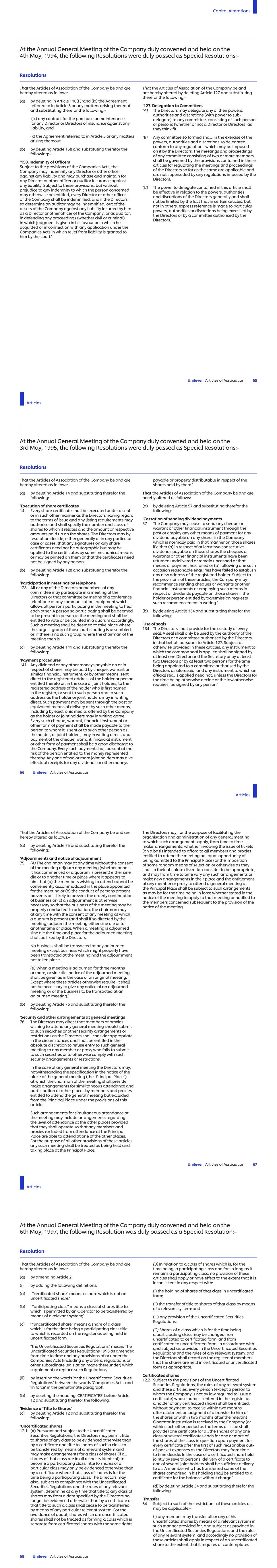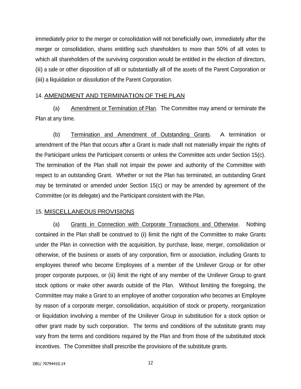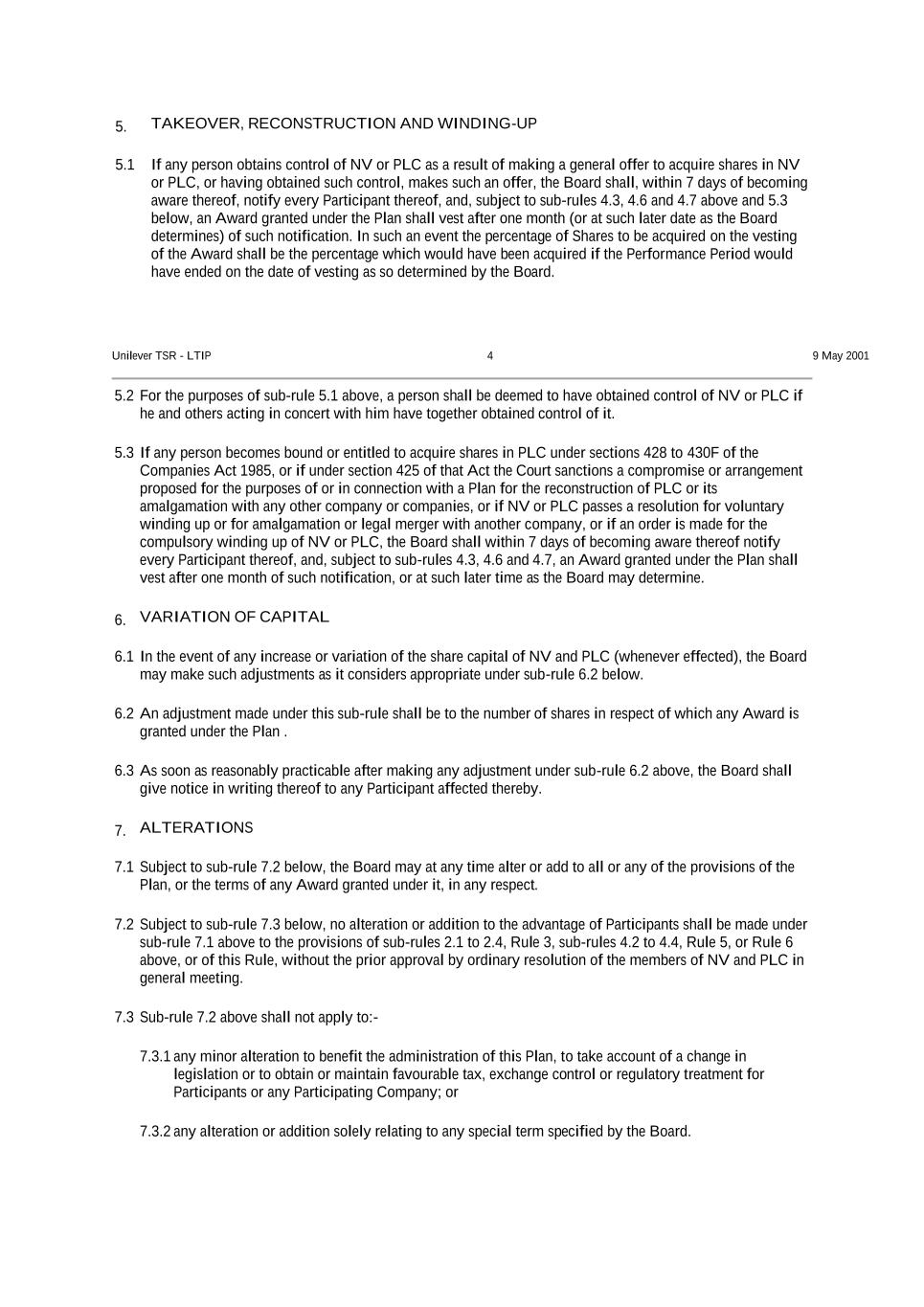 5. TAKEOVER, RECONSTRUCTION AND WINDING-UP 5.1 If any person obtains control of NV or PLC as a result of making a general offer to acquire shares in NV or PLC, or having obtained such control, makes such an offer, the Board shall, within 7 days of becoming aware thereof, notify every Participant thereof, and, subject to sub-rules 4.3, 4.6 and 4.7 above and 5.3 below, an Award granted under the Plan shall vest after one month (or at such later date as the Board determines) of such notification. In such an event the percentage of Shares to be acquired on the vesting of the Award shall be the percentage which would have been acquired if the Performance Period would have ended on the date of vesting as so determined by the Board. Unilever TSR - LTIP 4 9 May 2001 5.2 For the purposes of sub-rule 5.1 above, a person shall be deemed to have obtained control of NV or PLC if he and others acting in concert with him have together obtained control of it. 5.3 If any person becomes bound or entitled to acquire shares in PLC under sections 428 to 430F of the Companies Act 1985, or if under section 425 of that Act the Court sanctions a compromise or arrangement proposed for the purposes of or in connection with a Plan for the reconstruction of PLC or its amalgamation with any other company or companies, or if NV or PLC passes a resolution for voluntary winding up or for amalgamation or legal merger with another company, or if an order is made for the compulsory winding up of NV or PLC, the Board shall within 7 days of becoming aware thereof notify every Participant thereof, and, subject to sub-rules 4.3, 4.6 and 4.7, an Award granted under the Plan shall vest after one month of such notification, or at such later time as the Board may determine. 6. VARIATION OF CAPITAL 6.1 In the event of any increase or variation of the share capital of NV and PLC (whenever effected), the Board may make such adjustments as it considers appropriate under sub-rule 6.2 below. 6.2 An adjustment made under this sub-rule shall be to the number of shares in respect of which any Award is granted under the Plan . 6.3 As soon as reasonably practicable after making any adjustment under sub-rule 6.2 above, the Board shall give notice in writing thereof to any Participant affected thereby. 7. ALTERATIONS 7.1 Subject to sub-rule 7.2 below, the Board may at any time alter or add to all or any of the provisions of the Plan, or the terms of any Award granted under it, in any respect. 7.2 Subject to sub-rule 7.3 below, no alteration or addition to the advantage of Participants shall be made under sub-rule 7.1 above to the provisions of sub-rules 2.1 to 2.4, Rule 3, sub-rules 4.2 to 4.4, Rule 5, or Rule 6 above, or of this Rule, without the prior approval by ordinary resolution of the members of NV and PLC in general meeting. 7.3 Sub-rule 7.2 above shall not apply to:- 7.3.1 any minor alteration to benefit the administration of this Plan, to take account of a change in legislation or to obtain or maintain favourable tax, exchange control or regulatory treatment for Participants or any Participating Company; or 7.3.2 any alteration or addition solely relating to any special term specified by the Board.