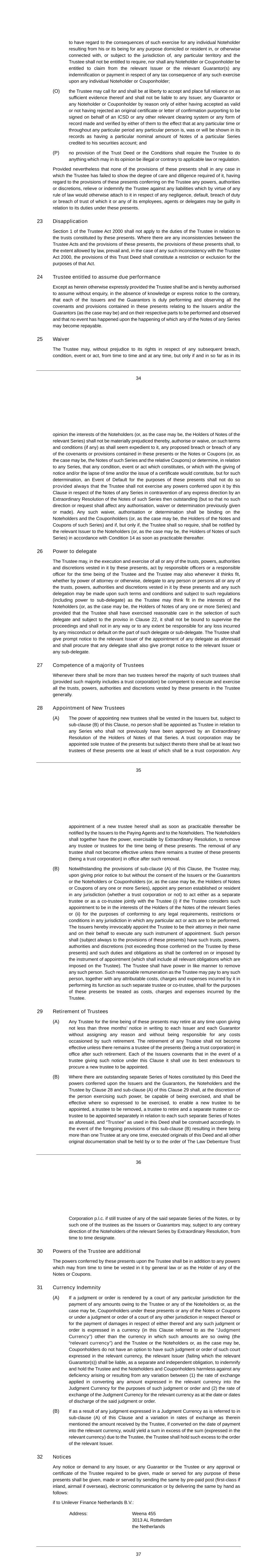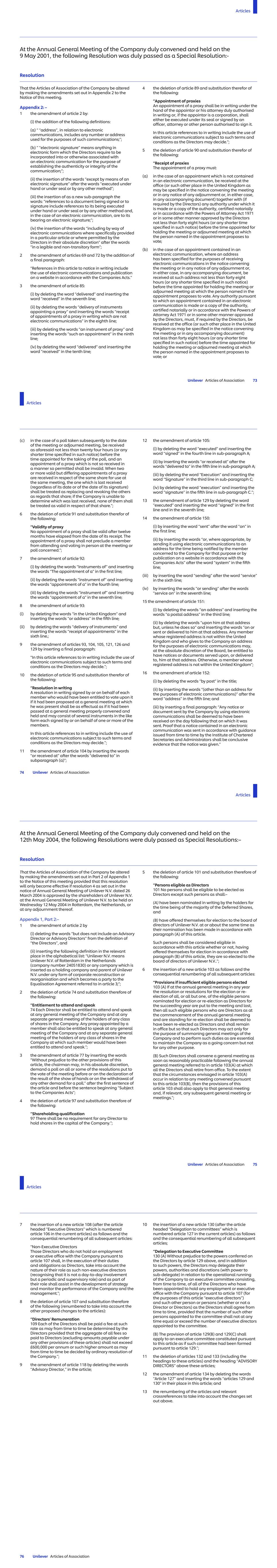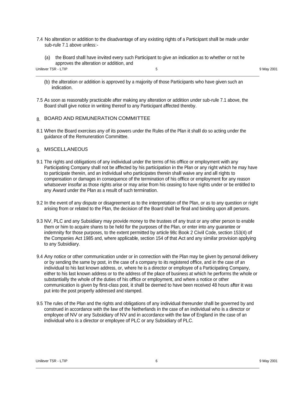 7.4 No alteration or addition to the disadvantage of any existing rights of a Participant shall be made under sub-rule 7.1 above unless:- (a) the Board shall have invited every such Participant to give an indication as to whether or not he approves the alteration or addition, and Unilever TSR - LTIP 5 9 May 2001 (b) the alteration or addition is approved by a majority of those Participants who have given such an indication. 7.5 As soon as reasonably practicable after making any alteration or addition under sub-rule 7.1 above, the Board shall give notice in writing thereof to any Participant affected thereby. 8. BOARD AND REMUNERATION COMMITTEE 8.1 When the Board exercises any of its powers under the Rules of the Plan it shall do so acting under the guidance of the Remuneration Committee. 9. MISCELLANEOUS 9.1 The rights and obligations of any individual under the terms of his office or employment with any Participating Company shall not be affected by his participation in the Plan or any right which he may have to participate therein, and an individual who participates therein shall waive any and all rights to compensation or damages in consequence of the termination of his office or employment for any reason whatsoever insofar as those rights arise or may arise from his ceasing to have rights under or be entitled to any Award under the Plan as a result of such termination. 9.2 In the event of any dispute or disagreement as to the interpretation of the Plan, or as to any question or right arising from or related to the Plan, the decision of the Board shall be final and binding upon all persons. 9.3 NV, PLC and any Subsidiary may provide money to the trustees of any trust or any other person to enable them or him to acquire shares to be held for the purposes of the Plan, or enter into any guarantee or indemnity for those purposes, to the extent permitted by article 98c Book 2 Civil Code, section 153(4) of the Companies Act 1985 and, where applicable, section 154 of that Act and any similar provision applying to any Subsidiary. 9.4 Any notice or other communication under or in connection with the Plan may be given by personal delivery or by sending the same by post, in the case of a company to its registered office, and in the case of an individual to his last known address, or, where he is a director or employee of a Participating Company, either to his last known address or to the address of the place of business at which he performs the whole or substantially the whole of the duties of his office or employment, and where a notice or other communication is given by first-class post, it shall be deemed to have been received 48 hours after it was put into the post properly addressed and stamped. 9.5 The rules of the Plan and the rights and obligations of any individual thereunder shall be governed by and construed in accordance with the law of the Netherlands in the case of an individual who is a director or employee of NV or any Subsidiary of NV and in accordance with the law of England in the case of an individual who is a director or employee of PLC or any Subsidiary of PLC. Unilever TSR - LTIP 6 9 May 2001