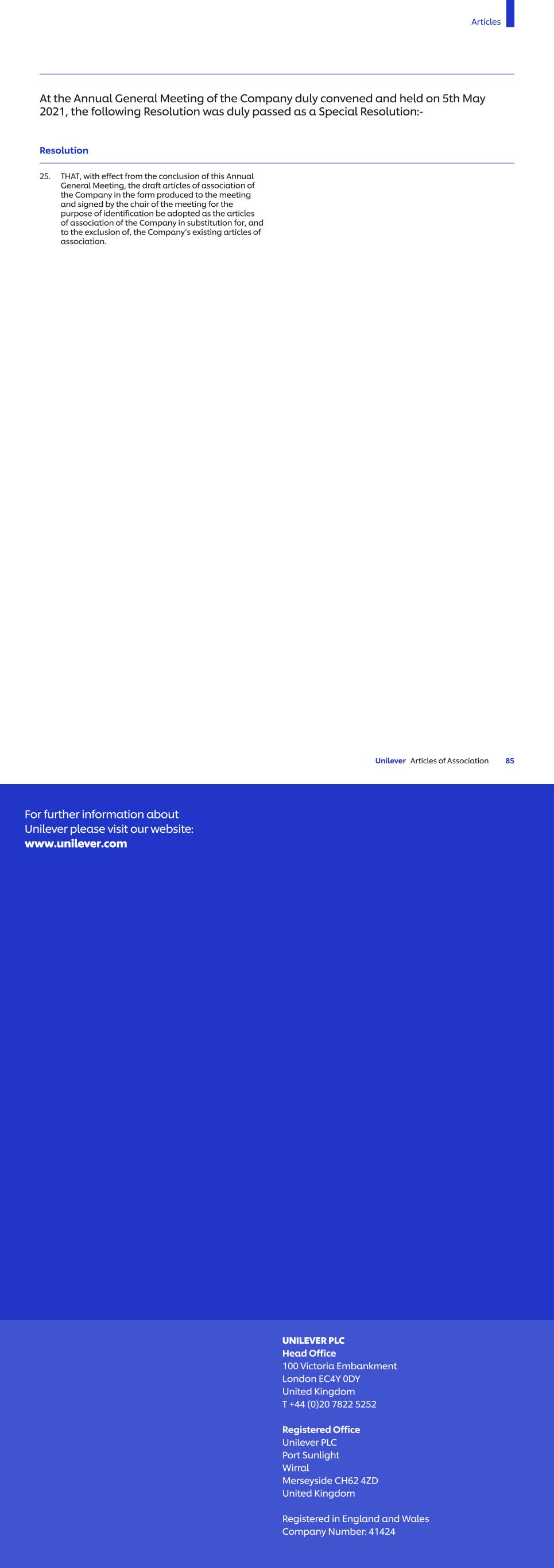 Cautionary Statement This document may contain forward-looking statements, including ‘forward-looking statements’ within the meaning of the United States Private Securities Litigation Reform Act of 1995, concerning the financial condition, results of operations and businesses of the Unilever Group (the ‘Group’). All statements other than statements of historical fact are, or may deemed to be, forward-looking statements. Words such as ‘will’, ‘aim’, ‘expects’, ‘anticipates’, ‘intends’, ‘looks’, ‘believes’, ‘vision’, ‘ambition’, ‘target’, ‘goal’, ‘plan’, ‘potential’, ‘work towards’, ‘may’, ‘milestone’, ‘objectives’, ‘outlook’, ‘probably’, ‘project’, ‘risk’, ‘seek’, ‘continue’, ‘projected’, ‘estimate’, ‘achieve’ or the negative of these terms, and other similar expressions of future performance or results and their negatives, are intended to identify such forward-looking statements. Forward-looking statements also include, but are not limited to, statements and information regarding the Group’s emissions reduction targets and other climate change related matters (including actions, potential impacts and risks associated therewith). Forward-looking statements can be made in writing but also may be made verbally by directors, officers and employees of the Group (including during management presentations) in connection with this document. These forward-looking statements are based upon current expectations and assumptions regarding anticipated developments and other factors affecting the Group. They are not historical facts, nor are they guarantees of future performance or outcomes. All forward-looking statements contained in this document are expressly qualified in their entirety by the cautionary statements contained or referred to in this section. Readers should not place undue reliance on forward-looking statements. Because these forward-looking statements involve known and unknown risks and uncertainties, a number of which may be beyond the Group's control, there are important factors that could cause actual results to differ materially from those expressed or implied by these forward-looking statements. Among other risks and uncertainties, the material or principal factors which could cause actual results to differ materially from those expressed in the forward-looking statements included in this document are: Unilever’s global brands not meeting consumer preferences; Unilever’s ability to innovate and remain competitive; Unilever’s investment choices in its portfolio management; the effect of climate change on Unilever’s business; Unilever’s ability to find sustainable solutions to its plastic packaging; significant changes or deterioration in customer relationships; the recruitment and retention of talented employees; disruptions in Unilever's supply chain and distribution; increases or volatility in the cost of raw materials and commodities; the production of safe and high quality products; secure and reliable IT infrastructure; execution of acquisitions, divestitures and business transformation projects; economic, social and political risks and natural disasters; financial risks; failure to meet high and ethical standards; and managing regulatory, tax and legal matters. Also see "Our Principal Risks" on pages 70-78 for additional risks and further discussion. The forward-looking statements are based on our beliefs, assumptions and expectations of our future performance, taking into account all information currently available to us. Forward-looking statements are not predictions of future events. These beliefs, assumptions, and expectations can change as a result of many possible events or factors, not all of which are known to us. If a change occurs, our business, financial condition, liquidity and results of operations may vary materially from those expressed in our forward-looking statements. The forward-looking statements speak only as of the date of this document. Except as required by any applicable law or regulation, the Group expressly disclaims any obligation or undertaking to release publicly any updates or revisions to any forward-looking statements contained herein to reflect any change in the Group’s expectations with regard thereto or any change in events, conditions or circumstances on which any such statement is based. New risks and uncertainties arise over time, and it is not possible for us to predict those events or how they may affect us. In addition, we cannot assess the impact of each factor on our business or the extent to which any factor, or combination of factors, may cause actual results to differ materially from those contained in any forward-looking statements. This document also contains data on the Group’s Scope 1, 2 and 3 emissions. Some of this data is based on estimates, assumptions and uncertainties. Scope 1 and 2 emissions data relates to emissions from the Group’s own activities and supplied heat, power and cooling and is generally easier for the Group to gather than Scope 3 emissions data. Scope 3 emissions relate to other organisations’ emissions and is therefore subject to a range of additional uncertainties, including that: data used to model lifecycle footprints is typically industry-standard data or estimates rather than relating to individual suppliers; and lifecycle models such as the Group’s cover many but not all products and markets. In addition, international standards and protocols relating to Scope 1, 2, and 3 emissions calculations and categorisations also continue to evolve, as do accepted norms regarding terminology such as carbon neutral and net zero which may affect the emissions data the Group reports. As Scope 3 emissions data improves, shifting over time from generic modelled data to more specific data, the data reported in this document is likely to evolve. Throughout this report, we include no