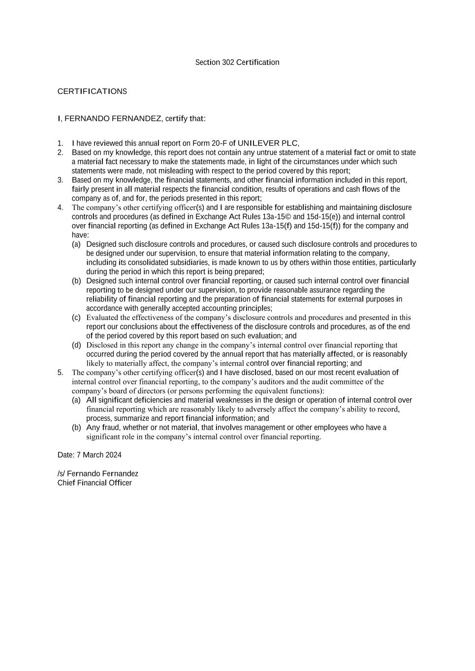 Section 302 Certification CERTIFICATIONS I, FERNANDO FERNANDEZ, certify that: 1. I have reviewed this annual report on Form 20-F of UNILEVER PLC, 2. Based on my knowledge, this report does not contain any untrue statement of a material fact or omit to state a material fact necessary to make the statements made, in light of the circumstances under which such statements were made, not misleading with respect to the period covered by this report; 3. Based on my knowledge, the financial statements, and other financial information included in this report, fairly present in all material respects the financial condition, results of operations and cash flows of the company as of, and for, the periods presented in this report; 4. The company’s other certifying officer(s) and I are responsible for establishing and maintaining disclosure controls and procedures (as defined in Exchange Act Rules 13a-15© and 15d-15(e)) and internal control over financial reporting (as defined in Exchange Act Rules 13a-15(f) and 15d-15(f)) for the company and have: (a) Designed such disclosure controls and procedures, or caused such disclosure controls and procedures to be designed under our supervision, to ensure that material information relating to the company, including its consolidated subsidiaries, is made known to us by others within those entities, particularly during the period in which this report is being prepared; (b) Designed such internal control over financial reporting, or caused such internal control over financial reporting to be designed under our supervision, to provide reasonable assurance regarding the reliability of financial reporting and the preparation of financial statements for external purposes in accordance with generally accepted accounting principles; (c) Evaluated the effectiveness of the company’s disclosure controls and procedures and presented in this report our conclusions about the effectiveness of the disclosure controls and procedures, as of the end of the period covered by this report based on such evaluation; and (d) Disclosed in this report any change in the company’s internal control over financial reporting that occurred during the period covered by the annual report that has materially affected, or is reasonably likely to materially affect, the company’s internal control over financial reporting; and 5. The company’s other certifying officer(s) and I have disclosed, based on our most recent evaluation of internal control over financial reporting, to the company’s auditors and the audit committee of the company’s board of directors (or persons performing the equivalent functions): (a) All significant deficiencies and material weaknesses in the design or operation of internal control over financial reporting which are reasonably likely to adversely affect the company’s ability to record, process, summarize and report financial information; and (b) Any fraud, whether or not material, that involves management or other employees who have a significant role in the company’s internal control over financial reporting. Date: 7 March 2024 /s/ Fernando Fernandez Chief Financial Officer