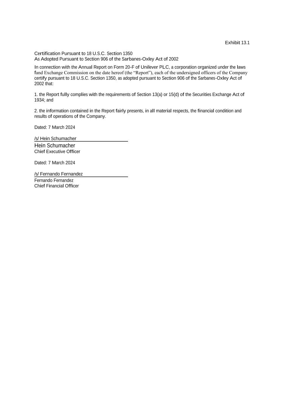 Exhibit 13.1 Certification Pursuant to 18 U.S.C. Section 1350 As Adopted Pursuant to Section 906 of the Sarbanes-Oxley Act of 2002 In connection with the Annual Report on Form 20-F of Unilever PLC, a corporation organized under the laws fand Exchange Commission on the date hereof (the “Report”), each of the undersigned officers of the Company certify pursuant to 18 U.S.C. Section 1350, as adopted pursuant to Section 906 of the Sarbanes-Oxley Act of 2002 that: 1. the Report fully complies with the requirements of Section 13(a) or 15(d) of the Securities Exchange Act of 1934; and 2. the information contained in the Report fairly presents, in all material respects, the financial condition and results of operations of the Company. Dated: 7 March 2024 /s/ Hein Schumacher Hein Schumacher Chief Executive Officer Dated: 7 March 2024 /s/ Fernando Fernandez Fernando Fernandez Chief Financial Officer
