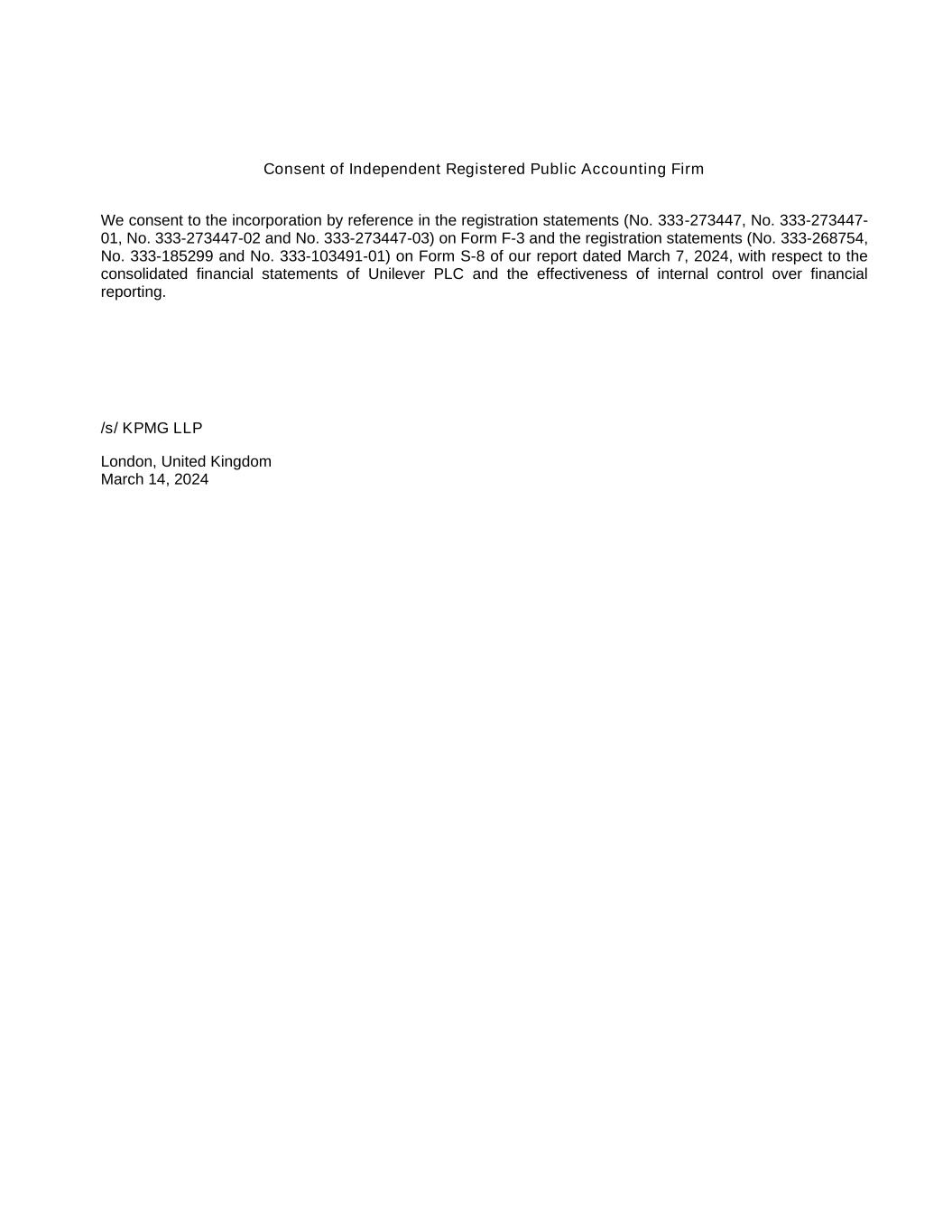 Consent of Independent Registered Public Accounting Firm We consent to the incorporation by reference in the registration statements (No. 333-273447, No. 333-273447- 01, No. 333-273447-02 and No. 333-273447-03) on Form F-3 and the registration statements (No. 333-268754, No. 333-185299 and No. 333-103491-01) on Form S-8 of our report dated March 7, 2024, with respect to the consolidated financial statements of Unilever PLC and the effectiveness of internal control over financial reporting. /s/ KPMG LLP London, United Kingdom March 14, 2024