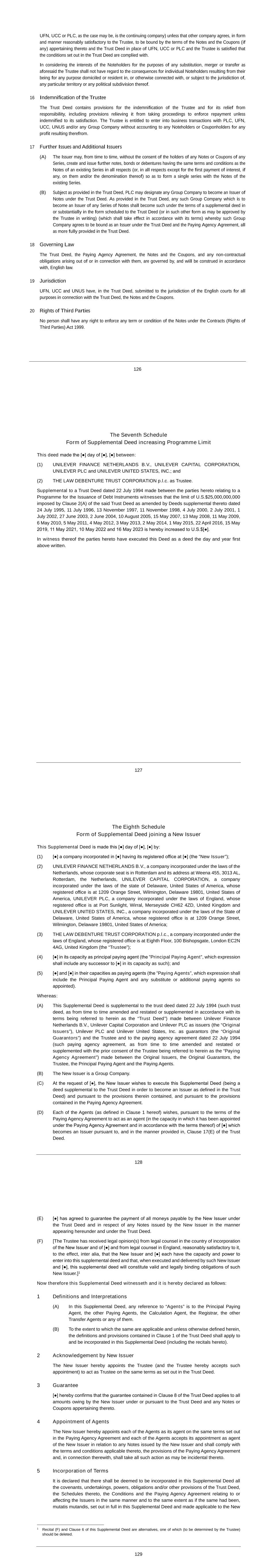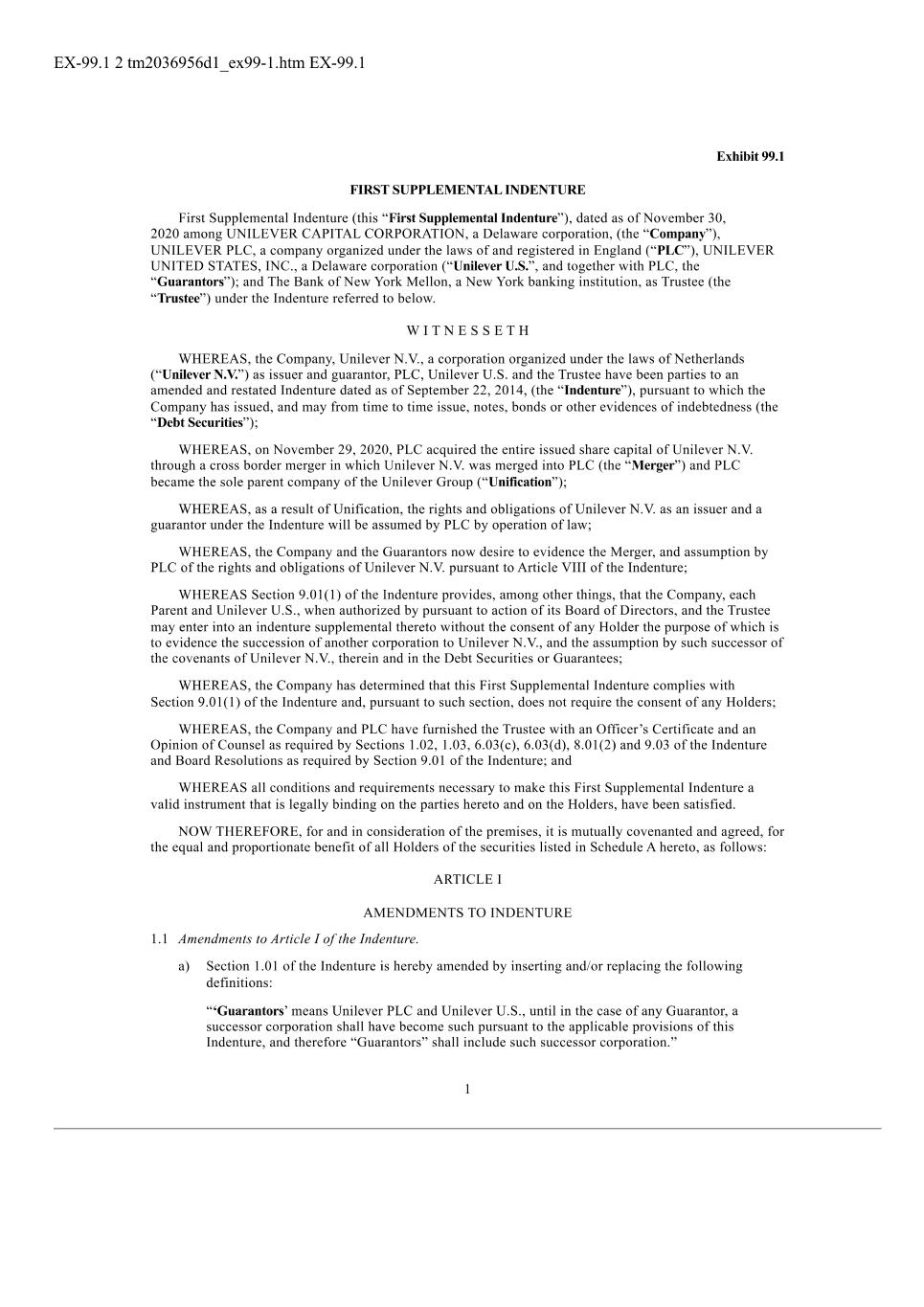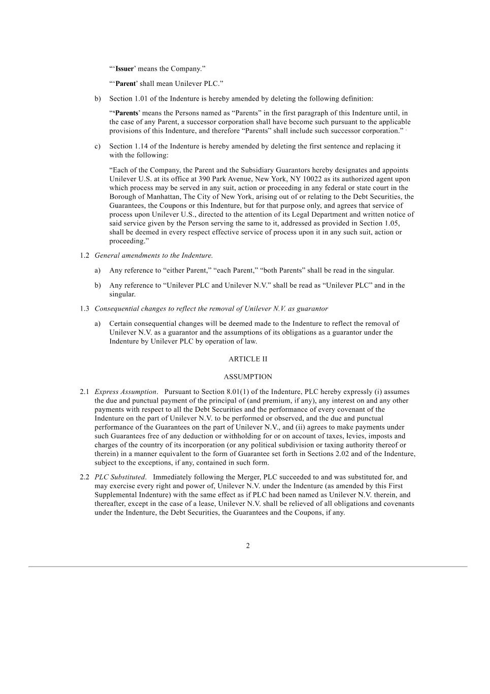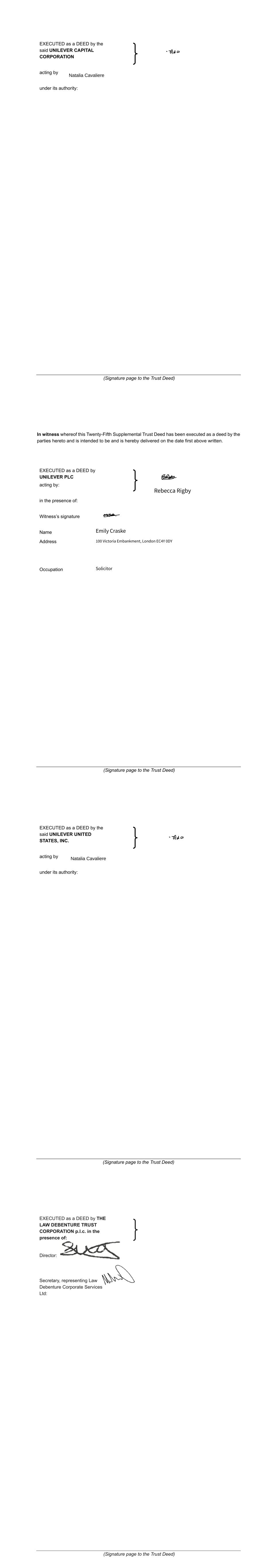 Subsidiary Guarantors and Issuers of Guaranteed Securities Each of the following securities issued by Unilever Capital Corporation (UCC), a wholly owned subsidiary of Unilever PLC (PLC), is unconditionally and fully guaranteed, jointly and severally, by PLC and Unilever United States, Inc. (UNUS), a wholly owner subsidiary of PLC: $500M 0.626% Notes due 2024 $500M 3.25% Notes due 2024 $1000M 2.6% Notes due 2024 $500M 3.1% Notes due 2025 $350M 3.375% Notes due 2025 $700M 2.0% Notes due 2026 $1000M 2.9% Notes due 2027 $700M 4.875% Notes due 2028 $1300M 3.5% Notes due 2028 $850M 2.125% Notes due 2029 €550M 3.300% Notes due 2029 $500M 1.375% Notes due 2030 $850M 1.750% Notes due 2031 $1000M 5.9% Notes due 2032 $800M 5.000% Notes due 2033 €700M 3.400% Notes due 2033 $650M 2.625% Notes due 2051