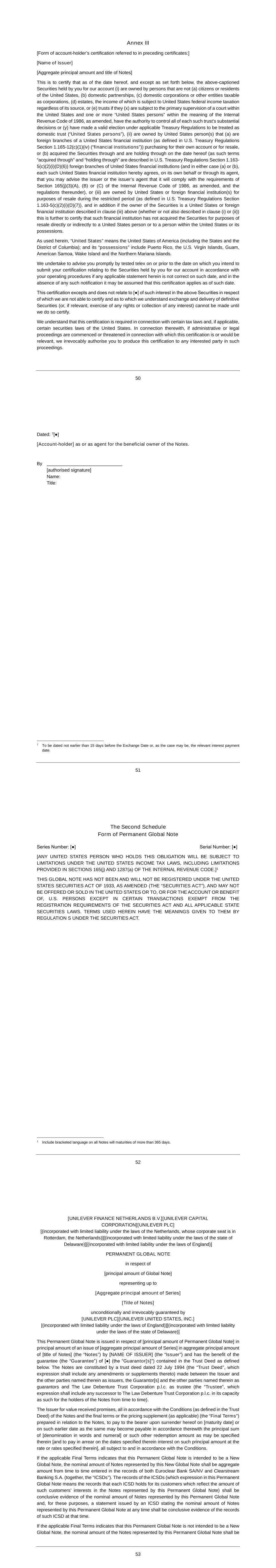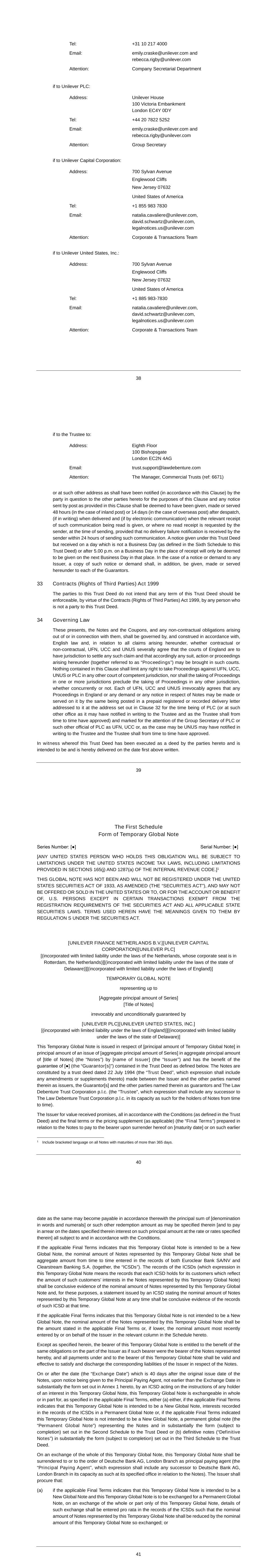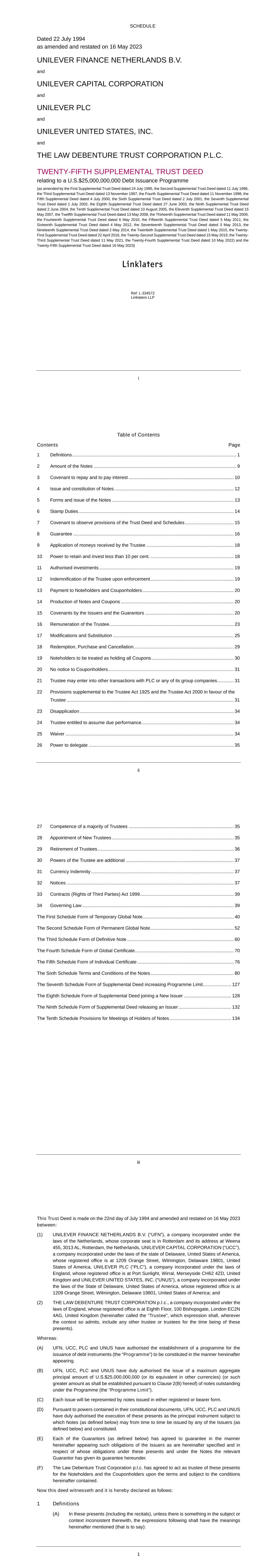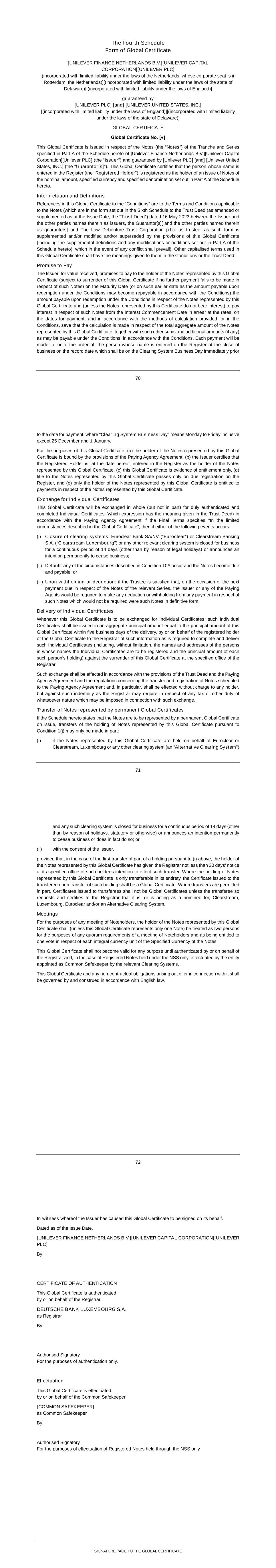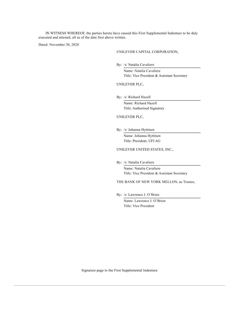 Subsidiary Guarantors and Issuers of Guaranteed Securities Each of the following securities issued by Unilever Capital Corporation (UCC), a wholly owned subsidiary of Unilever PLC (PLC), is unconditionally and fully guaranteed, jointly and severally, by PLC and Unilever United States, Inc. (UNUS), a wholly owner subsidiary of PLC: $500M 0.626% Notes due 2024 $500M 3.25% Notes due 2024 $1000M 2.6% Notes due 2024 $500M 3.1% Notes due 2025 $350M 3.375% Notes due 2025 $700M 2.0% Notes due 2026 $1000M 2.9% Notes due 2027 $700M 4.875% Notes due 2028 $1300M 3.5% Notes due 2028 $850M 2.125% Notes due 2029 €550M 3.300% Notes due 2029 $500M 1.375% Notes due 2030 $850M 1.750% Notes due 2031 $1000M 5.9% Notes due 2032 $800M 5.000% Notes due 2033 €700M 3.400% Notes due 2033 $650M 2.625% Notes due 2051