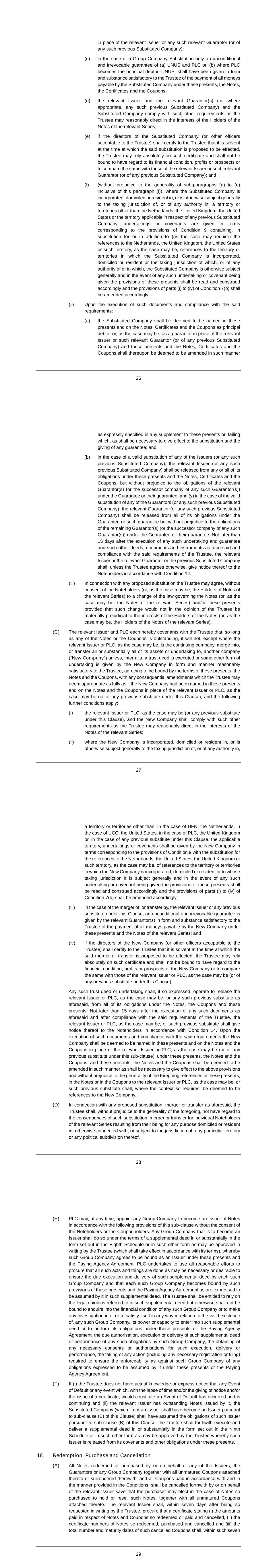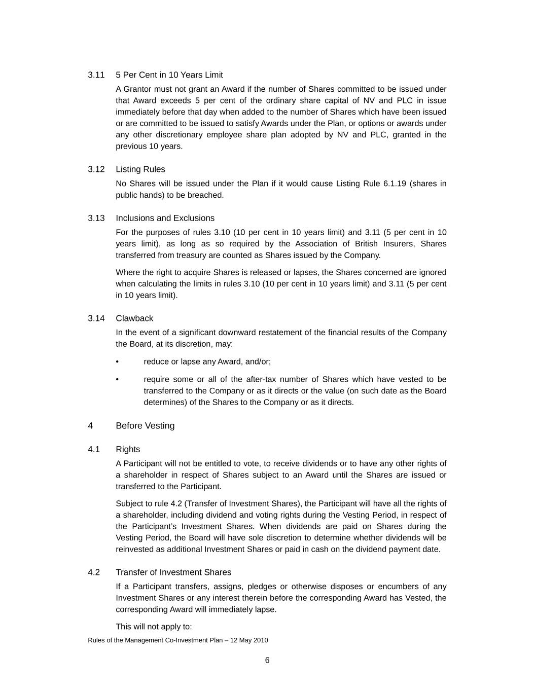 Rules of the Management Co-Investment Plan – 12 May 2010 6 3.11 5 Per Cent in 10 Years Limit A Grantor must not grant an Award if the number of Shares committed to be issued under that Award exceeds 5 per cent of the ordinary share capital of NV and PLC in issue immediately before that day when added to the number of Shares which have been issued or are committed to be issued to satisfy Awards under the Plan, or options or awards under any other discretionary employee share plan adopted by NV and PLC, granted in the previous 10 years. 3.12 Listing Rules No Shares will be issued under the Plan if it would cause Listing Rule 6.1.19 (shares in public hands) to be breached. 3.13 Inclusions and Exclusions For the purposes of rules 3.10 (10 per cent in 10 years limit) and 3.11 (5 per cent in 10 years limit), as long as so required by the Association of British Insurers, Shares transferred from treasury are counted as Shares issued by the Company. Where the right to acquire Shares is released or lapses, the Shares concerned are ignored when calculating the limits in rules 3.10 (10 per cent in 10 years limit) and 3.11 (5 per cent in 10 years limit). 3.14 Clawback In the event of a significant downward restatement of the financial results of the Company the Board, at its discretion, may: • reduce or lapse any Award, and/or; • require some or all of the after-tax number of Shares which have vested to be transferred to the Company or as it directs or the value (on such date as the Board determines) of the Shares to the Company or as it directs. 4 Before Vesting 4.1 Rights A Participant will not be entitled to vote, to receive dividends or to have any other rights of a shareholder in respect of Shares subject to an Award until the Shares are issued or transferred to the Participant. Subject to rule 4.2 (Transfer of Investment Shares), the Participant will have all the rights of a shareholder, including dividend and voting rights during the Vesting Period, in respect of the Participant’s Investment Shares. When dividends are paid on Shares during the Vesting Period, the Board will have sole discretion to determine whether dividends will be reinvested as additional Investment Shares or paid in cash on the dividend payment date. 4.2 Transfer of Investment Shares If a Participant transfers, assigns, pledges or otherwise disposes or encumbers of any Investment Shares or any interest therein before the corresponding Award has Vested, the corresponding Award will immediately lapse. This will not apply to: