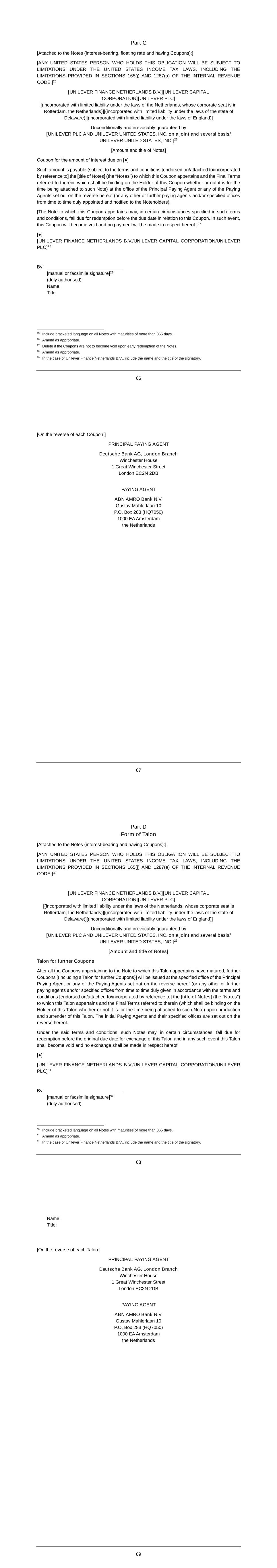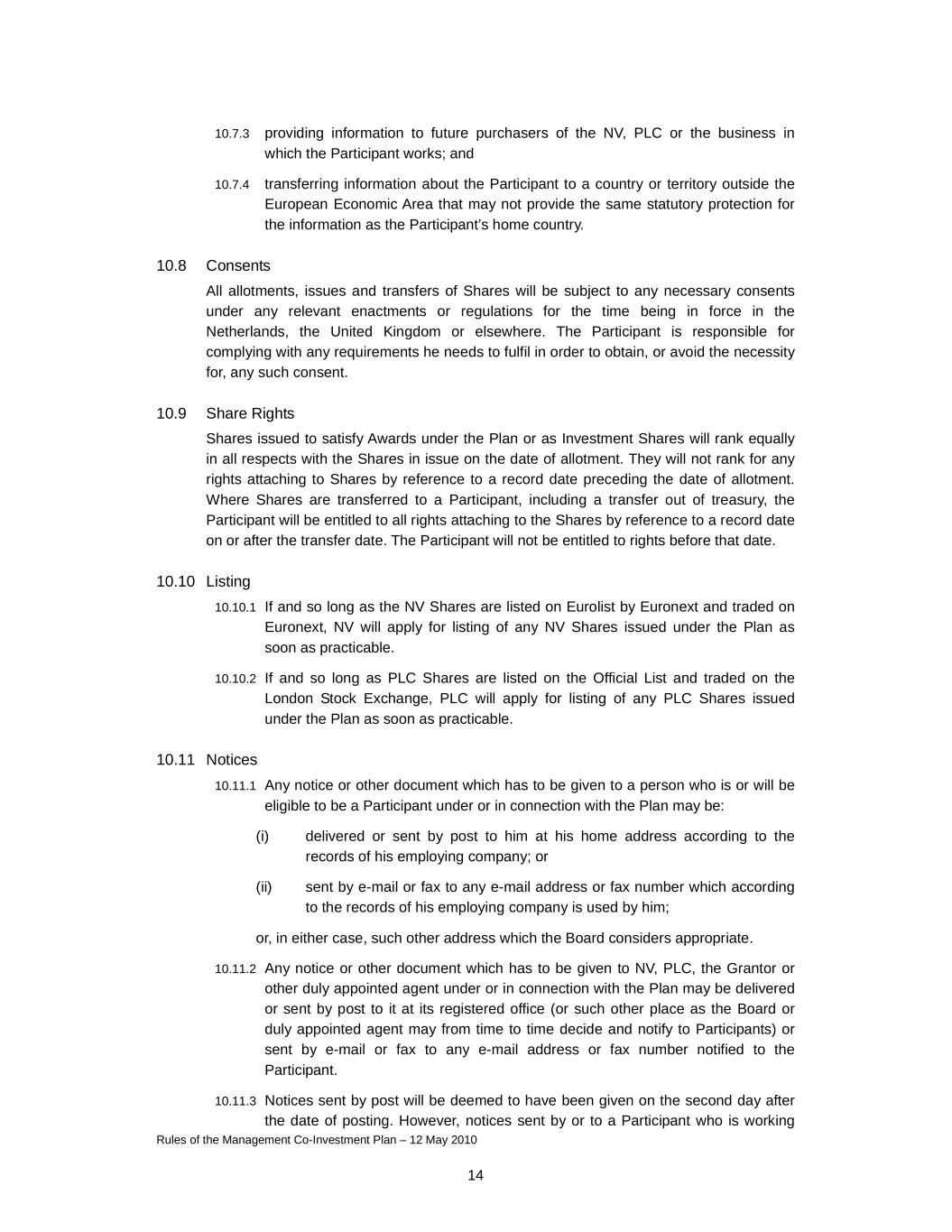 Rules of the Management Co-Investment Plan – 12 May 2010 14 10.7.3 providing information to future purchasers of the NV, PLC or the business in which the Participant works; and 10.7.4 transferring information about the Participant to a country or territory outside the European Economic Area that may not provide the same statutory protection for the information as the Participant’s home country. 10.8 Consents All allotments, issues and transfers of Shares will be subject to any necessary consents under any relevant enactments or regulations for the time being in force in the Netherlands, the United Kingdom or elsewhere. The Participant is responsible for complying with any requirements he needs to fulfil in order to obtain, or avoid the necessity for, any such consent. 10.9 Share Rights Shares issued to satisfy Awards under the Plan or as Investment Shares will rank equally in all respects with the Shares in issue on the date of allotment. They will not rank for any rights attaching to Shares by reference to a record date preceding the date of allotment. Where Shares are transferred to a Participant, including a transfer out of treasury, the Participant will be entitled to all rights attaching to the Shares by reference to a record date on or after the transfer date. The Participant will not be entitled to rights before that date. 10.10 Listing 10.10.1 If and so long as the NV Shares are listed on Eurolist by Euronext and traded on Euronext, NV will apply for listing of any NV Shares issued under the Plan as soon as practicable. 10.10.2 If and so long as PLC Shares are listed on the Official List and traded on the London Stock Exchange, PLC will apply for listing of any PLC Shares issued under the Plan as soon as practicable. 10.11 Notices 10.11.1 Any notice or other document which has to be given to a person who is or will be eligible to be a Participant under or in connection with the Plan may be: (i) delivered or sent by post to him at his home address according to the records of his employing company; or (ii) sent by e-mail or fax to any e-mail address or fax number which according to the records of his employing company is used by him; or, in either case, such other address which the Board considers appropriate. 10.11.2 Any notice or other document which has to be given to NV, PLC, the Grantor or other duly appointed agent under or in connection with the Plan may be delivered or sent by post to it at its registered office (or such other place as the Board or duly appointed agent may from time to time decide and notify to Participants) or sent by e-mail or fax to any e-mail address or fax number notified to the Participant. 10.11.3 Notices sent by post will be deemed to have been given on the second day after the date of posting. However, notices sent by or to a Participant who is working
