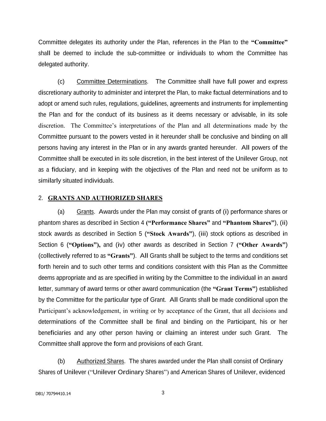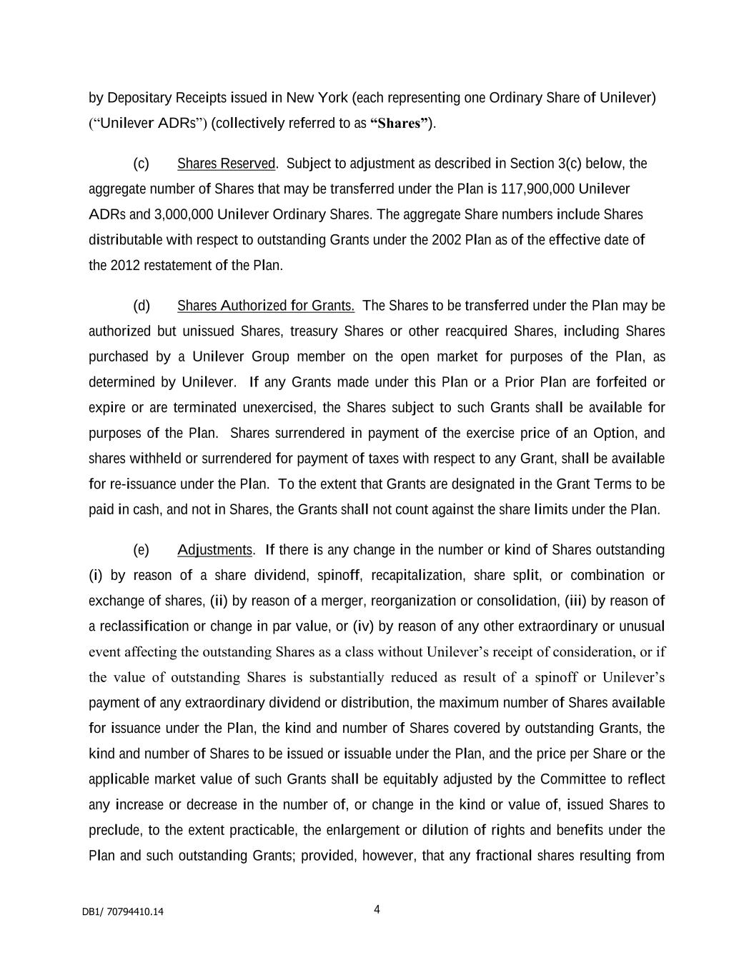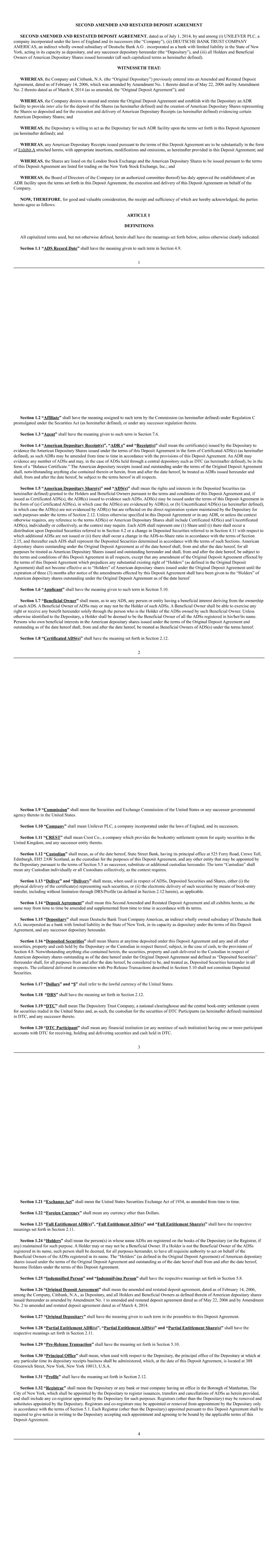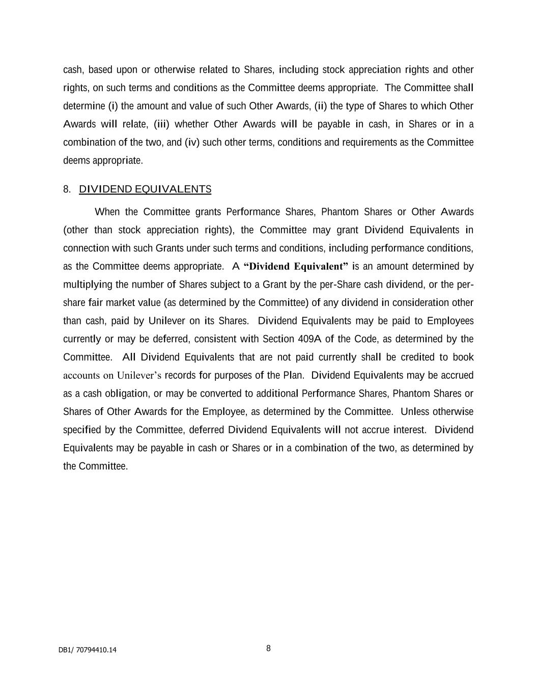 2 “Dealing Restrictions” means any restriction on dealing in securities imposed by regulation, statute, order, directive, the rules of any stock exchange on which Shares are listed or any code adopted by the Company as varied from time to time; “Detrimental Activity” means, as established to the satisfaction of the Board, and without the prior written consent of the Company, the Participant being in breach of any applicable restrictions on competition, solicitation or the use of confidential information (whether arising out of the Participant’s employment contract, his termination arrangements or any internal policies); “Dividend Equivalent” means an amount linked to dividends paid on Shares subject to the Award; “Euronext” means Euronext Amsterdam; “Final Lapse Date” means the latest date on which an Option will lapse which will be the date set by the Board under rule 3.3 or, if no date is set, the date 10 years after the Award Date; “Forfeitable Share Agreement” means the agreement referred to in rule 4.2; “Forfeitable Shares” means Shares held in the name of or for the benefit of a Participant subject to the Forfeitable Share Agreement; “Grantor” means the Company or any other entity which grants or has agreed with the Company to satisfy an Award under the Plan; “Group” means the Company and its Subsidiaries or associated companies and “Member of the Group” shall be construed accordingly; “London Stock Exchange” means London Stock Exchange plc; “Option” means a right to acquire Shares granted under the Plan; “Option Price” means the amount (which may be zero) payable on the exercise of an Option set by the Board under rule 3.3.8; “Owned Shares” means Shares subject to a Retention Period which are transferred or issued into the beneficial ownership of the Participant as set out in rule 7.1.1(ii); “Participant” means a person who holds, or who has held, an Award or their personal representatives; “Performance Condition” means any condition linked to performance imposed under rule 3.3; “Plan” means these rules known as “The Unilever Share Plan 2017”, as changed from time to time; “Retention Period” means the period after Vesting during which a Participant is required to retain their Shares or Award as set out in rule 7; “Retention Shares” means the Shares which the Participant is required to retain during the Retention Period; “Shares” means fully paid ordinary shares in the Company and includes: (i) American Depositary Shares listed on the New York Stock Exchange; and