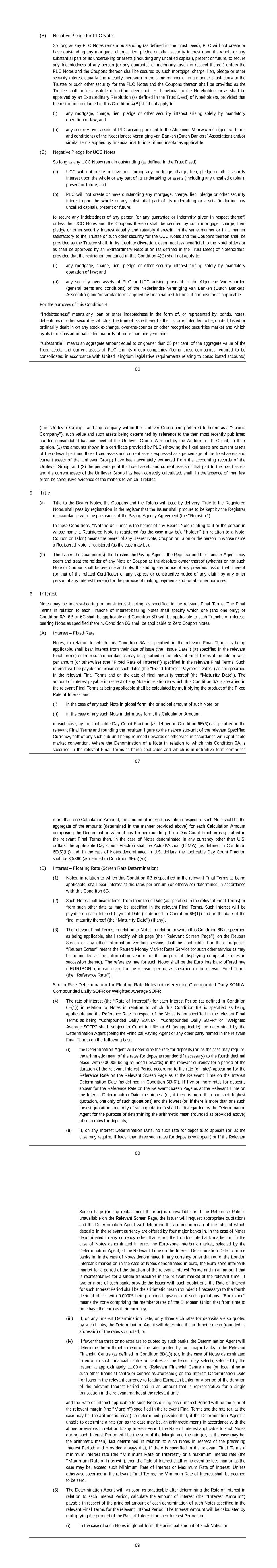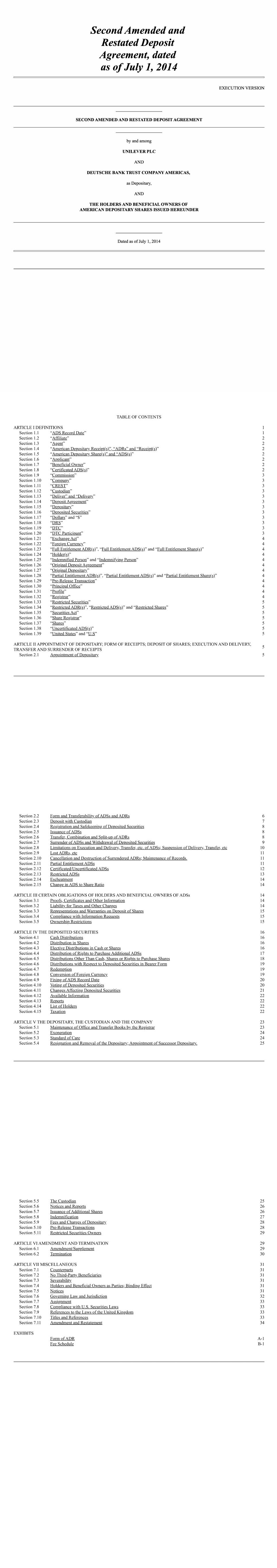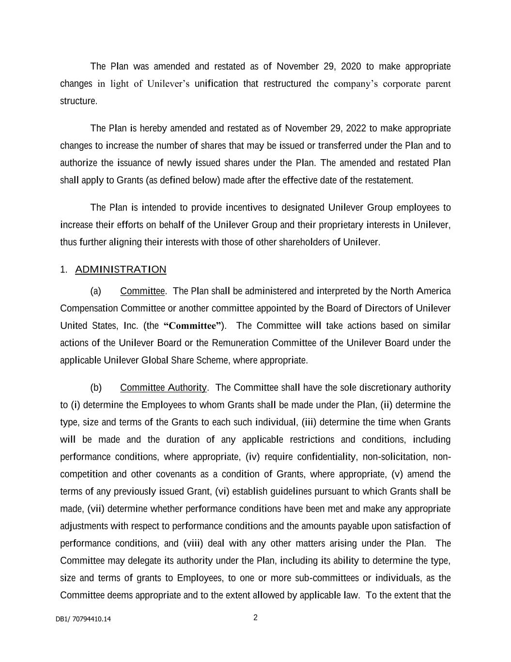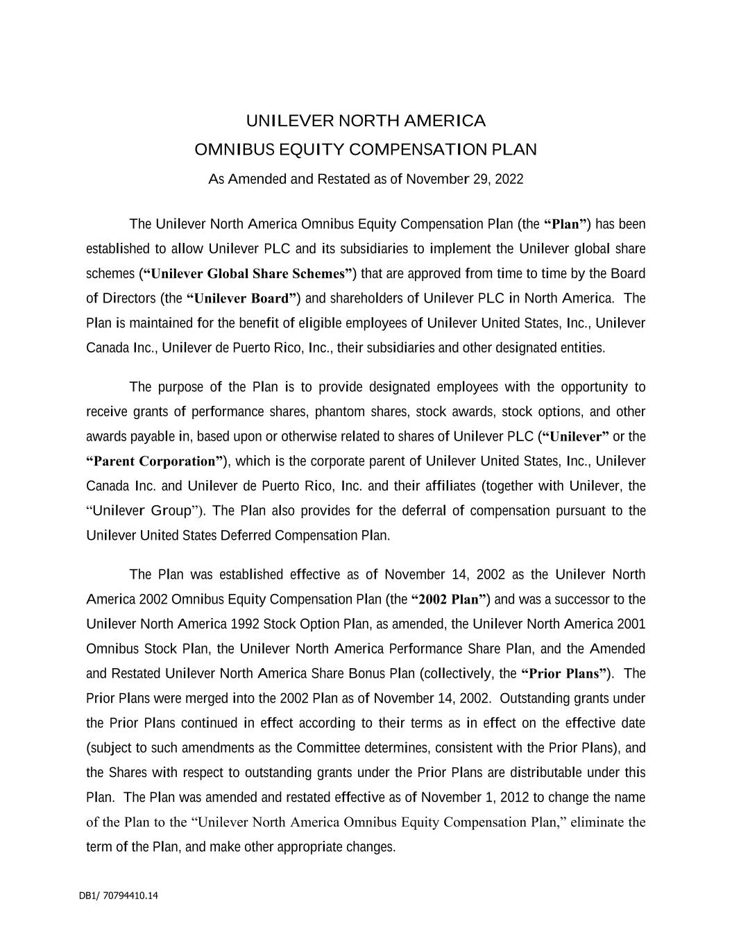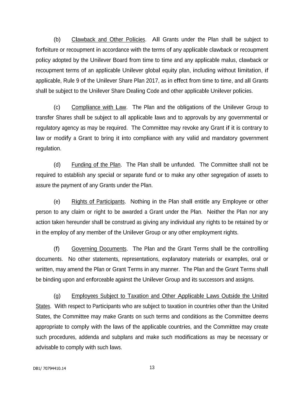 2 “Dealing Restrictions” means any restriction on dealing in securities imposed by regulation, statute, order, directive, the rules of any stock exchange on which Shares are listed or any code adopted by the Company as varied from time to time; “Detrimental Activity” means, as established to the satisfaction of the Board, and without the prior written consent of the Company, the Participant being in breach of any applicable restrictions on competition, solicitation or the use of confidential information (whether arising out of the Participant’s employment contract, his termination arrangements or any internal policies); “Dividend Equivalent” means an amount linked to dividends paid on Shares subject to the Award; “Euronext” means Euronext Amsterdam; “Final Lapse Date” means the latest date on which an Option will lapse which will be the date set by the Board under rule 3.3 or, if no date is set, the date 10 years after the Award Date; “Forfeitable Share Agreement” means the agreement referred to in rule 4.2; “Forfeitable Shares” means Shares held in the name of or for the benefit of a Participant subject to the Forfeitable Share Agreement; “Grantor” means the Company or any other entity which grants or has agreed with the Company to satisfy an Award under the Plan; “Group” means the Company and its Subsidiaries or associated companies and “Member of the Group” shall be construed accordingly; “London Stock Exchange” means London Stock Exchange plc; “Option” means a right to acquire Shares granted under the Plan; “Option Price” means the amount (which may be zero) payable on the exercise of an Option set by the Board under rule 3.3.8; “Owned Shares” means Shares subject to a Retention Period which are transferred or issued into the beneficial ownership of the Participant as set out in rule 7.1.1(ii); “Participant” means a person who holds, or who has held, an Award or their personal representatives; “Performance Condition” means any condition linked to performance imposed under rule 3.3; “Plan” means these rules known as “The Unilever Share Plan 2017”, as changed from time to time; “Retention Period” means the period after Vesting during which a Participant is required to retain their Shares or Award as set out in rule 7; “Retention Shares” means the Shares which the Participant is required to retain during the Retention Period; “Shares” means fully paid ordinary shares in the Company and includes: (i) American Depositary Shares listed on the New York Stock Exchange; and