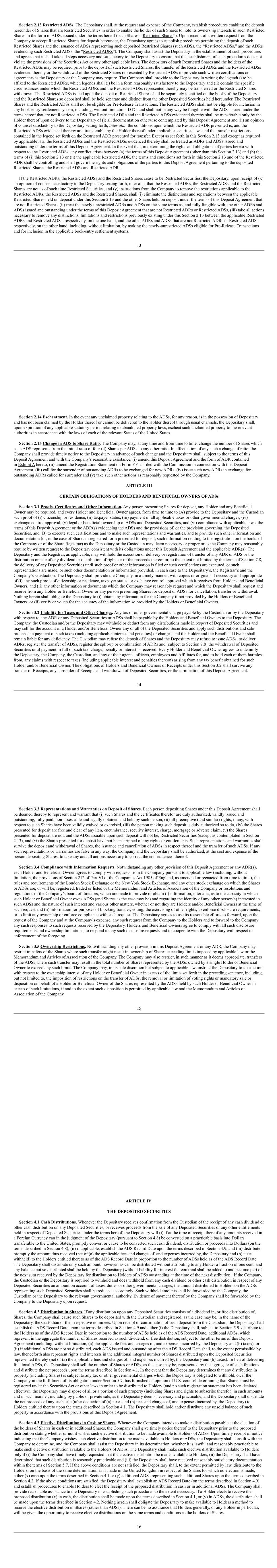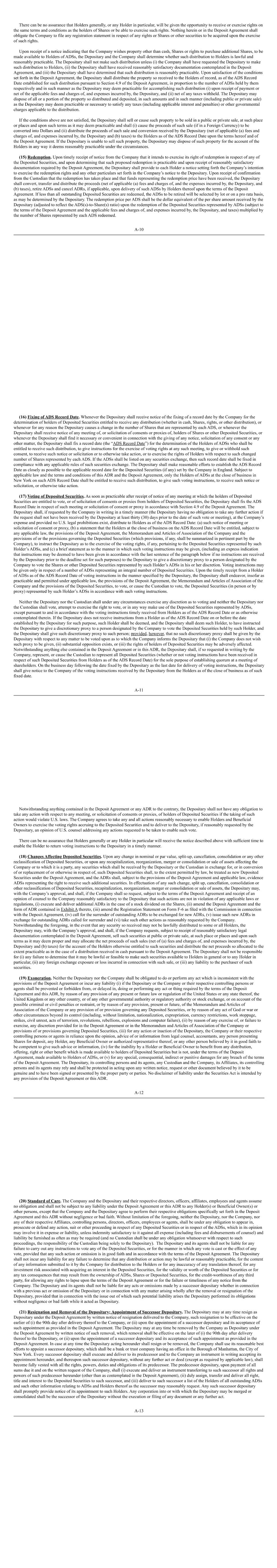 15 11.1.2 The Board will determine the extent to which any Performance Condition has been satisfied to the date of the takeover (in accordance with its terms or, if they do not provide for it, in such manner as it considers reasonable) and the proportion of the Award which will Vest. 11.1.3 The Board may decide that an Award which has Vested under rule 11.1.1 will be reduced pro rata to reflect the acceleration of Vesting. 11.1.4 To the extent that an Award has not Vested, it shall lapse as to the balance, unless exchanged under rule 11.4 (Exchange of Awards). 11.1.5 An Option will be exercisable for a period of one month from the date of the takeover, after which it will lapse (whether or not it Vested under this rule). 11.1.6 An Award will not Vest under rule 11.1.1 but will be exchanged under rule 11.4 (Exchange of Awards) if: (i) an offer to exchange Awards is made and accepted by a Participant; or (ii) the Board, with the consent of the Acquiring Company, decides before the person obtains Control that the Awards will be automatically exchanged. There is a “takeover” when: (i) a person (or a group of persons acting in concert) obtains Control of the Company as a result of making an offer to acquire Shares; or (ii) under Section 895 of the Companies Act 2006, a court sanctions a compromise or arrangement in connection with the acquisition of Shares, but not where the Board determines rule 11.2 (Reconstruction) applies. 11.2 Reconstruction If there is any internal reconstruction, reorganisation, merger or acquisition of the Company which: 11.2.1 is not intended to result in; or 11.2.2 does not involve a significant change in the identity of the ultimate shareholders of the Company, the Board may determine this rule 11.2 applies to any Awards which have not Vested by the day the reconstruction takes effect. The Board will arrange for the Awards to be replaced by an equivalent award of shares in the new parent company or companies as determined by the Board. The Board may amend (or waive) any Performance Condition as it considers appropriate, subject to applicable laws. 11.3 Demerger or Other Corporate Event 11.3.1 If the Board becomes aware that the Company is or is expected to be affected by any demerger, distribution (other than an ordinary dividend), reconstruction or other transaction not falling within rule 11.1 (Takeover) which, in the opinion of the Board, would affect the current or future value of any Award, the Board may allow an Award to Vest (subject to rule 9 (Malus and clawback) and any such conditions as the Board may decide to impose.