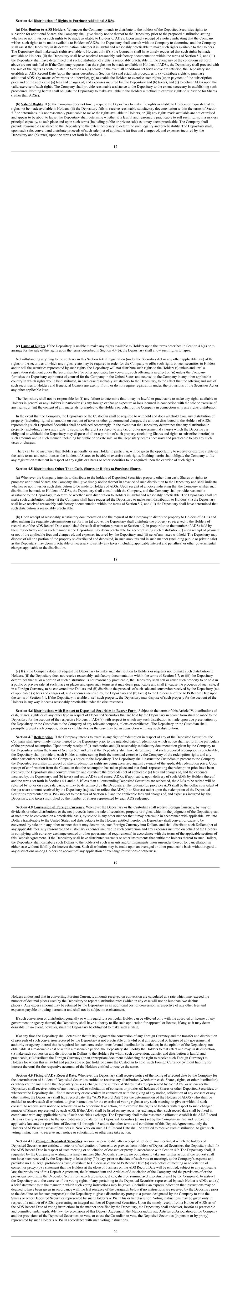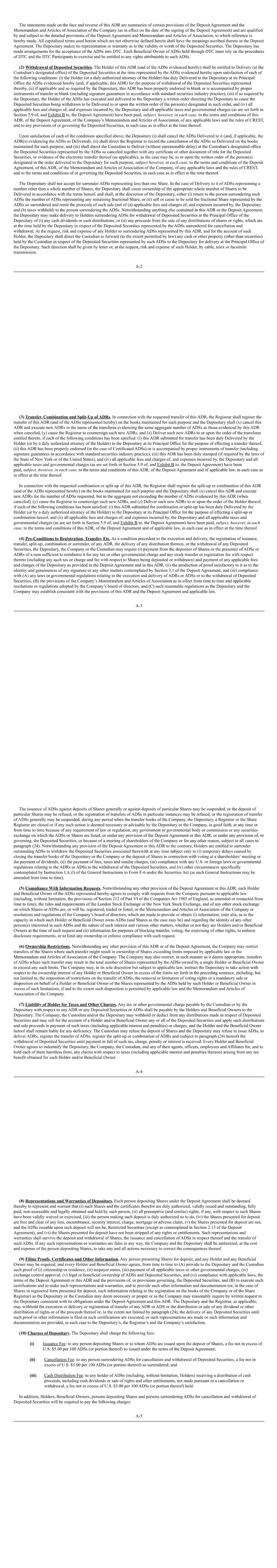 20 15.7 Share rights Shares issued to satisfy Awards under the Plan will rank equally in all respects with the Shares in issue on the date of allotment. They will not rank for any rights attaching to Shares by reference to a record date preceding the date of allotment. Where Shares are transferred to a Participant, including a transfer out of treasury, the Participant will be entitled to all rights attaching to the Shares by reference to a record date on or after the transfer date. The Participant will not be entitled to rights before that date. 15.8 Listing 15.8.1 If and for so long as the Shares are listed on Eurolist by Euronext and traded on Euronext, the Company will apply for listing of any Shares issued under the Plan as soon as practicable. 15.8.2 If and for so long as Shares are listed on the Official List and traded on the London Stock Exchange, the Company will apply for listing of any Shares issued under the Plan as soon as practicable. 15.9 Notices 15.9.1 Any information or notice to a person who is or will be eligible to be a Participant under or in connection with the Plan may be posted, or sent by electronic means, in such manner to such address as the Company considers appropriate, including publication on any intranet. 15.9.2 Any information or notice to the Company or other duly appointed agent under or in connection with the Plan may be sent by post or transmitted to it at its registered office or such other place, and by such other means, as the Board or duly appointed agent may decide and notify Participants. 15.9.3 Notices sent by post will be deemed to have been given on the second day after the date of posting. However, notices sent by or to a Participant who is working overseas will be deemed to have been given on the seventh day after the date of posting. Notices sent by electronic means, in the absence of evidence to the contrary, will be deemed to have been received on the day after sending. 15.10 Governing law and jurisdiction English law governs the Plan and the English Courts have non-exclusive jurisdiction in respect of any disputes arising.