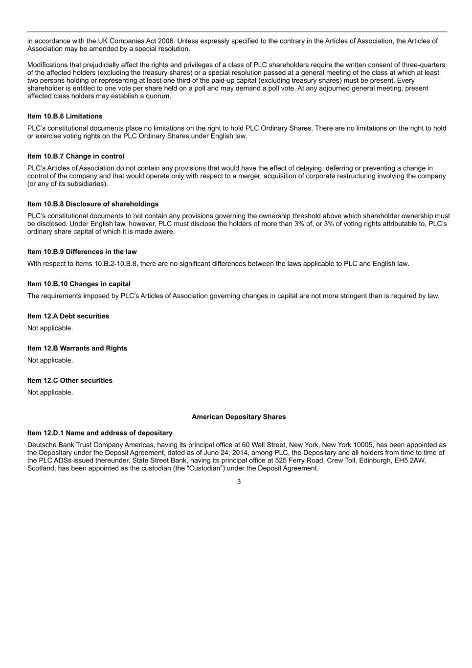 17 12.2 Shareholder approval 12.2.1 Except as described in rule 12.2.2, the Company in a general meeting must approve in advance by ordinary resolution any proposed change to the Plan to the advantage of present or future Participants, which relates to: (i) eligibility; (ii) the limits on the number of Shares which may be issued under the Plan; (iii) any individual limit for each Participant under the Plan; (iv) the basis for determining a Participant’s entitlement to, and the terms of, securities, cash or other benefit to be provided and for the adjustment thereof (if any) if there is a capitalisation issue, rights issue or open offer, sub-division or consolidation of shares or reduction of capital or any other variation of capital; or (v) the terms of this rule 12.2.1. 12.2.2 The Board can change the Plan and need not obtain the approval of the Company in general meeting for any changes to a Performance Condition or other condition in accordance with rule 3.4 or for minor changes: (i) to benefit the administration of the Plan; (ii) to comply with or take account of the provisions of any proposed or existing legislation; (iii) to take account of any changes to legislation; or (iv) to obtain or maintain favourable tax, exchange control or regulatory treatment of the Company, any Subsidiary or any present or future Participant. 12.2.3 The Board may, without obtaining the approval of the Company in general meeting, establish further plans (by way of schedules to the rules or otherwise) based on the rules, but modified to take account of local tax, exchange control or securities law in non-UK territories. However, any Shares made available under such plans are treated as counting against any limits on individual or overall participation in the Plan under rule 13. 12.3 Notice The Board is not required to give Participants notice of any changes. 13 Tax The Participant will be responsible for all taxes, social security contributions or other levies arising in connection with an Award and will, if required to do so, agree the transfer of liability for employer social security contributions to him. The Company, any employing company or trustee of any employee benefit trust, may withhold any amounts or make such arrangements as it considers necessary to meet any liability to pay or account for any such taxation or social security contributions or other levies. These arrangements may include the sale of or reduction in number of Shares to which a