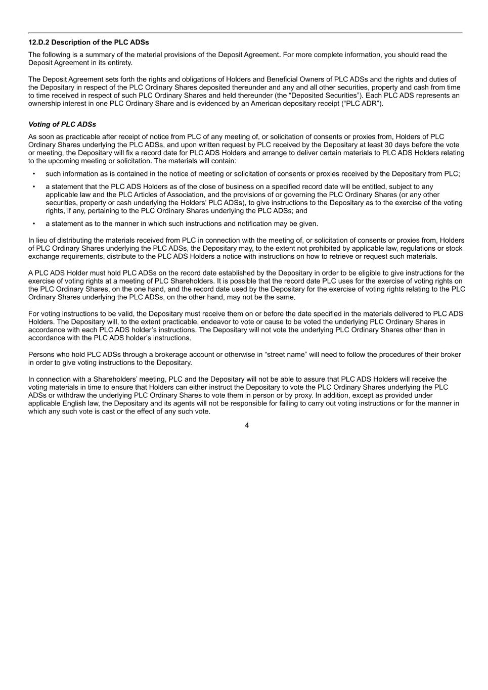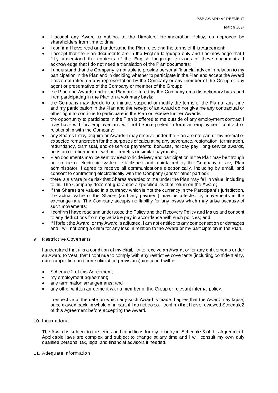 PSP AWARD AGREEMENT March 2024 • I accept any Award is subject to the Directors’ Remuneration Policy, as approved by shareholders from time to time; • I confirm I have read and understand the Plan rules and the terms of this Agreement; • I accept that the Plan documents are in the English language only and I acknowledge that I fully understand the contents of the English language versions of these documents. I acknowledge that I do not need a translation of the Plan documents; • I understand that the Company is not able to provide personal financial advice in relation to my participation in the Plan and in deciding whether to participate in the Plan and accept the Award I have not relied on any representation by the Company or any member of the Group or any agent or presentative of the Company or member of the Group); • the Plan and Awards under the Plan are offered by the Company on a discretionary basis and I am participating in the Plan on a voluntary basis; • the Company may decide to terminate, suspend or modify the terms of the Plan at any time and my participation in the Plan and the receipt of an Award do not give me any contractual or other right to continue to participate in the Plan or receive further Awards; • the opportunity to participate in the Plan is offered to me outside of any employment contract I may have with my employer and will not be interpreted to form an employment contract or relationship with the Company; • any Shares I may acquire or Awards I may receive under the Plan are not part of my normal or expected remuneration for the purposes of calculating any severance, resignation, termination, redundancy, dismissal, end-of-service payments, bonuses, holiday pay, long-service awards, pension or retirement or welfare benefits or similar payments; • Plan documents may be sent by electronic delivery and participation in the Plan may be through an on-line or electronic system established and maintained by the Company or any Plan administrator. I agree to receive all communications electronically, including by email, and consent to contracting electronically with the Company (and/or other parties); • there is a share price risk that Shares awarded to me under the Plan may fall in value, including to nil. The Company does not guarantee a specified level of return on the Award; • if the Shares are valued in a currency which is not the currency in the Participant’s jurisdiction, the actual value of the Shares (and any payment) may be affected by movements in the exchange rate. The Company accepts no liability for any losses which may arise because of such movements; • I confirm I have read and understood the Policy and the Recovery Policy and Malus and consent to any deductions from my variable pay in accordance with such policies; and • if I forfeit the Award, or my Award is adjusted, I am not entitled to any compensation or damages and I will not bring a claim for any loss in relation to the Award or my participation in the Plan. 9. Restrictive Covenants I understand that it is a condition of my eligibility to receive an Award, or for any entitlements under an Award to Vest, that I continue to comply with any restrictive covenants (including confidentiality, non-competition and non-solicitation provisions) contained within: • Schedule 2 of this Agreement; • my employment agreement; • any termination arrangements; and • any other written agreement with a member of the Group or relevant internal policy, irrespective of the date on which any such Award is made. I agree that the Award may lapse, or be clawed back, in whole or in part, if I do not do so. I confirm that I have reviewed Schedule2 of this Agreement before accepting the Award. 10. International The Award is subject to the terms and conditions for my country in Schedule 3 of this Agreement. Applicable laws are complex and subject to change at any time and I will consult my own duly qualified personal tax, legal and financial advisors if needed. 11. Adequate Information