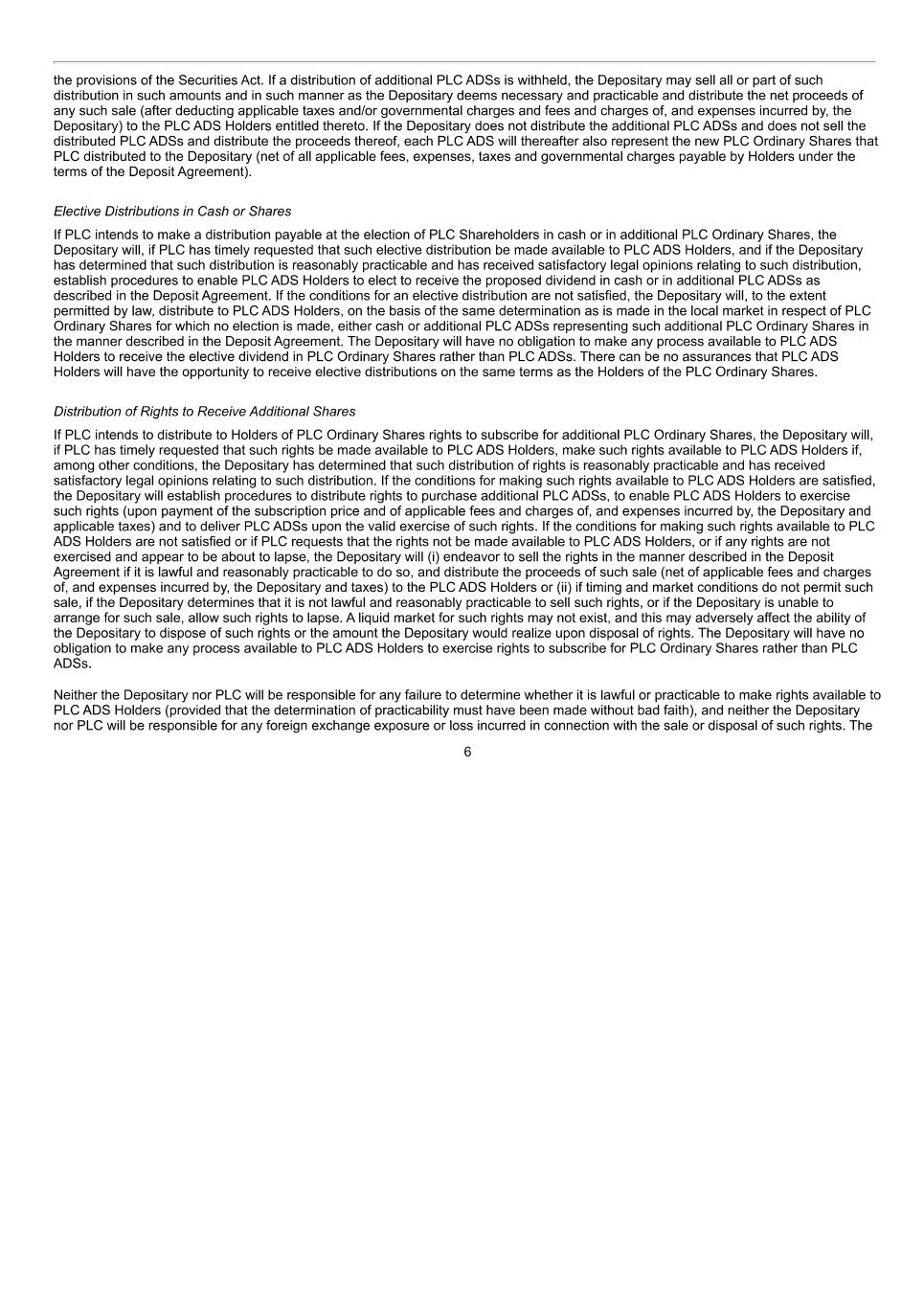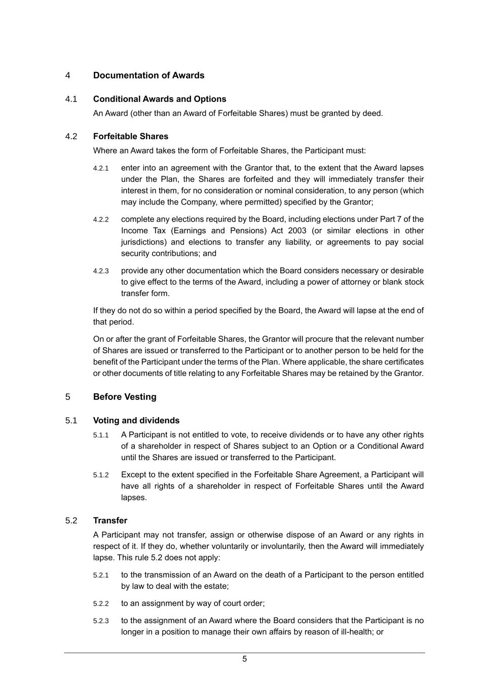 5 4 Documentation of Awards 4.1 Conditional Awards and Options An Award (other than an Award of Forfeitable Shares) must be granted by deed. 4.2 Forfeitable Shares Where an Award takes the form of Forfeitable Shares, the Participant must: 4.2.1 enter into an agreement with the Grantor that, to the extent that the Award lapses under the Plan, the Shares are forfeited and they will immediately transfer their interest in them, for no consideration or nominal consideration, to any person (which may include the Company, where permitted) specified by the Grantor; 4.2.2 complete any elections required by the Board, including elections under Part 7 of the Income Tax (Earnings and Pensions) Act 2003 (or similar elections in other jurisdictions) and elections to transfer any liability, or agreements to pay social security contributions; and 4.2.3 provide any other documentation which the Board considers necessary or desirable to give effect to the terms of the Award, including a power of attorney or blank stock transfer form. If they do not do so within a period specified by the Board, the Award will lapse at the end of that period. On or after the grant of Forfeitable Shares, the Grantor will procure that the relevant number of Shares are issued or transferred to the Participant or to another person to be held for the benefit of the Participant under the terms of the Plan. Where applicable, the share certificates or other documents of title relating to any Forfeitable Shares may be retained by the Grantor. 5 Before Vesting 5.1 Voting and dividends 5.1.1 A Participant is not entitled to vote, to receive dividends or to have any other rights of a shareholder in respect of Shares subject to an Option or a Conditional Award until the Shares are issued or transferred to the Participant. 5.1.2 Except to the extent specified in the Forfeitable Share Agreement, a Participant will have all rights of a shareholder in respect of Forfeitable Shares until the Award lapses. 5.2 Transfer A Participant may not transfer, assign or otherwise dispose of an Award or any rights in respect of it. If they do, whether voluntarily or involuntarily, then the Award will immediately lapse. This rule 5.2 does not apply: 5.2.1 to the transmission of an Award on the death of a Participant to the person entitled by law to deal with the estate; 5.2.2 to an assignment by way of court order; 5.2.3 to the assignment of an Award where the Board considers that the Participant is no longer in a position to manage their own affairs by reason of ill-health; or