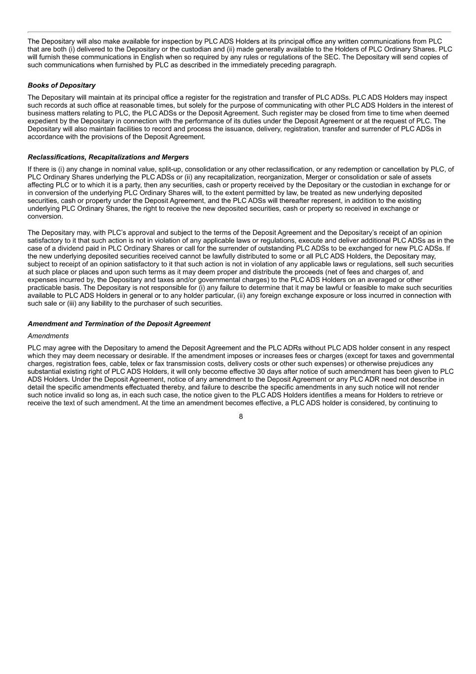 that it is not exercised within that period shall (notwithstanding any other provision of the Scheme) lapse on the expiration thereof. 7. Variation of Capital (1) In the event of any increase or variation of the share capital of the Company (whenever effected), the Board may make such adjustments as it considers appropriate under sub-rule (2) below. (2) An adjustment made under this sub-rule shall be to one or more of the following:- (a) the number of shares in respect of which any Option may be exercised; (b) the price at which shares may be acquired by the exercise of any such Option; (c) where any such Option has been exercised but no shares have been allotted or transferred pursuant to such exercise, the number of shares which may be so allotted or transferred and the price at which they may be acquired. (3) An adjustment under sub-rule (2) above may have the effect of reducing the price at which shares in the Company may be acquired by the exercise of an Option to less than their nominal value, but only if and to the extent that the Board shall be authorised to capitalise from the reserves of the Company a sum equal to the amount by which the nominal value of the shares in respect of which the Option is exercised and which are to be allotted pursuant to such exercise exceeds the price at which the same may be subscribed for and to apply such sum in paying up such amount on such shares; and so that on exercise of any Option in respect of which such a reduction shall have been made the Board shall capitalise such sum (if any) and apply the same in paying up such amount as aforesaid. (4) As soon as reasonably practicable after making any adjustment under sub-rule (2) above, the Board shall give notice in writing thereof to any Participant affected thereby. 8. Alterations (1) Subject to sub-rules (2) and (4) below, the Board may at any time alter or add to all or any of the provisions of the Scheme, or the terms of any Option granted under it, in any respect. (2) Subject to sub-rule (3) below, no alteration or addition to the advantage of Participants shall be made under sub-rule (1) above to any of Rules 2(1), 3, 7(1) and 7(2) without the prior approval by ordinary resolution of the members of the Company in general meeting. (3) Sub-rule (2) above shall not apply:- (a) to any minor alteration or addition to benefit the administration of the Scheme, to take account of a change in legislation or to obtain or maintain favourable tax, exchange control or regulatory treatment for Participants or any Participating Company, or PLC Scheme Rules 7 November 2001 (b) to any alteration or addition solely relating to a special term specified by the Board. (4) No alteration or addition to the disadvantage of any Participant shall be made under sub-rule (1) above unless:- (a) the Board shall have invited every such Participant to give an indication as to whether or not he approves the alteration or addition, and