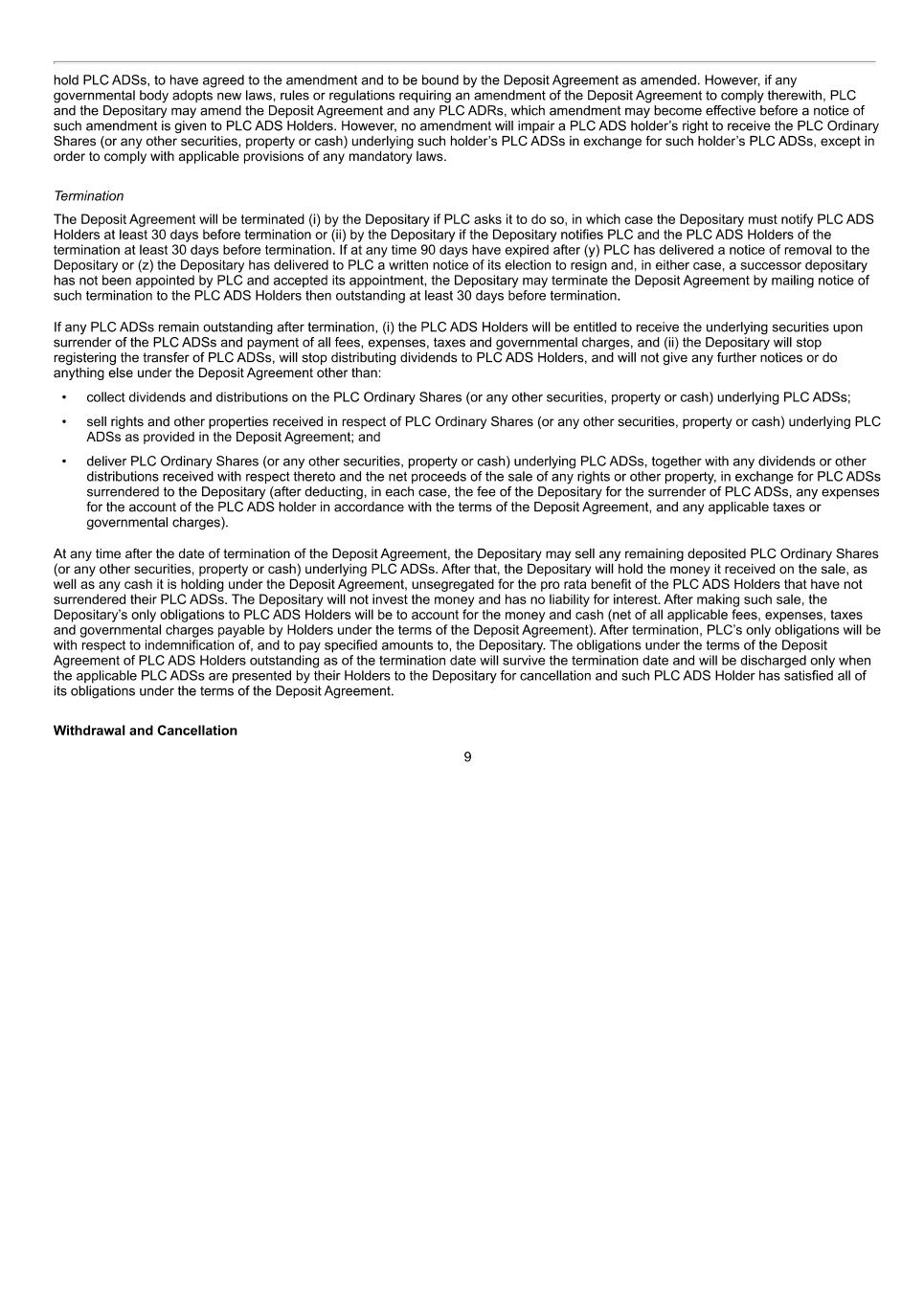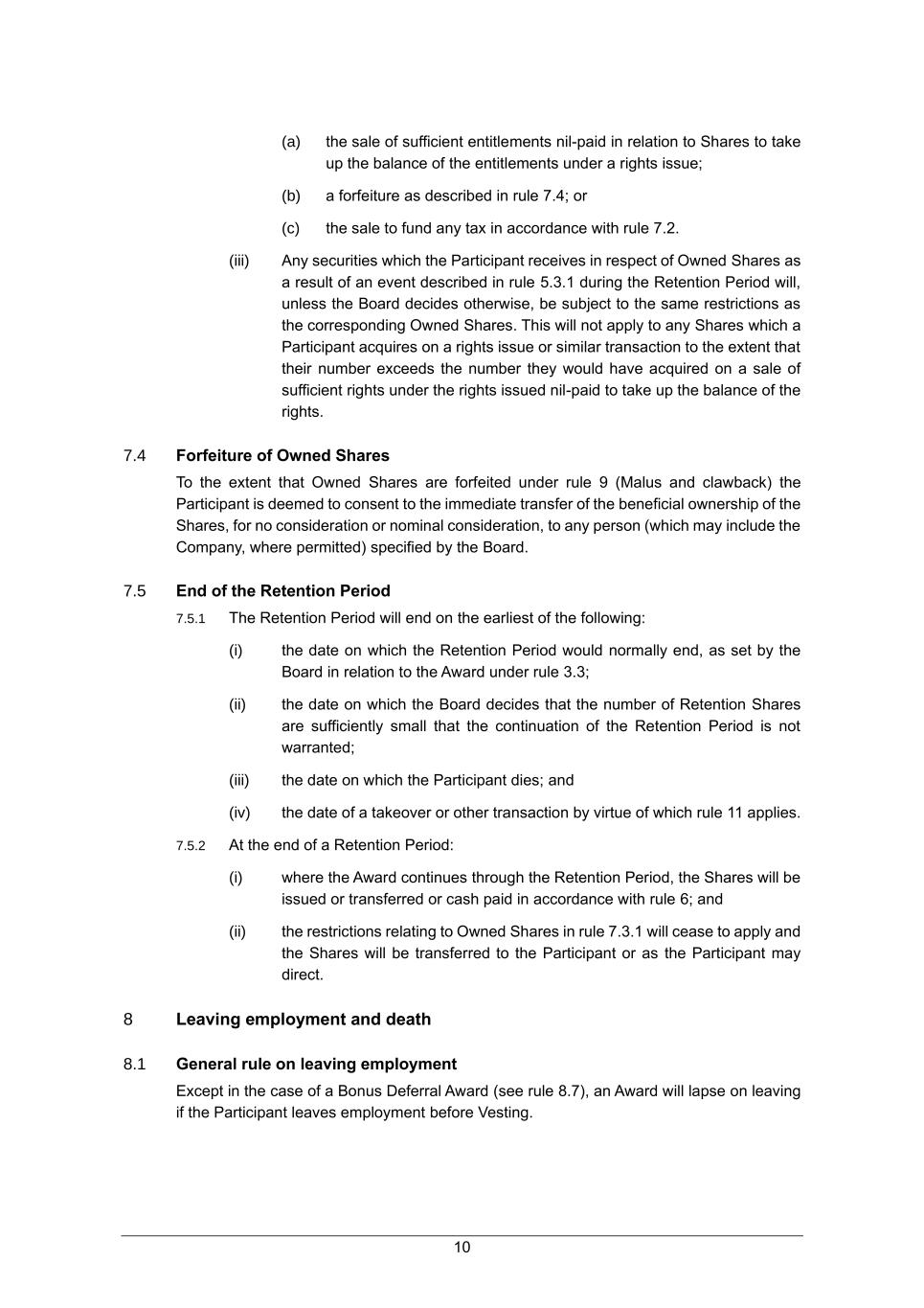 10 (a) the sale of sufficient entitlements nil-paid in relation to Shares to take up the balance of the entitlements under a rights issue; (b) a forfeiture as described in rule 7.4; or (c) the sale to fund any tax in accordance with rule 7.2. (iii) Any securities which the Participant receives in respect of Owned Shares as a result of an event described in rule 5.3.1 during the Retention Period will, unless the Board decides otherwise, be subject to the same restrictions as the corresponding Owned Shares. This will not apply to any Shares which a Participant acquires on a rights issue or similar transaction to the extent that their number exceeds the number they would have acquired on a sale of sufficient rights under the rights issued nil-paid to take up the balance of the rights. 7.4 Forfeiture of Owned Shares To the extent that Owned Shares are forfeited under rule 9 (Malus and clawback) the Participant is deemed to consent to the immediate transfer of the beneficial ownership of the Shares, for no consideration or nominal consideration, to any person (which may include the Company, where permitted) specified by the Board. 7.5 End of the Retention Period 7.5.1 The Retention Period will end on the earliest of the following: (i) the date on which the Retention Period would normally end, as set by the Board in relation to the Award under rule 3.3; (ii) the date on which the Board decides that the number of Retention Shares are sufficiently small that the continuation of the Retention Period is not warranted; (iii) the date on which the Participant dies; and (iv) the date of a takeover or other transaction by virtue of which rule 11 applies. 7.5.2 At the end of a Retention Period: (i) where the Award continues through the Retention Period, the Shares will be issued or transferred or cash paid in accordance with rule 6; and (ii) the restrictions relating to Owned Shares in rule 7.3.1 will cease to apply and the Shares will be transferred to the Participant or as the Participant may direct. 8 Leaving employment and death 8.1 General rule on leaving employment Except in the case of a Bonus Deferral Award (see rule 8.7), an Award will lapse on leaving if the Participant leaves employment before Vesting.