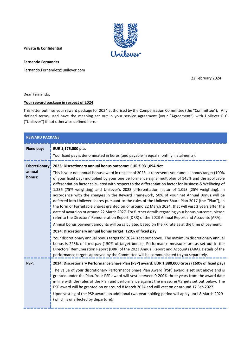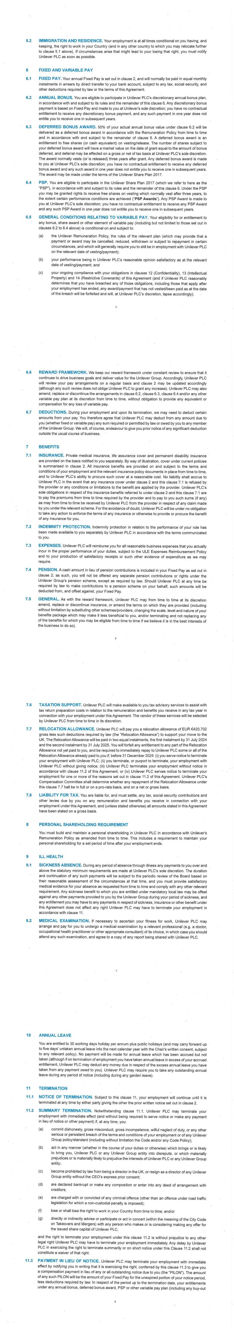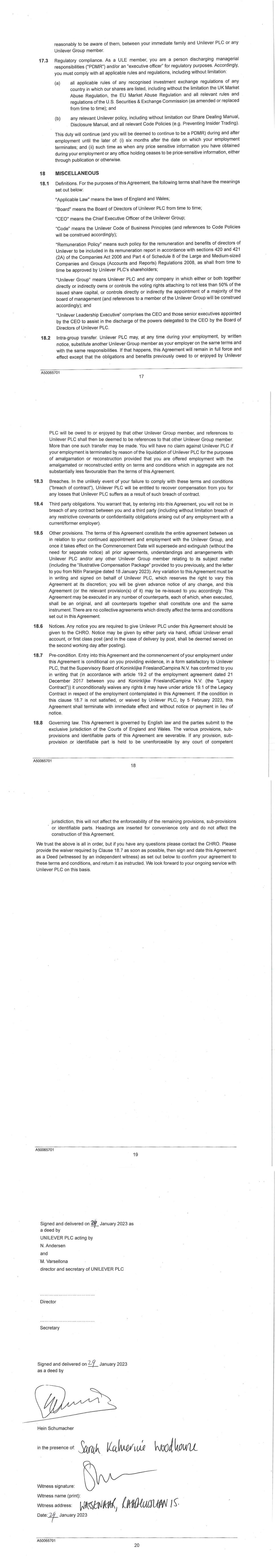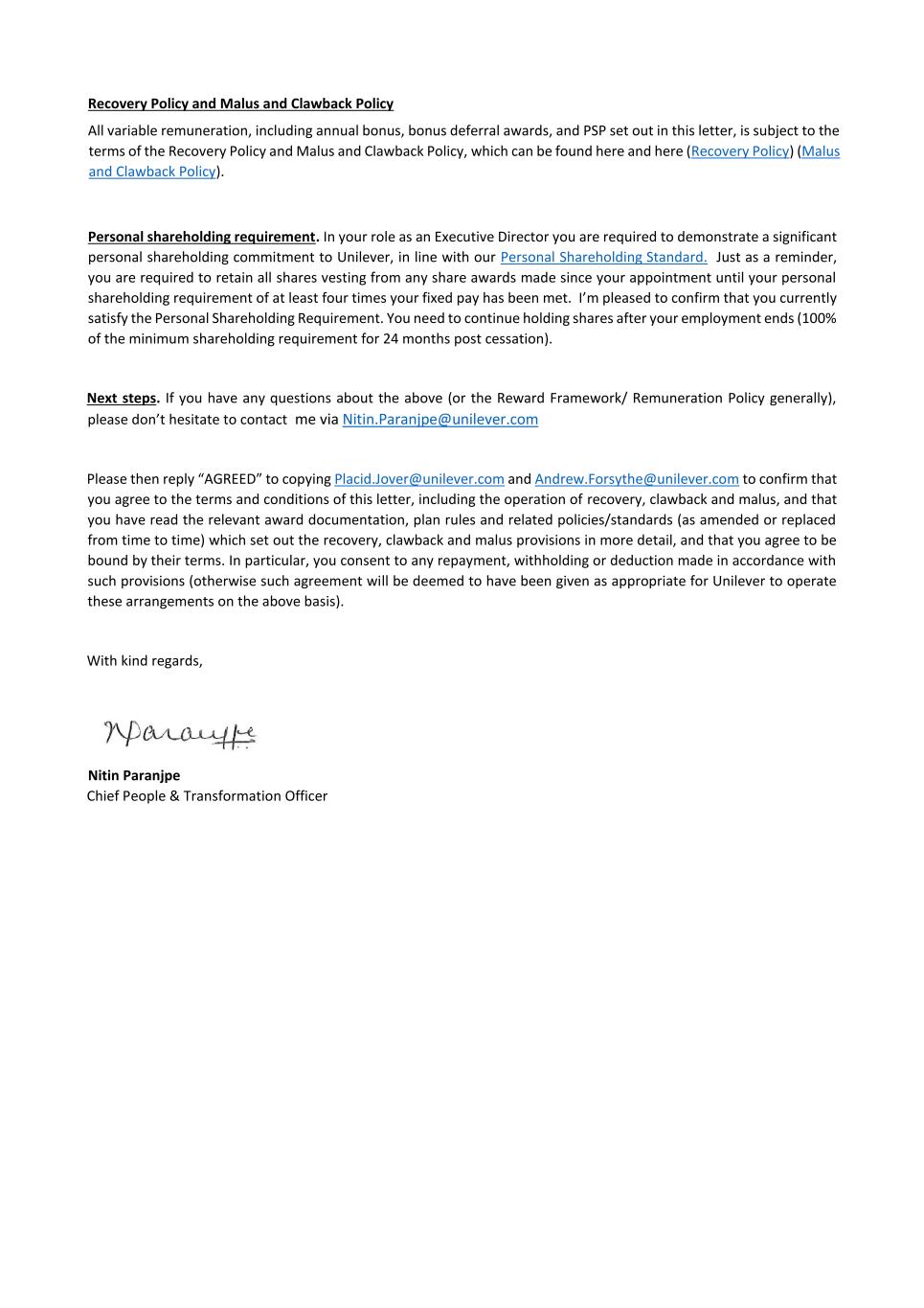 PSP AWARD AGREEMENT March 2024 • the grant of my Award does not form, affect or change my employment contract or my employment relationship with my employer. All benefits granted by the Award constitute an extraordinary payment and may not, in any way, be considered part of my normal remuneration. The benefits granted by my Award will not affect the calculation of pension rights or severance pay upon termination of my employment for any reason. • the Company’s decision to grant the Award is discretionary and I have no automatic right to participate in the Plan. Acceptance of the Award and participation in the Plan does not create any right to continued or future employment, future participation in the Plan or the grant of future awards. The Company may at any time decide to cease offering awards under the Plan. • I do not have any right to compensation or damages for any loss (actual or potential) in relation to the Plan or the Award. 16. Shareholding Policy I understand that it is a condition of my Award that I will comply with the shareholding requirements, including any post-employment shareholding requirements in the Unilever Personal Shareholding Requirement Policy. I confirm that I have reviewed the Unilever Shareholding Policy before accepting the Award. 17. Data Protection In addition to the information on data privacy provided in my employment agreement, I have also read and acknowledge the Unilever Share Plan Privacy Notice in relation to the holding and processing of personal data (including sensitive personal data) provided by me to any Member of the Group, trustee or third party service provider, for all purposes relating to the operation of the Plan and for compliance with applicable procedures, laws and regulations. 18. Insider Trading Restrictions I may be subject to insider trading restrictions and/or market abuse laws, which may affect my ability to acquire or sell Shares or rights to Shares under the Plan when I am considered to have restricted information regarding the Company (as defined under any applicable laws in my country). Any restrictions under these laws or regulations are separate from and in addition to any restrictions that may be imposed under the Share Dealing Manual or any applicable Company insider trading/share dealing policy. It is my responsibility to comply with any applicable restrictions. 19. Imposition of Other Requirements The Company may impose other requirements on my participation in the Plan or on any Shares issued under the Plan, if the Company determines it is necessary or advisable for legal or administrative reasons, and to require me to sign any additional agreements or documents that may be necessary to accomplish this. 20. Governance My participation in the Plan, the provisions of this Agreement and the Award are governed by, and subject to, English law and the English Courts have non-exclusive jurisdiction over any disputes that may arise. The Award and the terms of this Agreement are subject to the Plan rules. In the event of any inconsistency between the terms of this Agreement and the Plan, the terms of the Plan will prevail. The provisions of this Agreement are severable and if any one or more provisions are determined to be illegal or otherwise unenforceable, in whole or in part, the remaining provisions will nevertheless be binding and enforceable. IF YOU AGREE TO THE TERMS OF YOUR AWARD PLEASE FOLLOW THE DIRECTIONS IN YOUR AWARD EMAIL TO ACCEPT YOUR AWARD IN YOUR EQUATEPLUS/FIDELITY ACCOUNT AS APPLICABLE. IF YOU DO NOT DO SO WITHIN 2 MONTHS OF THE AWARD DATE, YOUR AWARD MAY LAPSE.