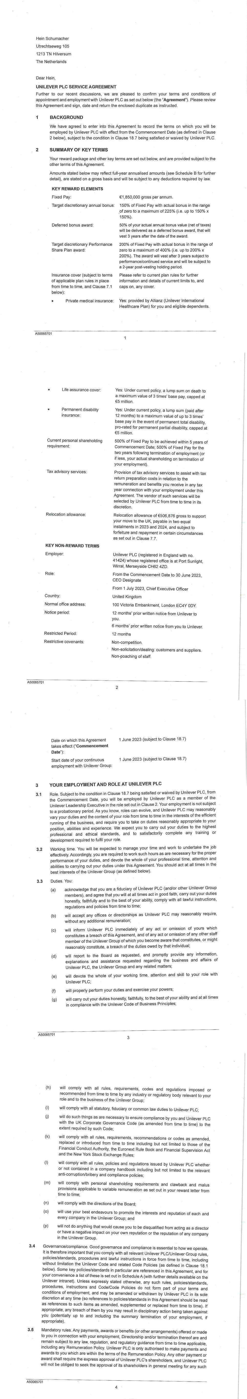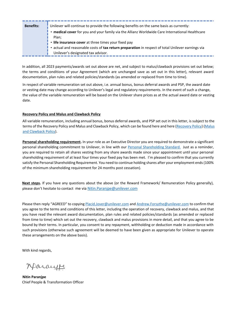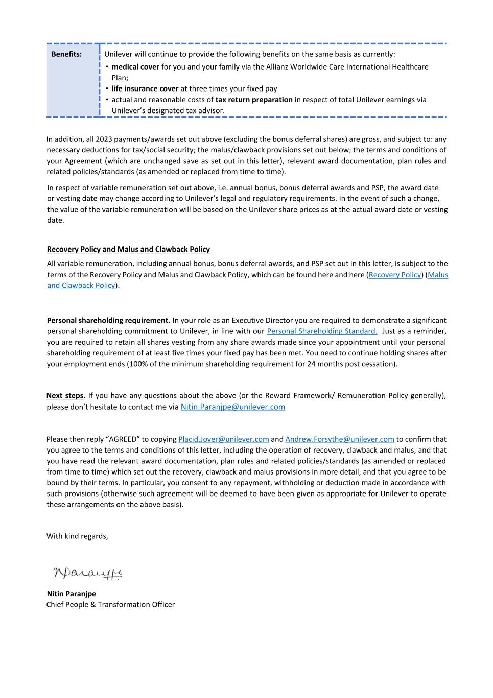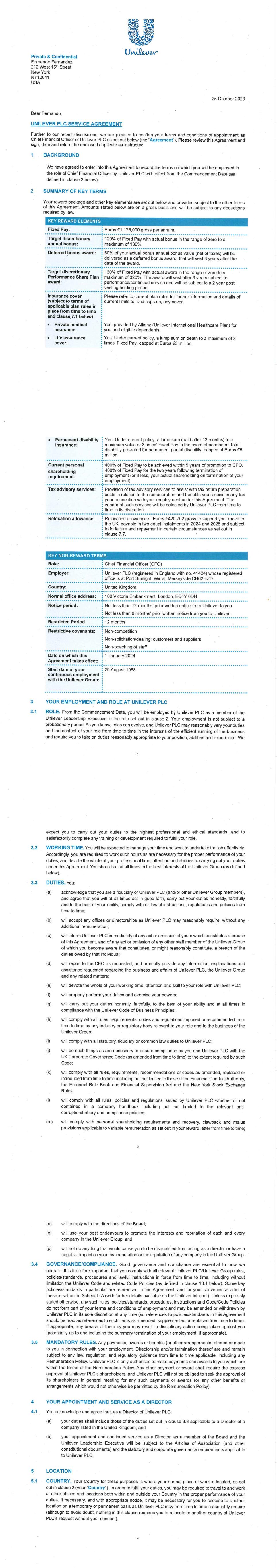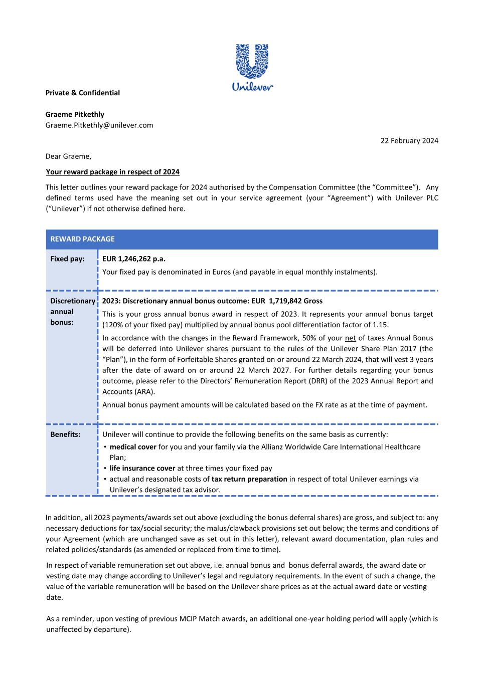 PSP AWARD AGREEMENT March 2024 • the grant of my Award does not form, affect or change my employment contract or my employment relationship with my employer. All benefits granted by the Award constitute an extraordinary payment and may not, in any way, be considered part of my normal remuneration. The benefits granted by my Award will not affect the calculation of pension rights or severance pay upon termination of my employment for any reason. • the Company’s decision to grant the Award is discretionary and I have no automatic right to participate in the Plan. Acceptance of the Award and participation in the Plan does not create any right to continued or future employment, future participation in the Plan or the grant of future awards. The Company may at any time decide to cease offering awards under the Plan. • I do not have any right to compensation or damages for any loss (actual or potential) in relation to the Plan or the Award. 16. Shareholding Policy I understand that it is a condition of my Award that I will comply with the shareholding requirements, including any post-employment shareholding requirements in the Unilever Personal Shareholding Requirement Policy. I confirm that I have reviewed the Unilever Shareholding Policy before accepting the Award. 17. Data Protection In addition to the information on data privacy provided in my employment agreement, I have also read and acknowledge the Unilever Share Plan Privacy Notice in relation to the holding and processing of personal data (including sensitive personal data) provided by me to any Member of the Group, trustee or third party service provider, for all purposes relating to the operation of the Plan and for compliance with applicable procedures, laws and regulations. 18. Insider Trading Restrictions I may be subject to insider trading restrictions and/or market abuse laws, which may affect my ability to acquire or sell Shares or rights to Shares under the Plan when I am considered to have restricted information regarding the Company (as defined under any applicable laws in my country). Any restrictions under these laws or regulations are separate from and in addition to any restrictions that may be imposed under the Share Dealing Manual or any applicable Company insider trading/share dealing policy. It is my responsibility to comply with any applicable restrictions. 19. Imposition of Other Requirements The Company may impose other requirements on my participation in the Plan or on any Shares issued under the Plan, if the Company determines it is necessary or advisable for legal or administrative reasons, and to require me to sign any additional agreements or documents that may be necessary to accomplish this. 20. Governance My participation in the Plan, the provisions of this Agreement and the Award are governed by, and subject to, English law and the English Courts have non-exclusive jurisdiction over any disputes that may arise. The Award and the terms of this Agreement are subject to the Plan rules. In the event of any inconsistency between the terms of this Agreement and the Plan, the terms of the Plan will prevail. The provisions of this Agreement are severable and if any one or more provisions are determined to be illegal or otherwise unenforceable, in whole or in part, the remaining provisions will nevertheless be binding and enforceable. IF YOU AGREE TO THE TERMS OF YOUR AWARD PLEASE FOLLOW THE DIRECTIONS IN YOUR AWARD EMAIL TO ACCEPT YOUR AWARD IN YOUR EQUATEPLUS/FIDELITY ACCOUNT AS APPLICABLE. IF YOU DO NOT DO SO WITHIN 2 MONTHS OF THE AWARD DATE, YOUR AWARD MAY LAPSE.