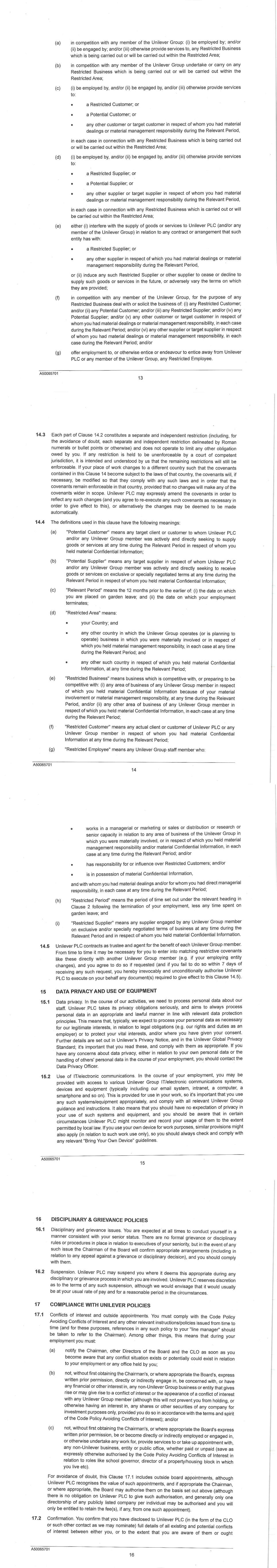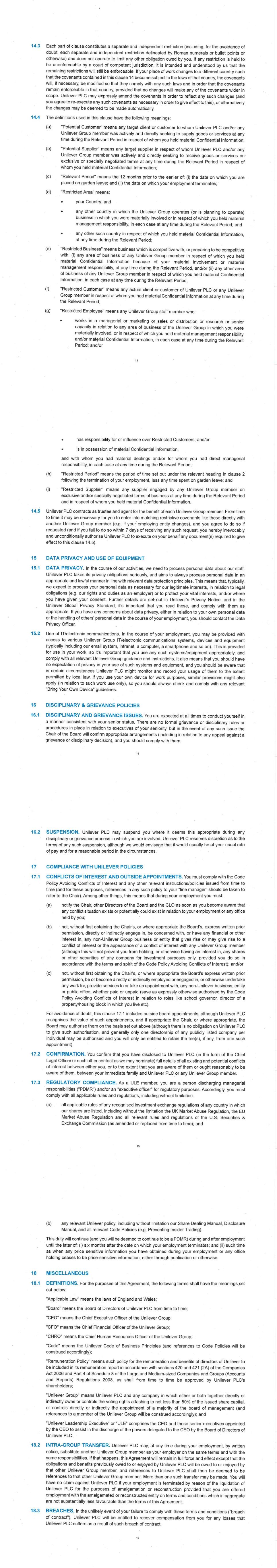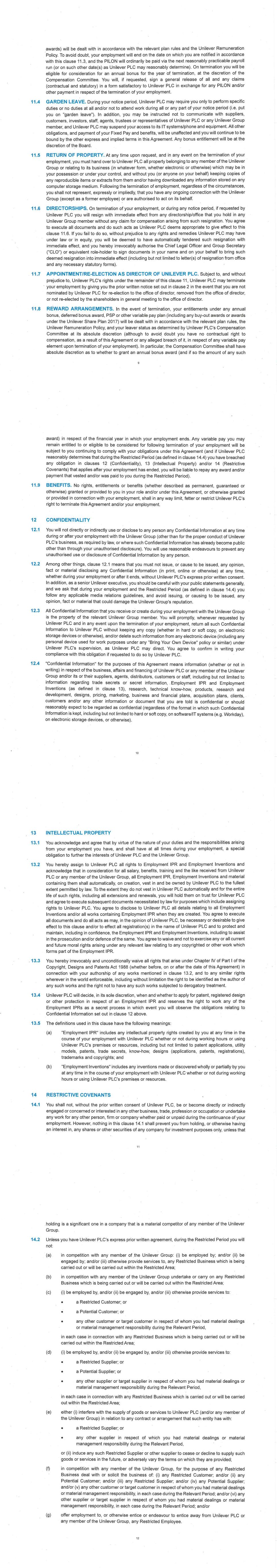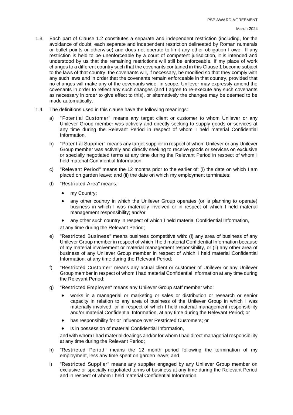 PSP AWARD AGREEMENT March 2024 1.3. Each part of Clause 1.2 constitutes a separate and independent restriction (including, for the avoidance of doubt, each separate and independent restriction delineated by Roman numerals or bullet points or otherwise) and does not operate to limit any other obligation I owe. If any restriction is held to be unenforceable by a court of competent jurisdiction, it is intended and understood by us that the remaining restrictions will still be enforceable. If my place of work changes to a different country such that the covenants contained in this Clause 1 become subject to the laws of that country, the covenants will, if necessary, be modified so that they comply with any such laws and in order that the covenants remain enforceable in that country, provided that no changes will make any of the covenants wider in scope. Unilever may expressly amend the covenants in order to reflect any such changes (and I agree to re-execute any such covenants as necessary in order to give effect to this), or alternatively the changes may be deemed to be made automatically. 1.4. The definitions used in this clause have the following meanings: a) "Potential Customer" means any target client or customer to whom Unilever or any Unilever Group member was actively and directly seeking to supply goods or services at any time during the Relevant Period in respect of whom I held material Confidential Information. b) "Potential Supplier" means any target supplier in respect of whom Unilever or any Unilever Group member was actively and directly seeking to receive goods or services on exclusive or specially negotiated terms at any time during the Relevant Period in respect of whom I held material Confidential Information. c) "Relevant Period" means the 12 months prior to the earlier of: (i) the date on which I am placed on garden leave; and (ii) the date on which my employment terminates; d) "Restricted Area" means: • my Country; • any other country in which the Unilever Group operates (or is planning to operate) business in which I was materially involved or in respect of which I held material management responsibility; and/or • any other such country in respect of which I held material Confidential Information, at any time during the Relevant Period; e) "Restricted Business" means business competitive with: (i) any area of business of any Unilever Group member in respect of which I held material Confidential Information because of my material involvement or material management responsibility, or (ii) any other area of business of any Unilever Group member in respect of which I held material Confidential Information, at any time during the Relevant Period; f) "Restricted Customer" means any actual client or customer of Unilever or any Unilever Group member in respect of whom I had material Confidential Information at any time during the Relevant Period; g) "Restricted Employee" means any Unilever Group staff member who: • works in a managerial or marketing or sales or distribution or research or senior capacity in relation to any area of business of the Unilever Group in which I was materially involved, or in respect of which I held material management responsibility and/or material Confidential Information, at any time during the Relevant Period; or • has responsibility for or influence over Restricted Customers; or • is in possession of material Confidential Information, and with whom I had material dealings and/or for whom I had direct managerial responsibility at any time during the Relevant Period; h) "Restricted Period" means the 12 month period following the termination of my employment, less any time spent on garden leave; and i) "Restricted Supplier" means any supplier engaged by any Unilever Group member on exclusive or specially negotiated terms of business at any time during the Relevant Period and in respect of whom I held material Confidential Information.