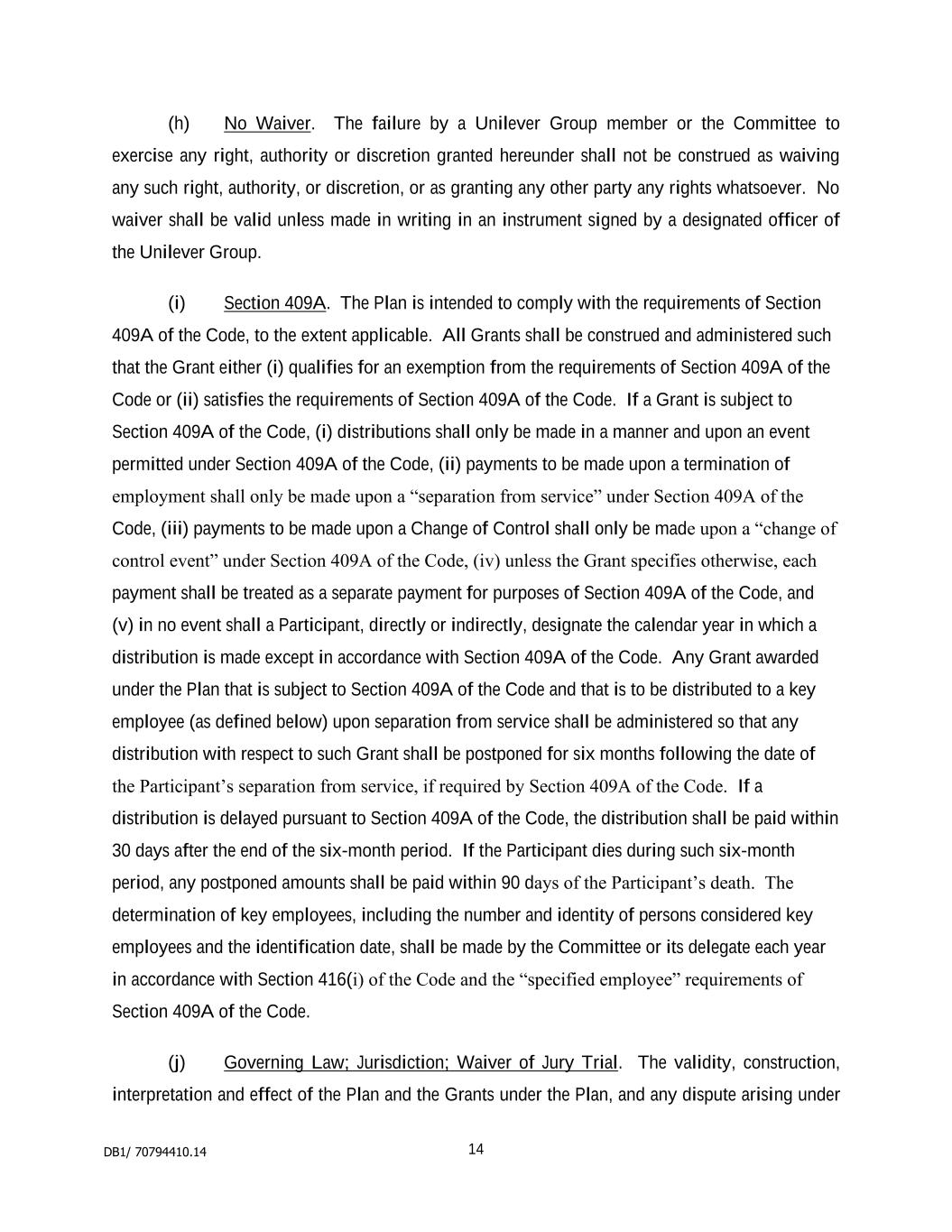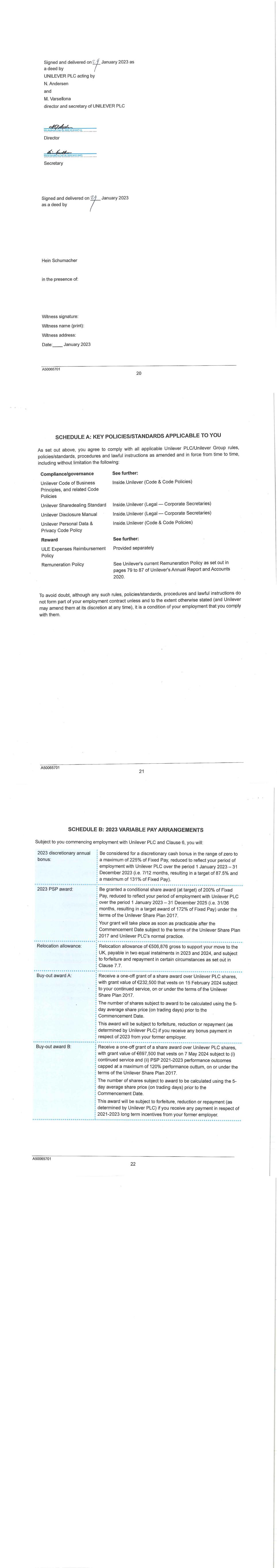 PSP AWARD AGREEMENT March 2024 legislation enacted in connection with the UK’s exit from the European Union). The total maximum number of shares which are the subject of this offer is 2,500,000. UNITED STATES, CANADA AND PUERTO RICO The following additional terms shall apply to the Award if you are employed in, or your home country is, the United States, Canada or Puerto Rico, notwithstanding anything in the Employee Guide or Award Agreement to the contrary: 1. Unilever North America Omnibus Equity Compensation Plan and Prospectus. If you are employed in, or your home country is, the United States, Canada or Puerto Rico at the date of grant of the Award, your Award is granted under the Unilever North America Omnibus Equity Compensation Plan (“Omnibus Plan”), which is a subplan of the Plan. A prospectus for the Omnibus Plan is available on the Executive Share Schemes page on SharePoint, which you should review in connection with the Award. All terms of the Omnibus Plan are incorporated into this Agreement by this reference. Awards may be made in Shares of PLC GBP, or in PLC ADSs. 2. Restrictive Covenants. As a condition of the Award, you must agree to comply with the confidentiality, non-competition and non-solicitation covenants and other agreements set forth in Schedule 2 of this Agreement and in any other written agreement with a member of the Group. Your Award may lapse, in whole or in part, and Unilever may pursue other remedies, if you do not comply with these covenants and agreements. 3. Payment of Award. If the Award becomes payable in whole or in part, the Award will be paid in the calendar year in which the Vesting Date occurs, as soon as reasonably practicable after the Vesting Date. However, in the case of death, any portion of the Award that vests upon death will be paid within 90 days of the date of death. An Award that is subject to section 409A of the United States Internal Revenue Code (applicable to United States taxpayers) may not be paid before the Vesting Date, except in the case of death. 4. Termination of Employment. For purposes of the Award, the following terms have the meanings set forth below: (a) The term “Redundancy” means an involuntary termination by your employer without Cause if you sign and do not revoke a written waiver and release of liability provided by your employer. (b) The term “Cause” will include, but is not limited to (i) gross misconduct or gross negligence in the performance of your material duties and responsibilities to your employer, (ii) the commission of a theft, embezzlement or other serious and substantial crime, (iii) wilful violation of the provisions of any confidentiality, non-competition agreement or non-solicitation covenants (or similar covenants) in effect between you and any member of the Group, (iv) a material breach of Unilever’s Code of Business Principles or any of the Code Policies, (v) conduct that results in significant losses or serious reputational damage to any member of the Group, or (vi) other deliberate willful action that is materially harmful to the business, interests, or reputation of any member of the Group. 5. US Taxpayers subject to section 409A. The rules in this paragraph 5 apply to any Award that is subject to section 409A of the United States Internal Revenue Code (applicable to United States taxpayers), notwithstanding anything in the Award Agreement or the Employee Guide to the contrary. If the Award is subject to section 409A and any provision of the Award would violate section 409A, that provision shall be void and of no effect. If the Award is subject to section 409A, (i) no distributions shall be made except upon a specified date, upon a “separation from service,” upon death, or upon a “change in control event” as defined in the regulations under section 409A, or otherwise in accordance with section 409A, (ii) a distribution upon termination of employment shall only be made upon your “separation from service” as defined under section 409A, and subject to the six-month delay for specified