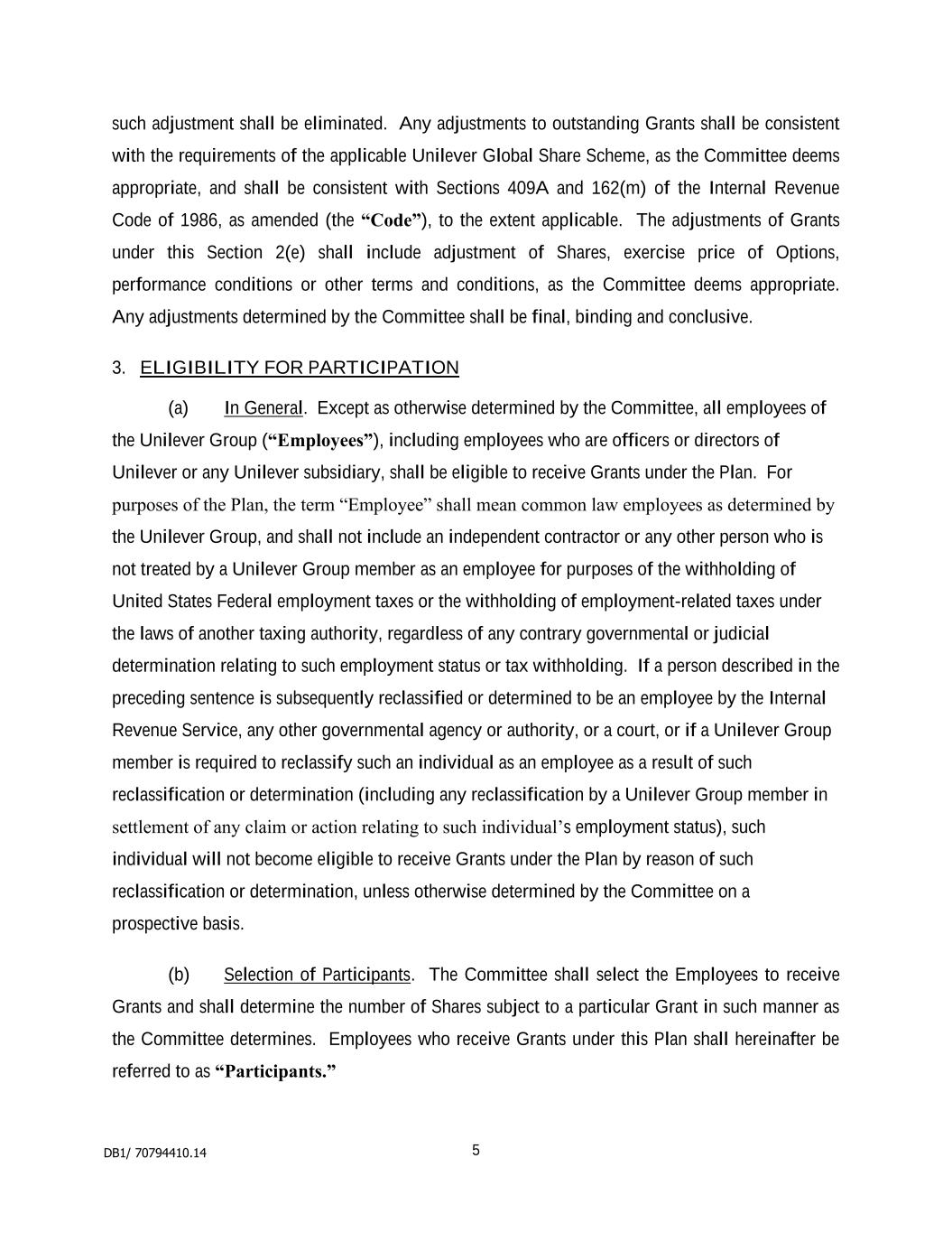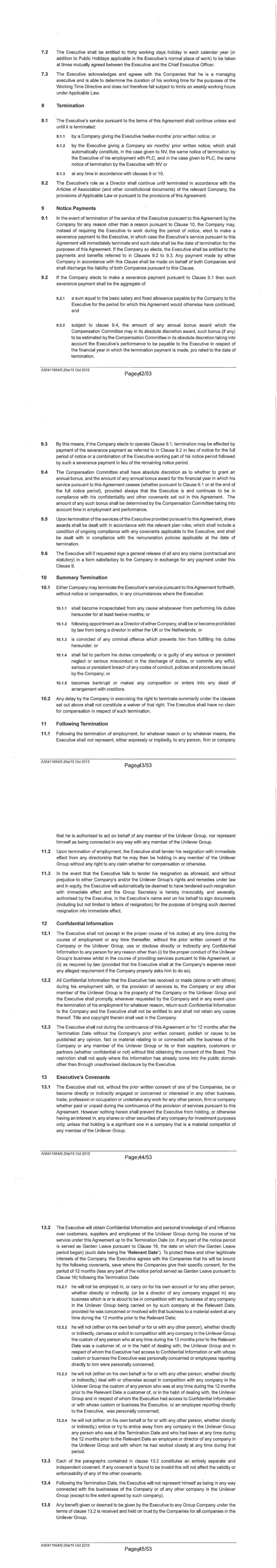 Rules of the Management Co-Investment Plan – 12 May 2010 2 “Listing Rules ” means the rules relating to admission to the Official List; “London Stock Exchange ” means the London Stock Exchange plc; “Matching Ratio ” means the ratio which the number of Shares subject to an Award bears to the number of Investment Shares acquired for or on behalf of a Participant and will be set by the Grantor under rule 2.2 (Terms of Invitation); “Model Code ” means the Model Code on dealings in securities set out in Listing Rule 9, annex 1 (of the London Stock Exchange), as varied from time to time; “NV” means Unilever NV; “Official List ” means the list maintained by the Financial Services Authority for the purposes of Section 74(1) of the Financial Services and Markets Act 2000; “Participant ” means a person holding an Award or his personal representatives; “Performance Condition ” means any performance condition imposed under rule 3.6 (Performance Conditions); “Performance Period ” means the period in respect of which a Performance Condition is to be satisfied; “Plan ” means these rules known as “The Management Co-Investment Plan”, as changed from time to time; “PLC” means Unilever PLC; “RemCo ” means the Remuneration Committee of the Board; “Shares ” means fully paid ordinary shares in NV or PLC and includes: (i) depositary receipts representing ordinary shares in NV listed on Euronext; and (ii) any Shares representing NV and/or PLC Shares following a reconstruction; “Subsidiary ” means a body corporate which is a subsidiary of NV within the meaning of 24a Book 2 (Civil Code) or company which is a subsidiary of the PLC within the meaning of Section 1159 of the Companies Act 2006; “Vesting ” means a Participant becomes entitled to have the Shares subject to an Award transferred to him subject to these rules; and “Vesting Period ” means the period from the Award Date to the date of Vesting set by the Board on the grant of the Award. 2 Invitations 2.1 Eligibility The Grantor may invite any Employee to participate in the Plan in accordance with any selection criteria that the Board in its discretion may set. However, unless the Board considers that special circumstances exist, the Grantor will not invite an Employee who on the date of invitation has given or received notice of termination of employment, whether or not such termination is lawful.