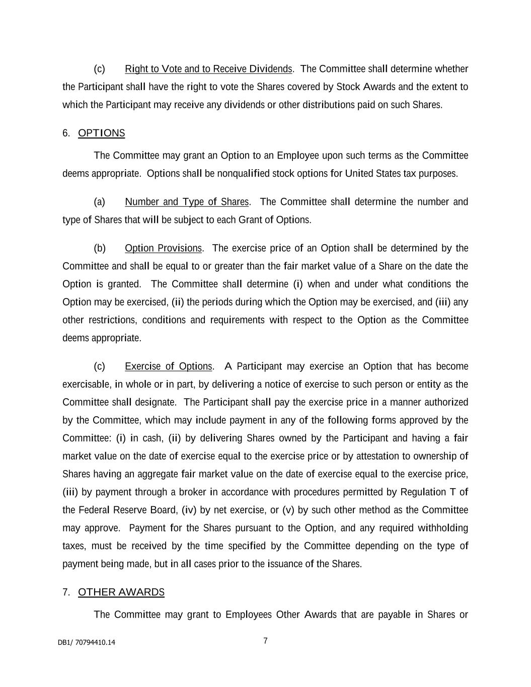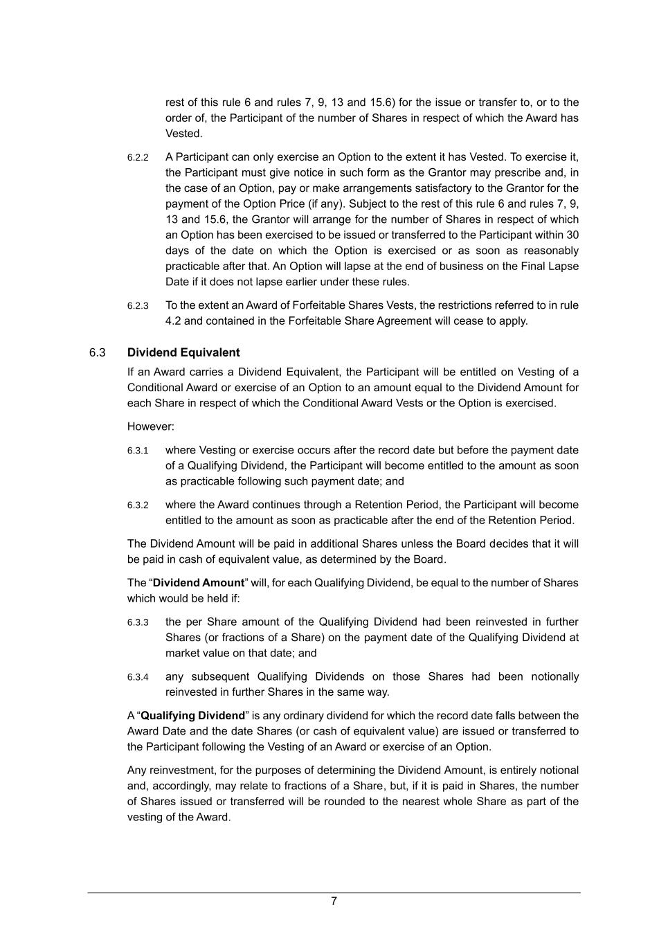 7 rest of this rule 6 and rules 7, 9, 13 and 15.6) for the issue or transfer to, or to the order of, the Participant of the number of Shares in respect of which the Award has Vested. 6.2.2 A Participant can only exercise an Option to the extent it has Vested. To exercise it, the Participant must give notice in such form as the Grantor may prescribe and, in the case of an Option, pay or make arrangements satisfactory to the Grantor for the payment of the Option Price (if any). Subject to the rest of this rule 6 and rules 7, 9, 13 and 15.6, the Grantor will arrange for the number of Shares in respect of which an Option has been exercised to be issued or transferred to the Participant within 30 days of the date on which the Option is exercised or as soon as reasonably practicable after that. An Option will lapse at the end of business on the Final Lapse Date if it does not lapse earlier under these rules. 6.2.3 To the extent an Award of Forfeitable Shares Vests, the restrictions referred to in rule 4.2 and contained in the Forfeitable Share Agreement will cease to apply. 6.3 Dividend Equivalent If an Award carries a Dividend Equivalent, the Participant will be entitled on Vesting of a Conditional Award or exercise of an Option to an amount equal to the Dividend Amount for each Share in respect of which the Conditional Award Vests or the Option is exercised. However: 6.3.1 where Vesting or exercise occurs after the record date but before the payment date of a Qualifying Dividend, the Participant will become entitled to the amount as soon as practicable following such payment date; and 6.3.2 where the Award continues through a Retention Period, the Participant will become entitled to the amount as soon as practicable after the end of the Retention Period. The Dividend Amount will be paid in additional Shares unless the Board decides that it will be paid in cash of equivalent value, as determined by the Board. The “Dividend Amount” will, for each Qualifying Dividend, be equal to the number of Shares which would be held if: 6.3.3 the per Share amount of the Qualifying Dividend had been reinvested in further Shares (or fractions of a Share) on the payment date of the Qualifying Dividend at market value on that date; and 6.3.4 any subsequent Qualifying Dividends on those Shares had been notionally reinvested in further Shares in the same way. A “Qualifying Dividend” is any ordinary dividend for which the record date falls between the Award Date and the date Shares (or cash of equivalent value) are issued or transferred to the Participant following the Vesting of an Award or exercise of an Option. Any reinvestment, for the purposes of determining the Dividend Amount, is entirely notional and, accordingly, may relate to fractions of a Share, but, if it is paid in Shares, the number of Shares issued or transferred will be rounded to the nearest whole Share as part of the vesting of the Award.