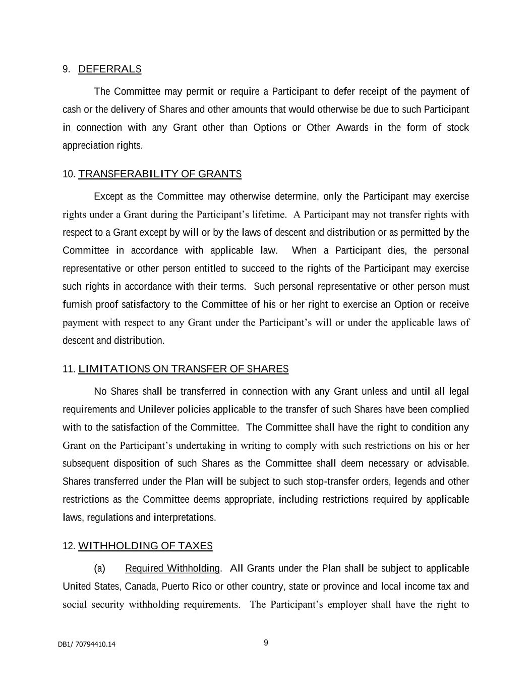 2.2 An Award may only be granted under the Plan:- (a) within the period of 6 weeks beginning with the date on which the Plan is adopted by NV and PLC or with the dealing day next following the date on which NV and PLC announce results for any period, or at any other time when the circumstances are considered by the Board to be sufficiently exceptional to justify the grant thereof; and (b) within the period of 10 years beginning with the date on which the Company adopts the Plan. 2.3 There shall be no, or no more than a nominal, monetary consideration for the grant of any Award under the Plan. 2.4 The grant of any Award under the Plan shall be subject to obtaining any approval or consent required as a result of NV shares or depository receipts thereof and PLC shares being listed on Euronext, the London Stock Exchange or any other stock exchange. 2.5 An Award granted under the Plan to any director or employee shall not, except in the case of death as provided in sub-rule 4.3 below, be capable of being transferred by him and shall lapse forthwith if it is so transferred or if he is adjudged bankrupt. 2.6 An Award shall not be granted to any director or employee in the last twelve months before reaching the age at which he is bound to retire in accordance with the terms of his contract of employment. Unilever TSR - LTIP 2 9 May 2001 3. LIMITS 3.1 Subject to sub-rules 3.2 and 3.3 below, the Board may issue shares to satisfy Awards. 3.2 No Awards shall be granted in any year which would, at the time they are granted, cause the number of shares in NV or PLC which shall have been or may be issued in pursuance of Awards granted in the period of 10 calendar years ending with that year under this Plan or under any other employees' share plan adopted by NV or PLC respectively to exceed such number as represents 10 per cent. of the ordinary share capital of NV or PLC respectively in issue at that time. 3.3 No Awards shall be granted in any year which would, at the time they are granted, cause the number of shares in NV or PLC which shall have been or may be issued in pursuance of Awards granted in the period of 10 calendar years ending with that year under this Plan or under any other executive share option plan adopted by NV or PLC respectively to exceed such number as represents 5 per cent of the ordinary share capital of NV or PLC respectively in issue at that time. 4. VESTING OF AWARDS 4.1 The vesting of any Award granted under the Plan shall be effected in such form and manner as the Board may from time to time prescribe. 4.2.1 Subject to sub-rules 4.3, 4.6 and 4.7 below and to Rule 5 below an Award granted under the Plan shall only vest on the Vesting Date if the Vesting Condition is satisfied at the Vesting Date. 4.2.2 The percentage of Shares which are acquired at the vesting of the Award shall be determined in accordance with the calculation of the performance condition specified in the Schedule to the Rules. 4.3.1 If a Participant dies before the Vesting Date and at a time when he is a director or employee of a Participating Company, the Award shall vest on the later of either the date of his death or the first