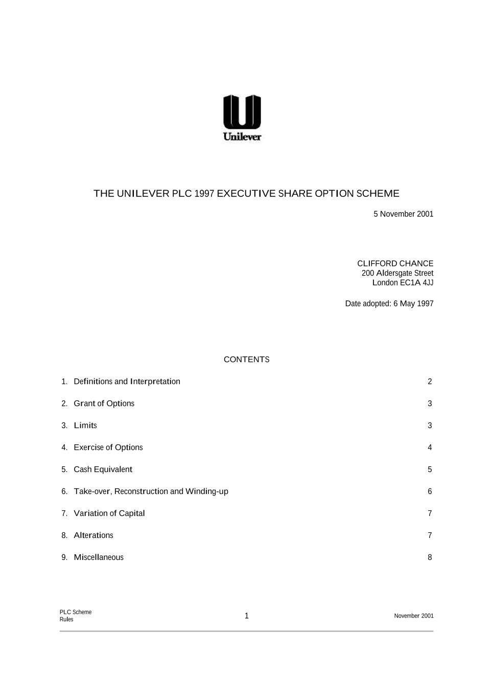 THE UNILEVER PLC 1997 EXECUTIVE SHARE OPTION SCHEME 5 November 2001 CLIFFORD CHANCE 200 Aldersgate Street London EC1A 4JJ Date adopted: 6 May 1997 CONTENTS 1. Definitions and Interpretation 2 2. Grant of Options 3 3. Limits 3 4. Exercise of Options 4 5. Cash Equivalent 5 6. Take-over, Reconstruction and Winding-up 6 7. Variation of Capital 7 8. Alterations 7 9. Miscellaneous 8 PLC Scheme Rules 1 November 2001
